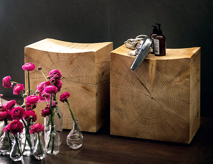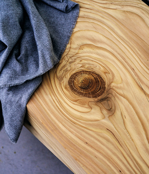 Бревна распиливаются на современном оборудовании, что позволяет получать элементы точной формы. При изготовлении мебели из кедра поперечные разрезы используются для изготовления табуретов и журнальных столиков, а продольные разрезы - для скамеек. С другой стороны, более мелкие предметы мебели создаются путем повторного использования производственных отходов, извлекая отходы из более крупной мебели, что позволяет свести отходы к минимуму.