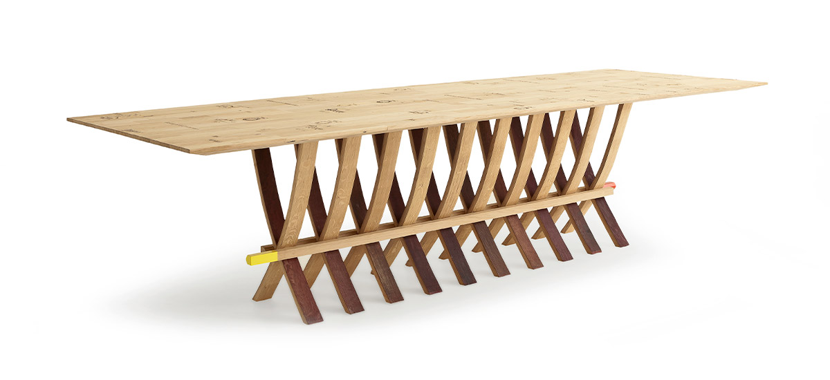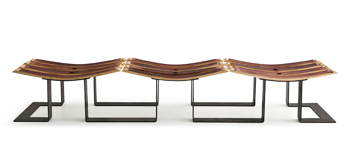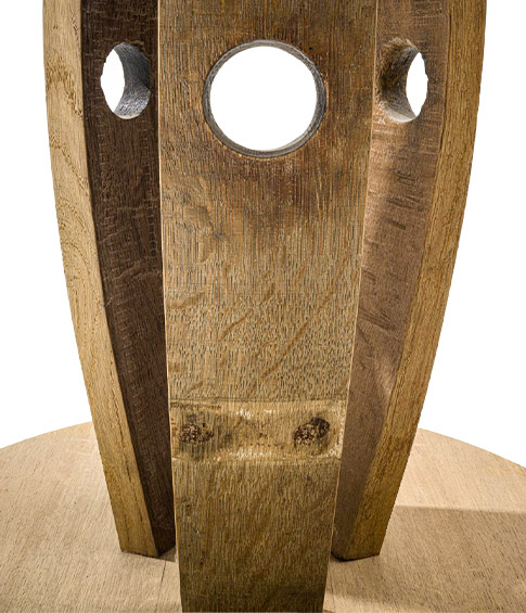 Древесина бочек, изначально использовавшаяся для выдержки вина, подвергается естественной обработке, что делает ее еще более завораживающей и ценной. После трех урожаев, если не принять меры по восстановлению, эти бочки будут подлежать уничтожению. Каждая планка несет на себе следы времени и хранившегося в ней вина, что делает каждый элемент уникальным с точки зрения текстуры, форм и хроматических нюансов.