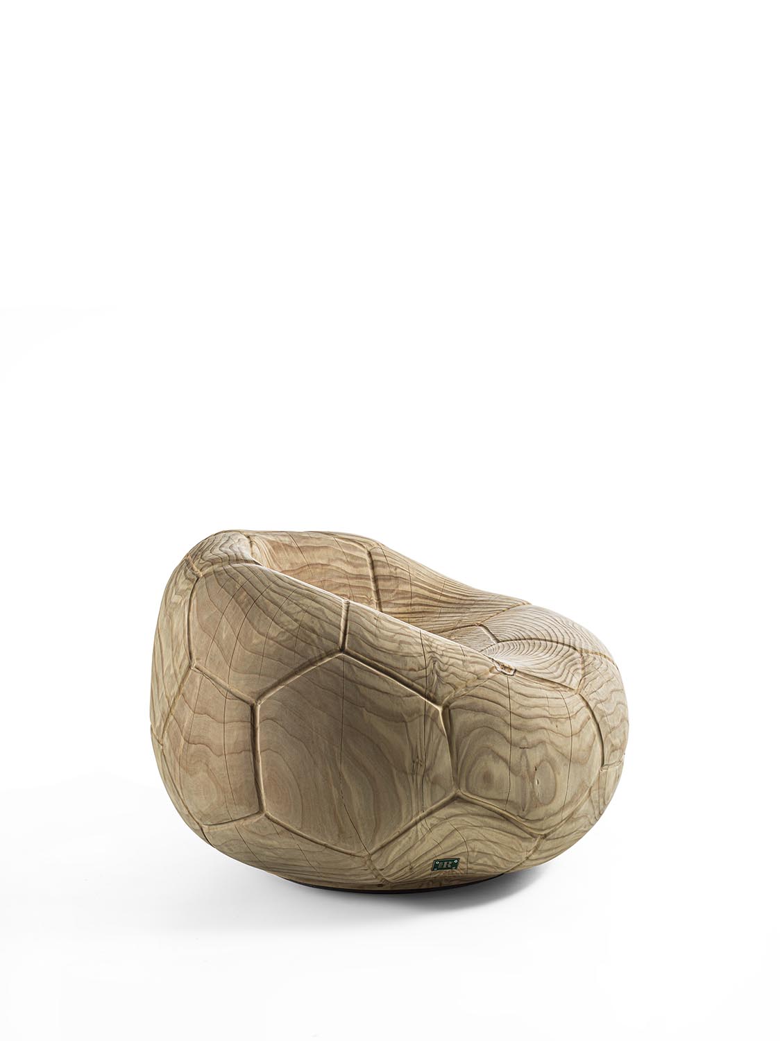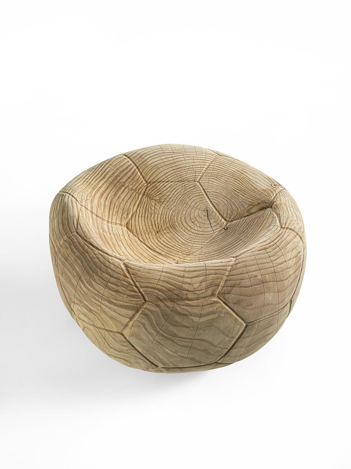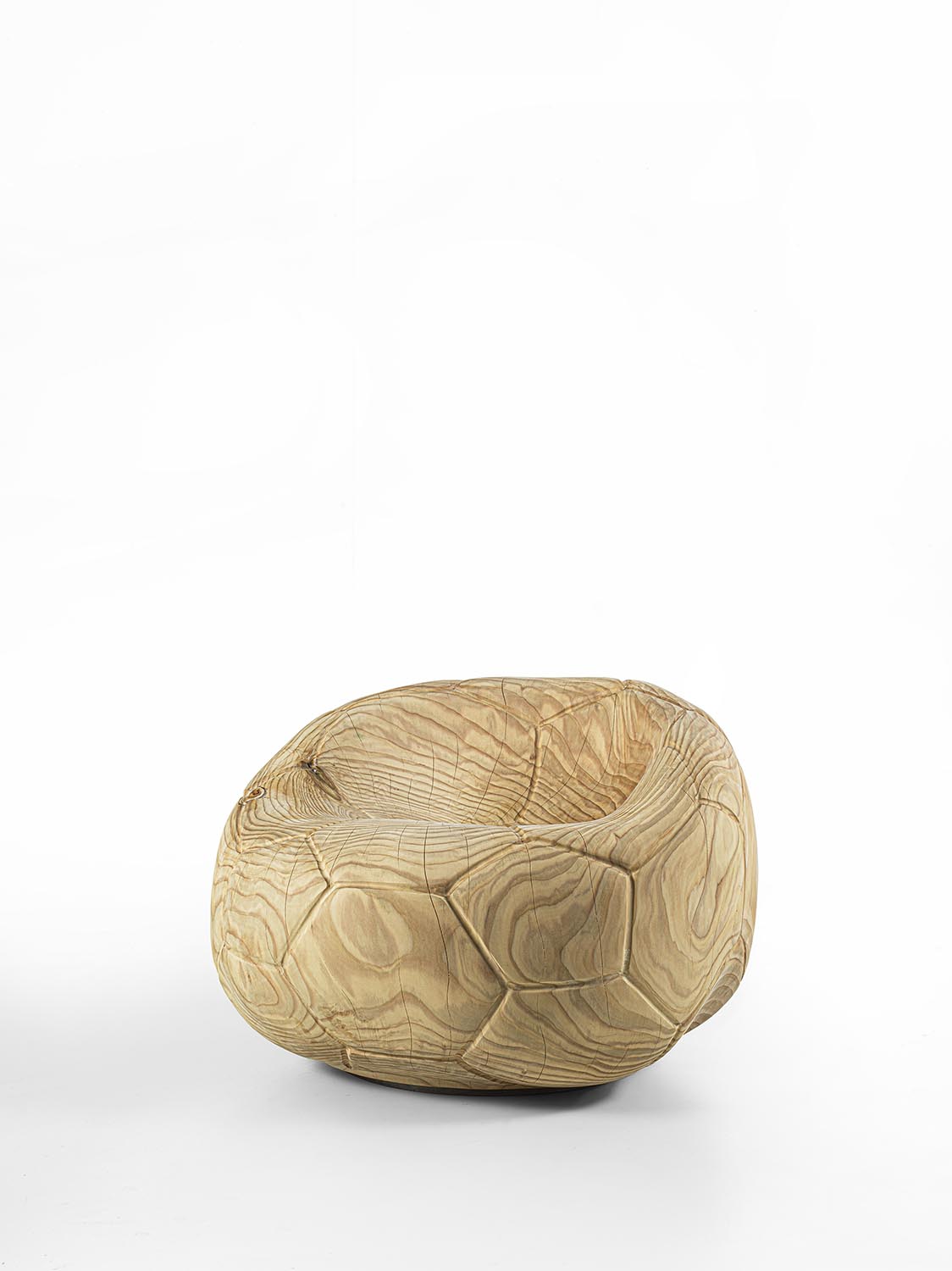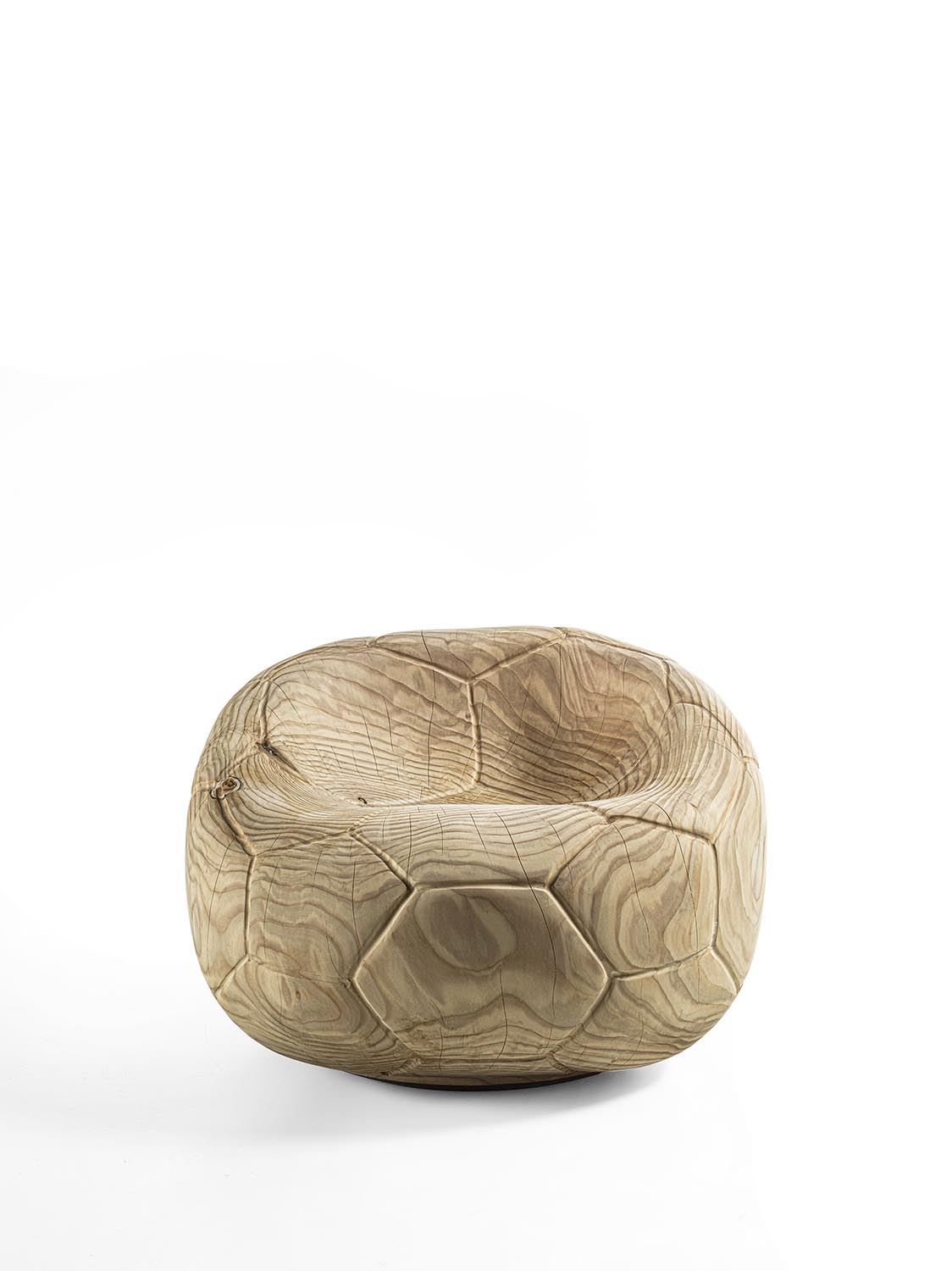 Поворотное кресло из массива ароматного кедра, вырезанное из цельного блока. Этот скульптурный монолит с извилистым, изогнутым дизайном напоминает форму спущенного футбольного мяча, повторяя характерный шестиугольный узор. Эргономичное сиденье плавно переходит в спинку, сочетая комфорт и строгую целостность.