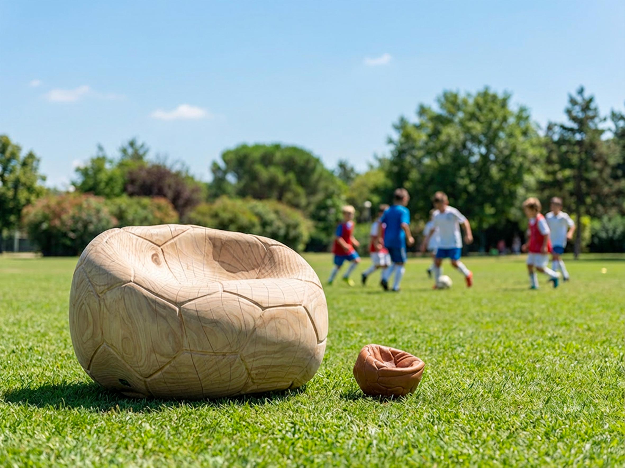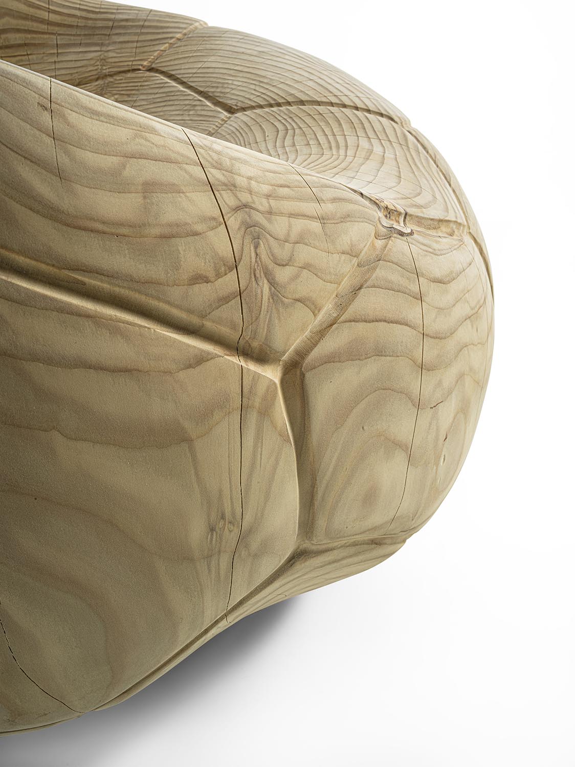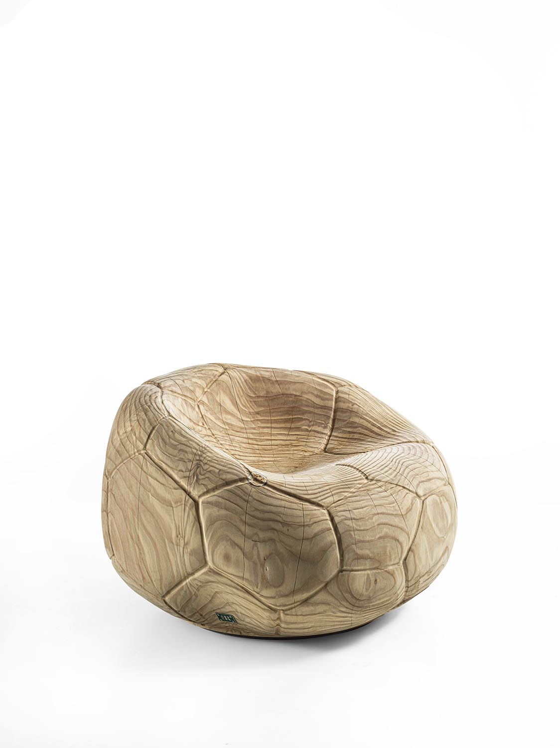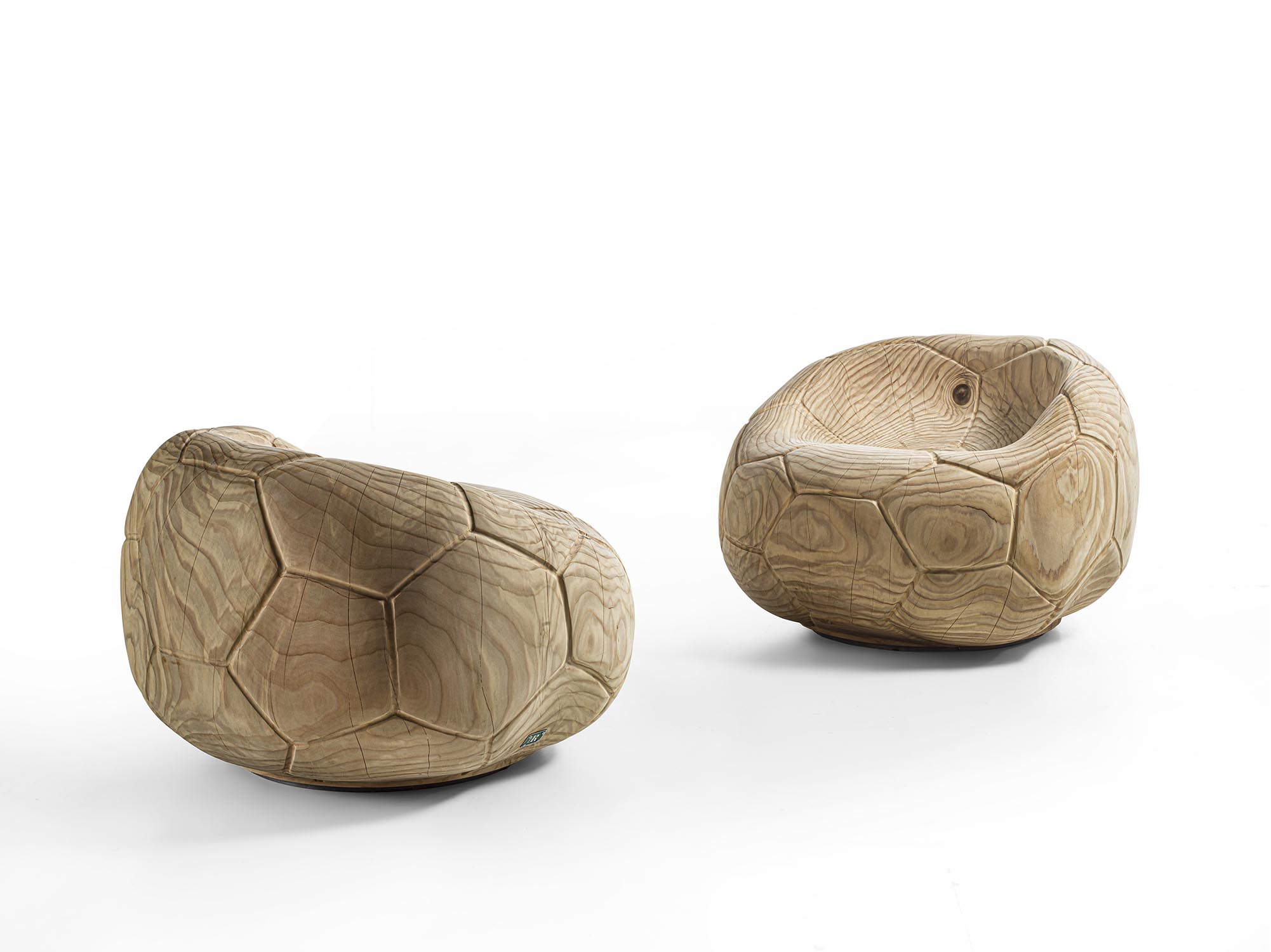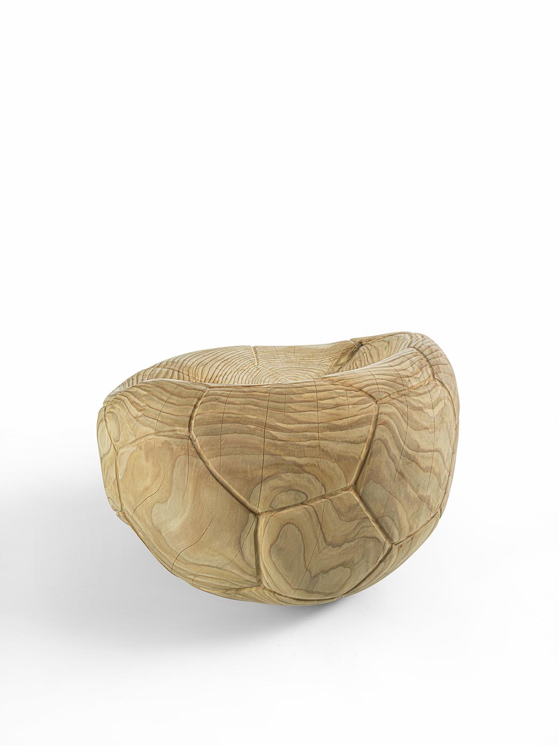 Поворотное кресло из массива ароматного кедра, вырезанное из цельного блока. Этот скульптурный монолит с извилистым, изогнутым дизайном напоминает форму спущенного футбольного мяча, повторяя характерный шестиугольный узор. Эргономичное сиденье плавно переходит в спинку, сочетая комфорт и строгую целостность.