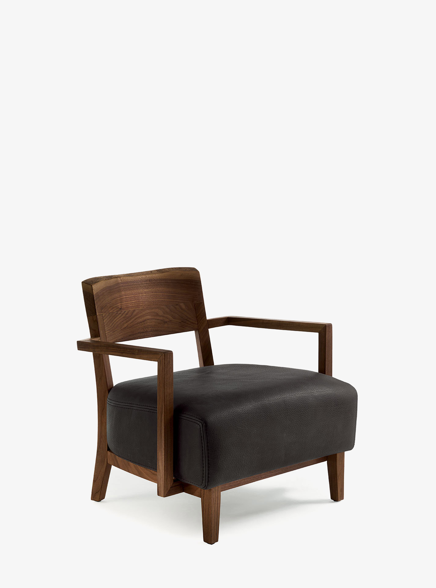 Кресло со структурой из массива дерева, со спинкой с натуральным краем и удобным мягким сиденьем, обтянутым кожей или тканью с видимой строчкой. Доступен в версии с подлокотниками или без них.