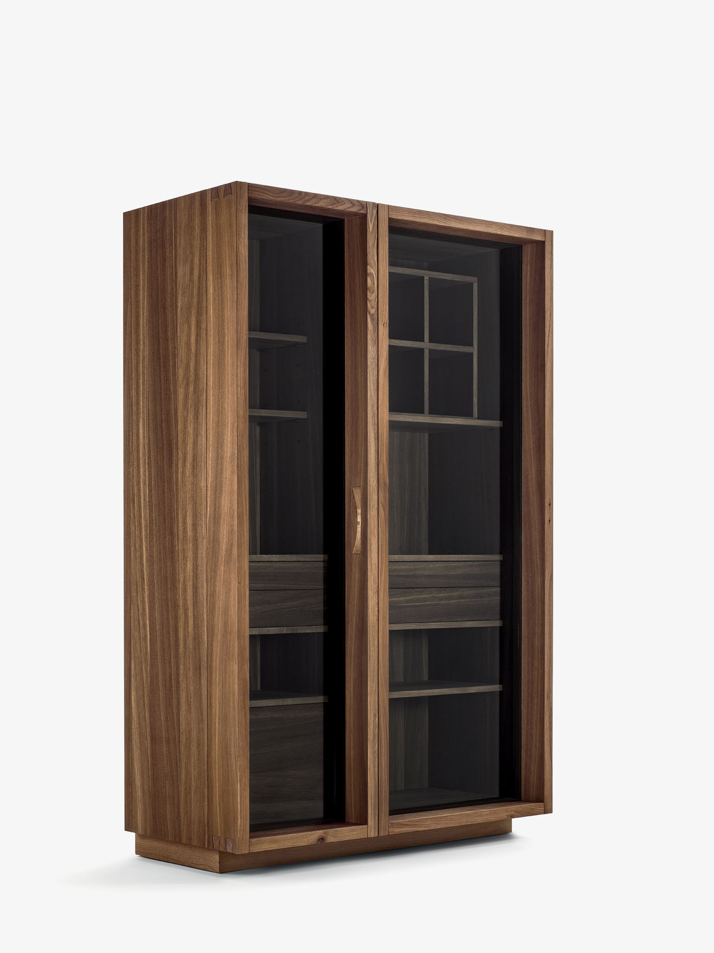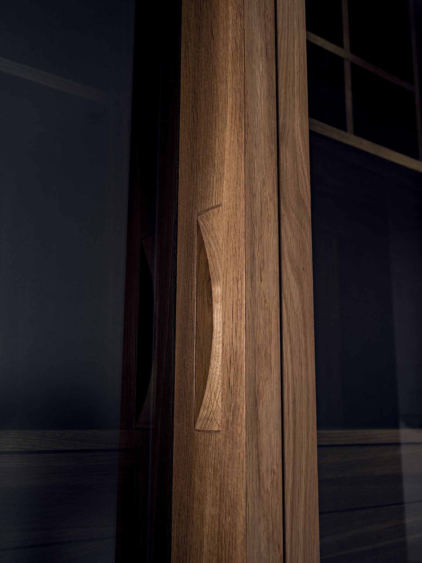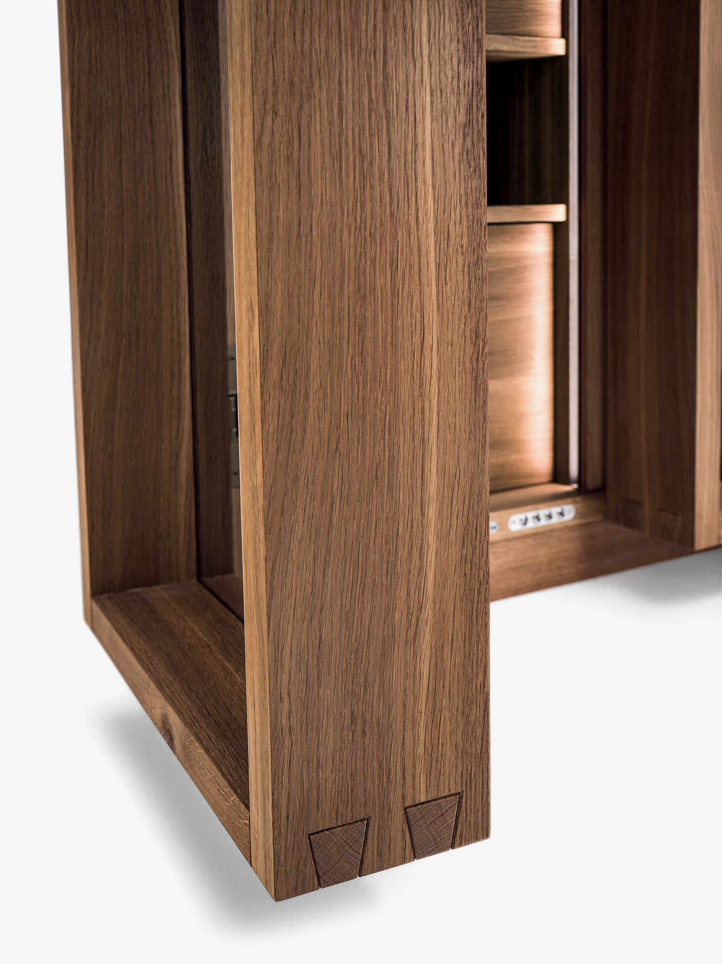 Многофункциональный шкаф из столярных плит и массива дерева с двойной стеклянной дверцей с углом открывания 180 °. Комплектация включает отделения для хранения различных размеров, с возможностью установки мелкой бытовой техники (в версии Jumbo). Внутренняя часть шкафа освещена с помощью светодиодных лент, расположенных на центральном блоке, зажигание которых происходит автоматически с помощью сенсорных датчиков, которые срабатывают при открывании дверей.