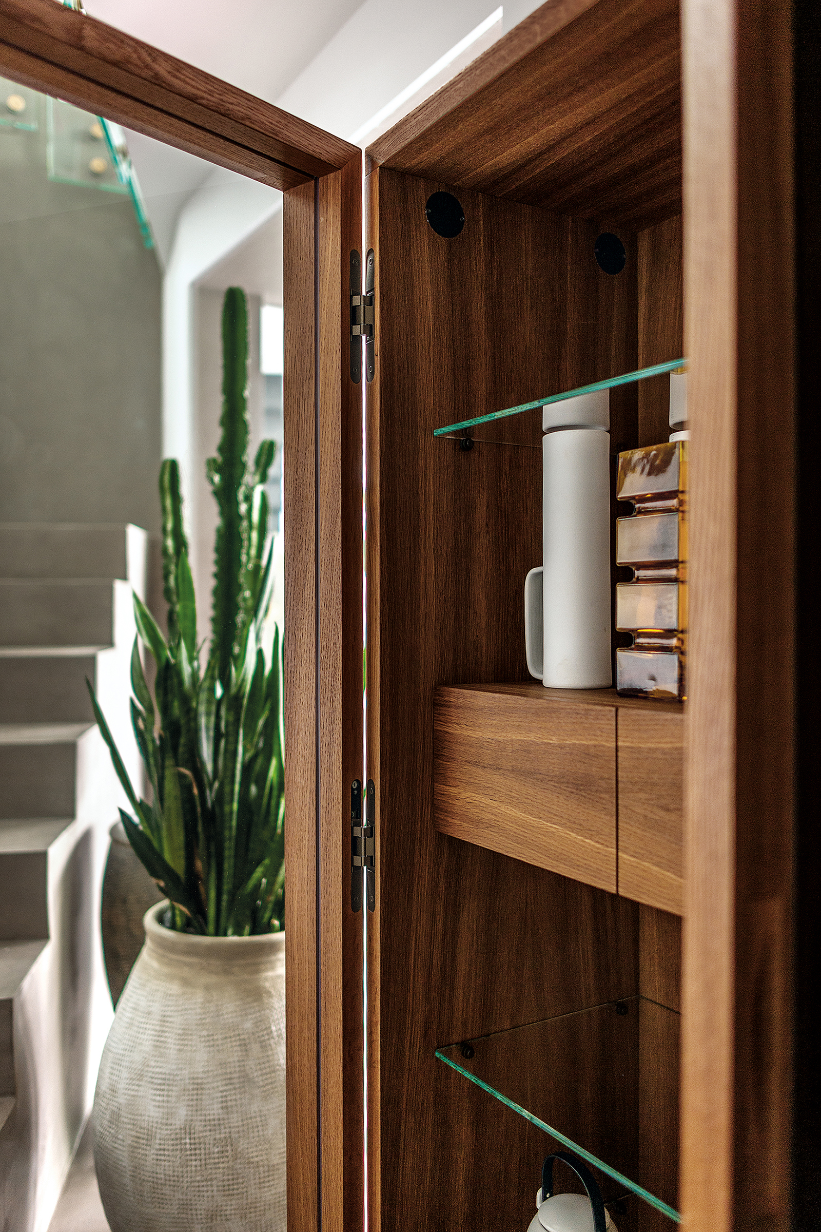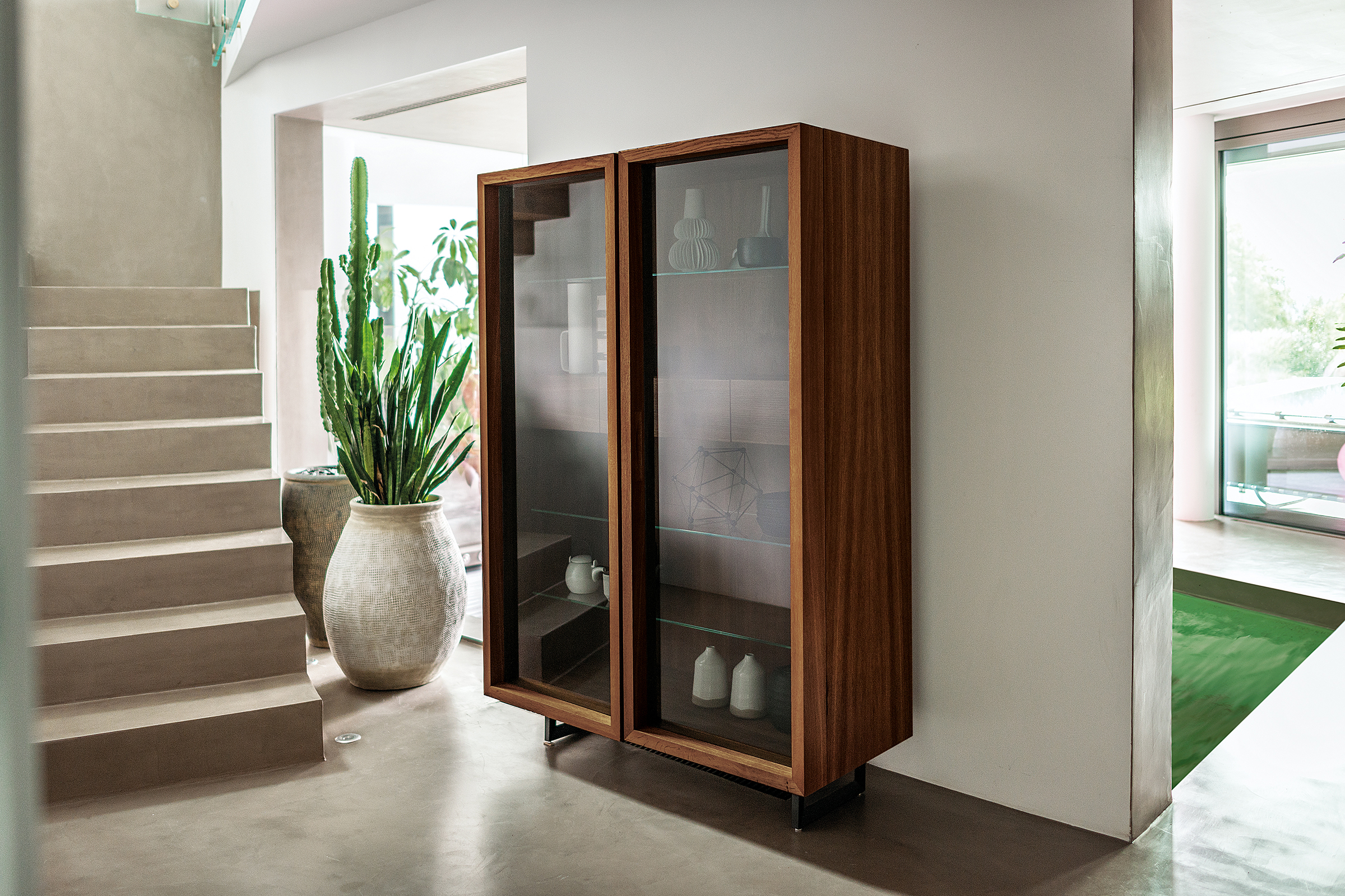 Многофункциональный блок для хранения из наборного массива, оснащенный стеклянными дверцами с деревянной конструкцией, с углом открывания 180 °, в сочетании с железным основанием с двумя ножками. Оборудование и внутренние аксессуары разработаны с учетом потребностей хранения и функциональных потребностей. Внутренняя часть шкафа освещается косанием руки с помощью светодиодных лент, расположенных на блоках в модели VITREA 1.