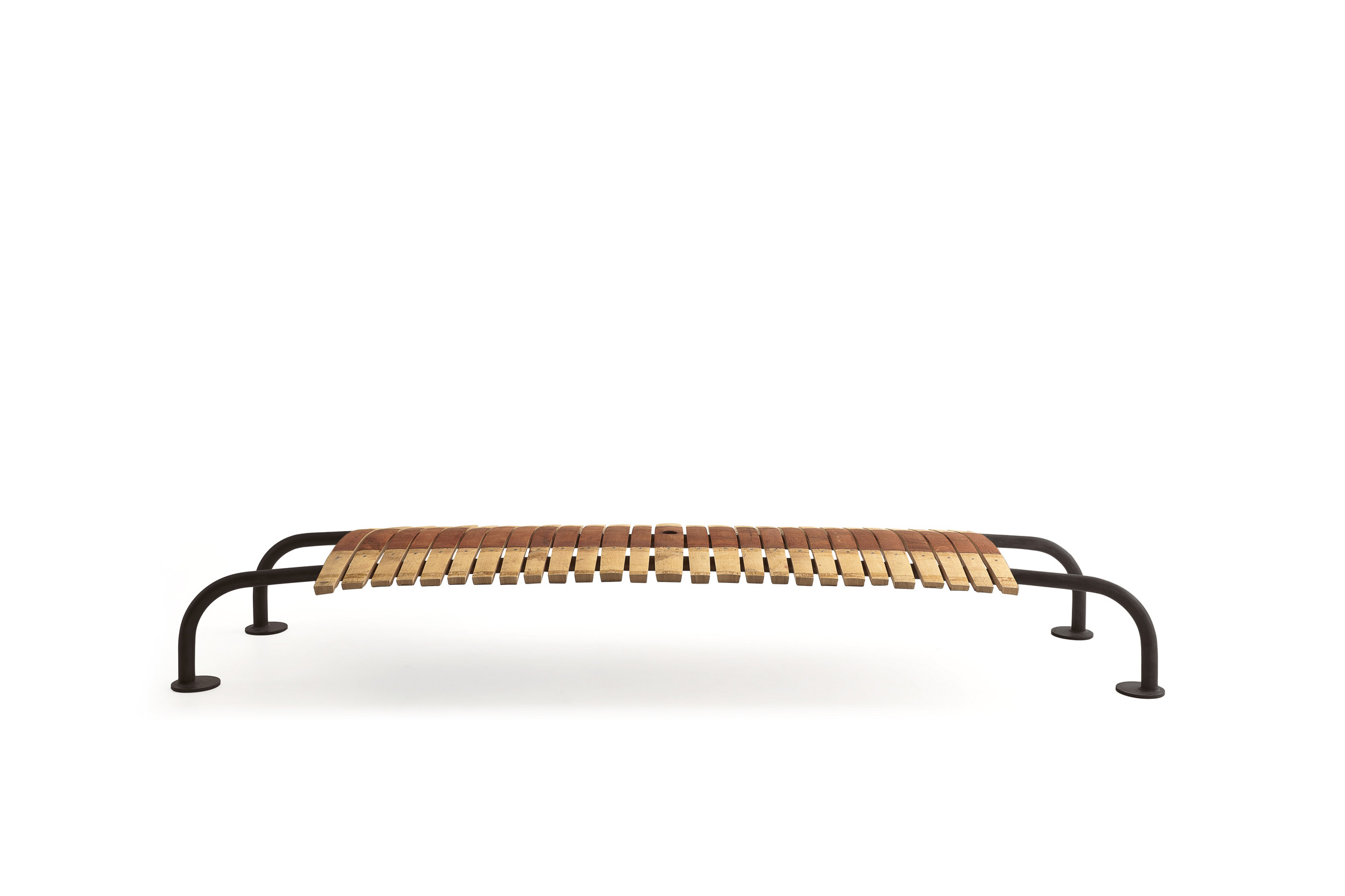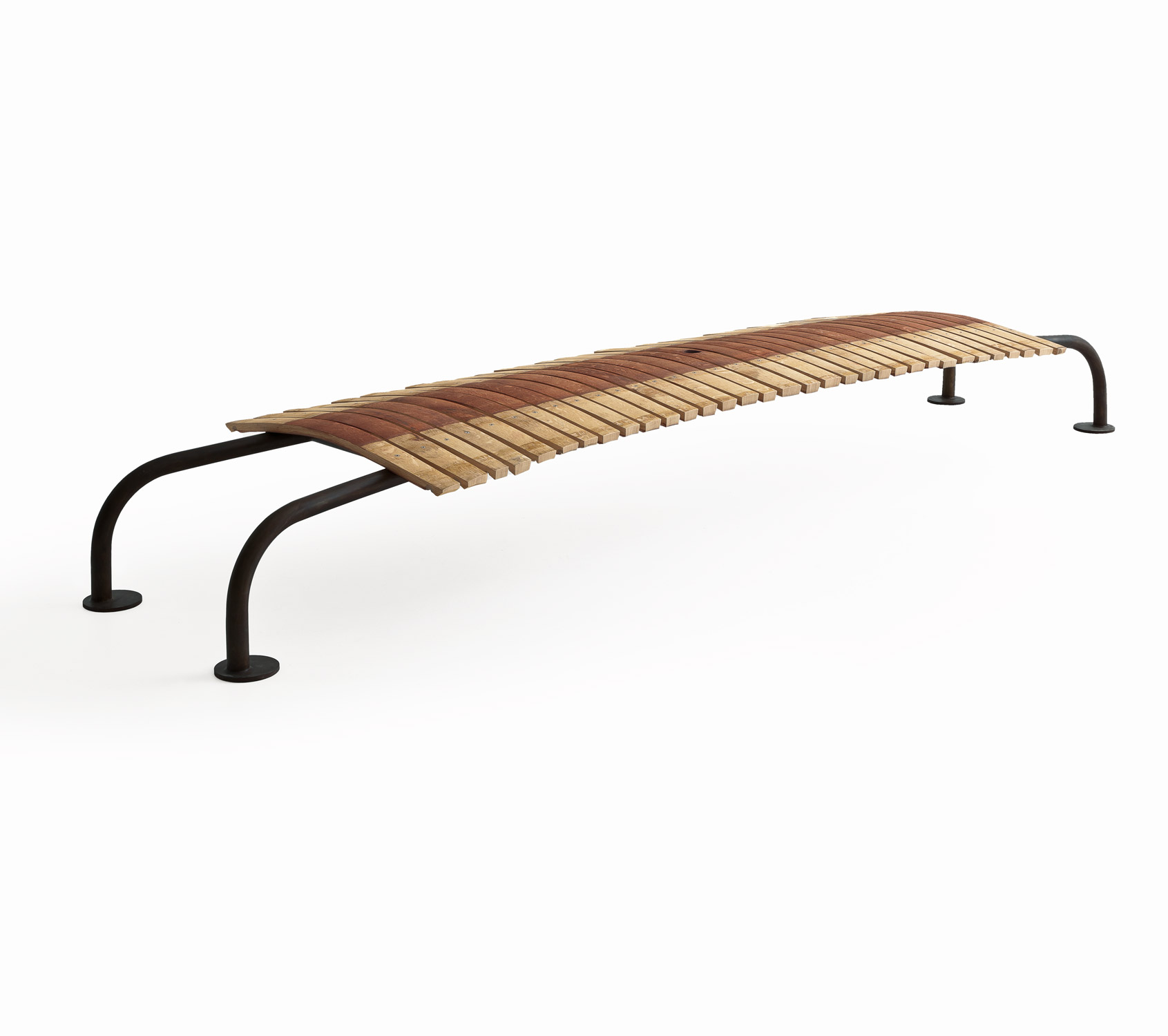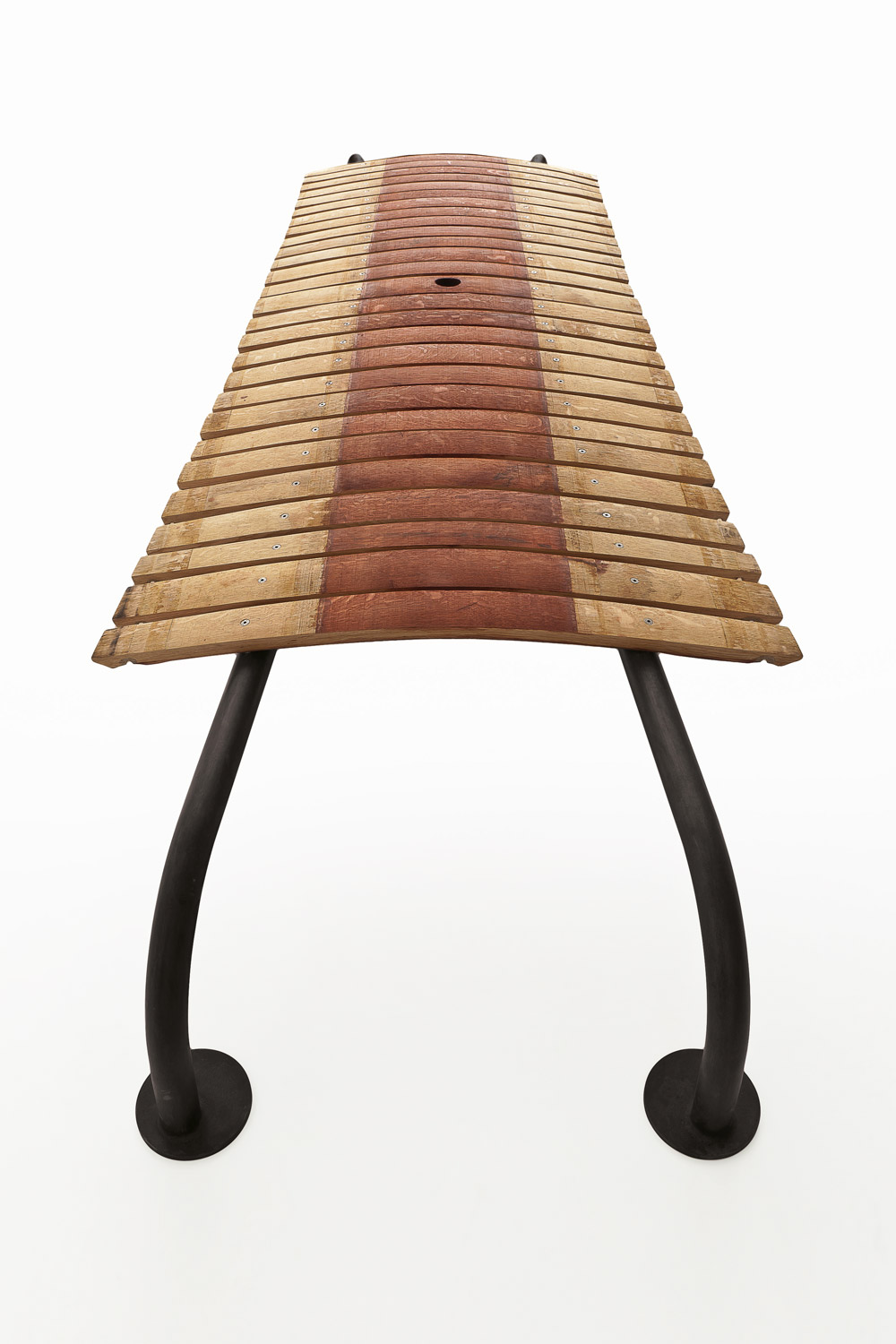 Деревянная скамейка, изготовленная путем соединения дубовых реек из барриков. Криволинейное железное основание.