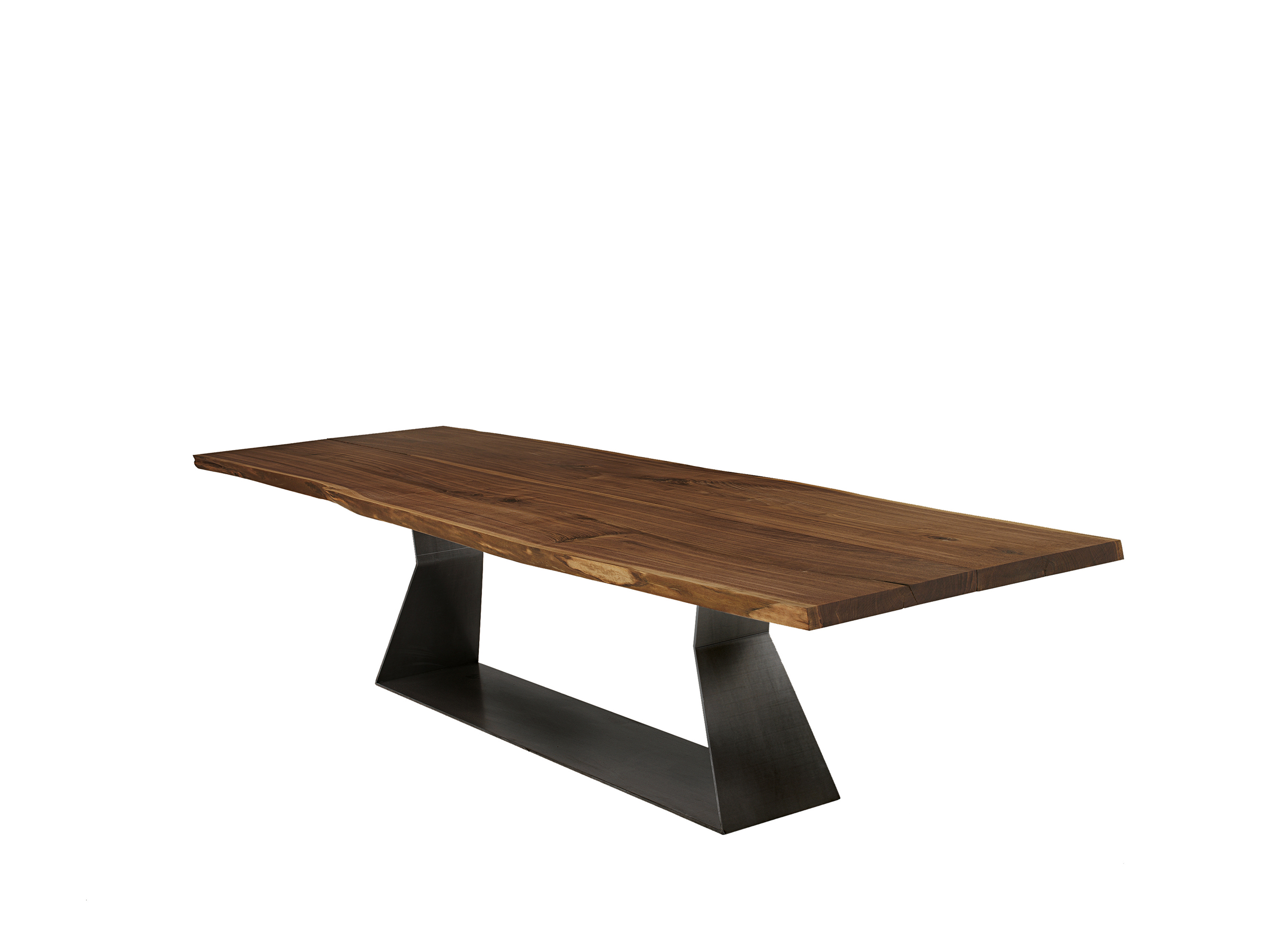 Стол со столешницей из массива дерева, состоящий из двух одинарных досок, выровненных по центру с естественными краями. По запросу доступны доски со смещением 30 см (Bedrock Plank B). Основание из листового железа с геометрическими линиями.