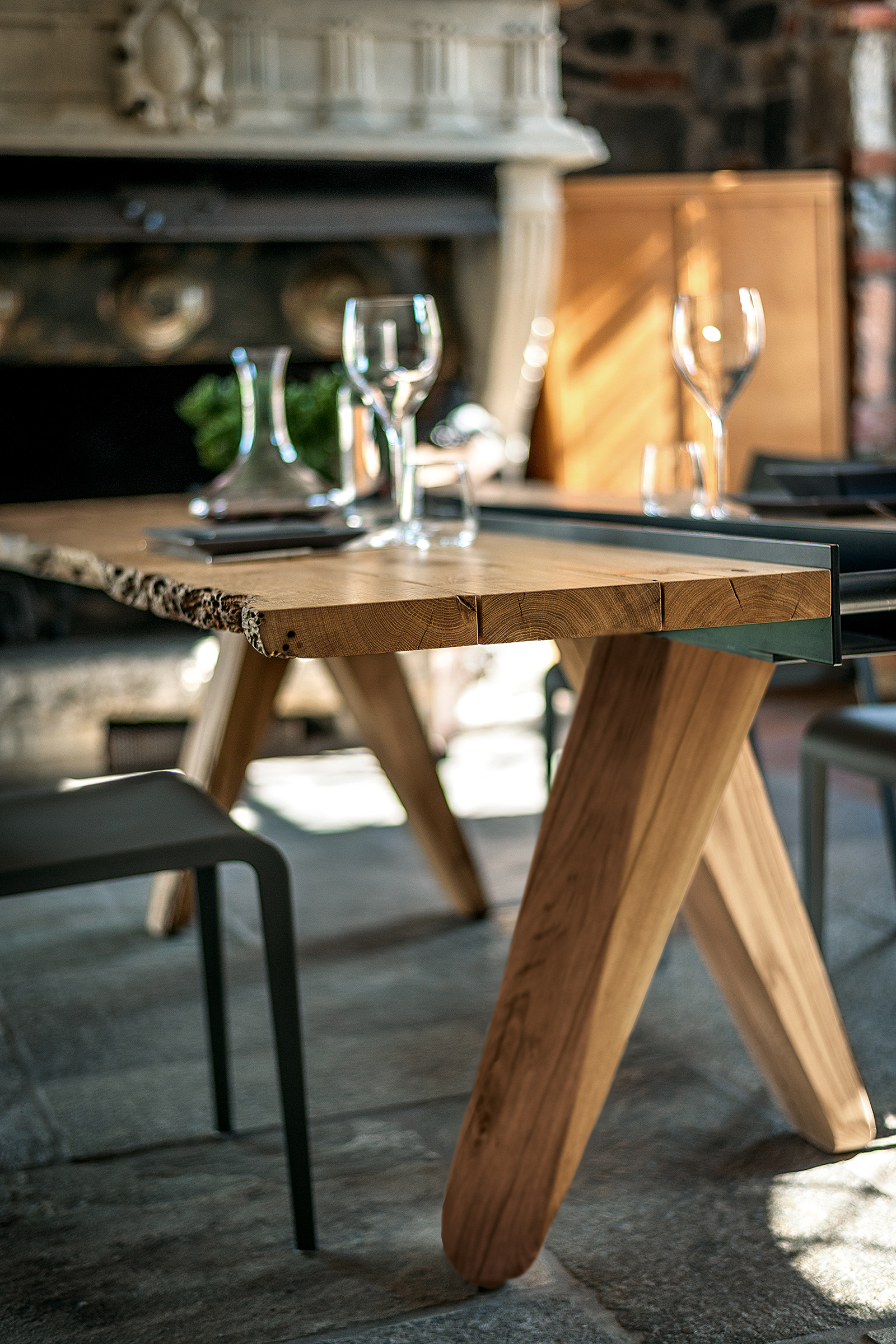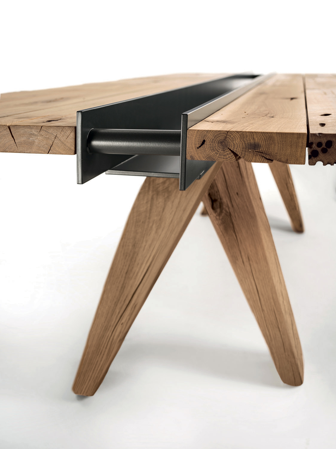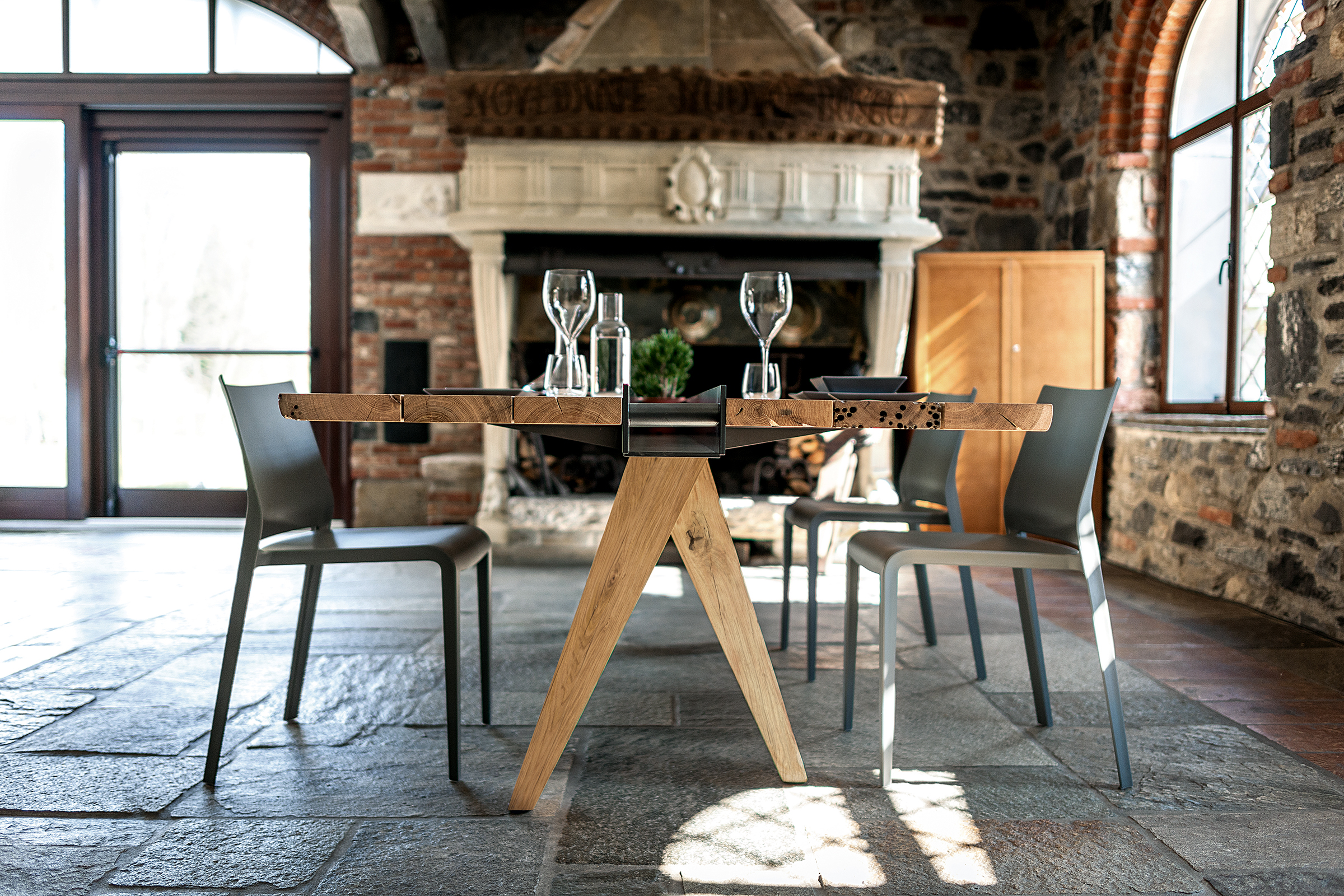 Стол со столешницей из массива Briccola, с досками с краями естественной формы. Оснащен центральным железным отсеком с функцией контейнера. Столешницу несут четыре ножки с геометрическим сечением.