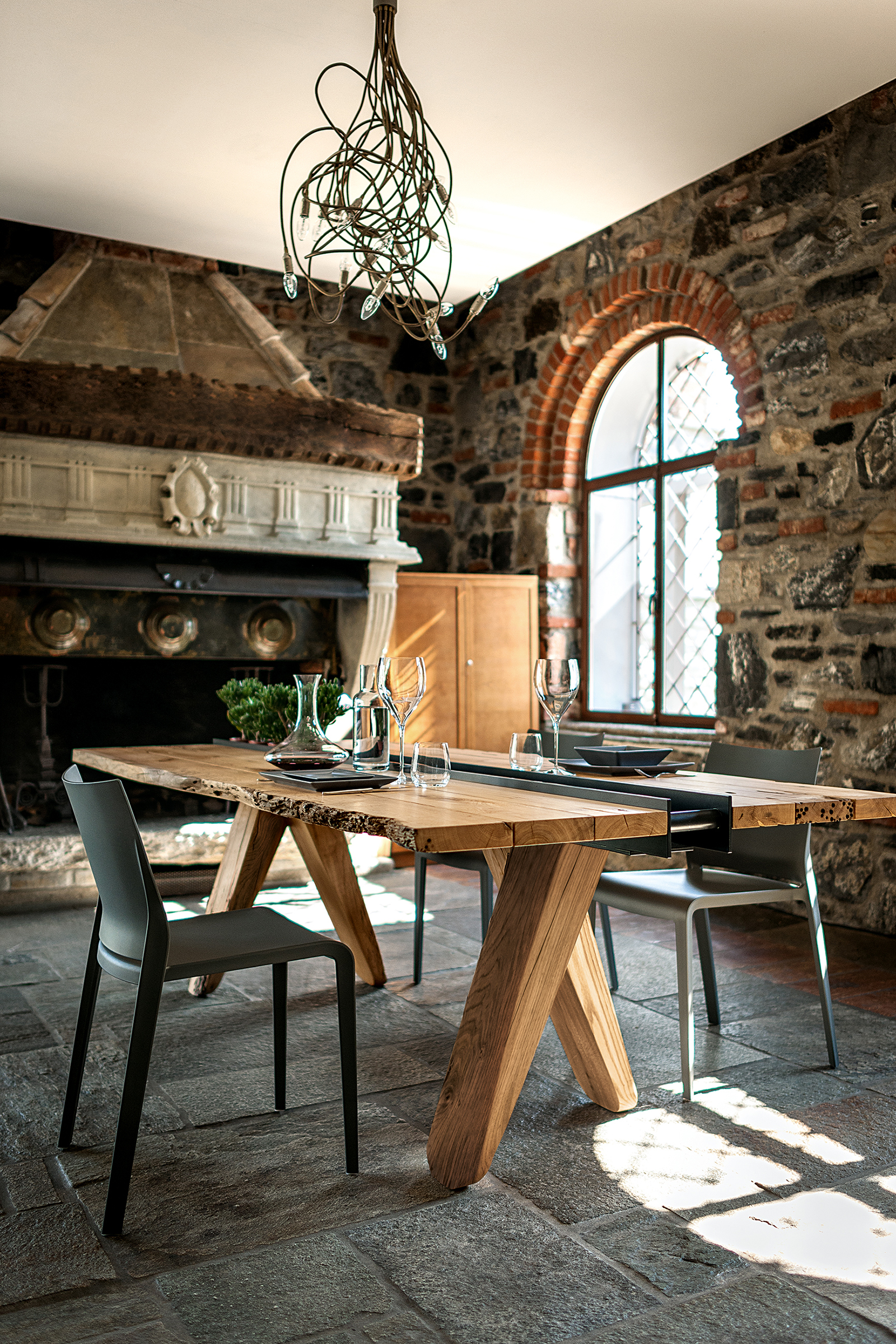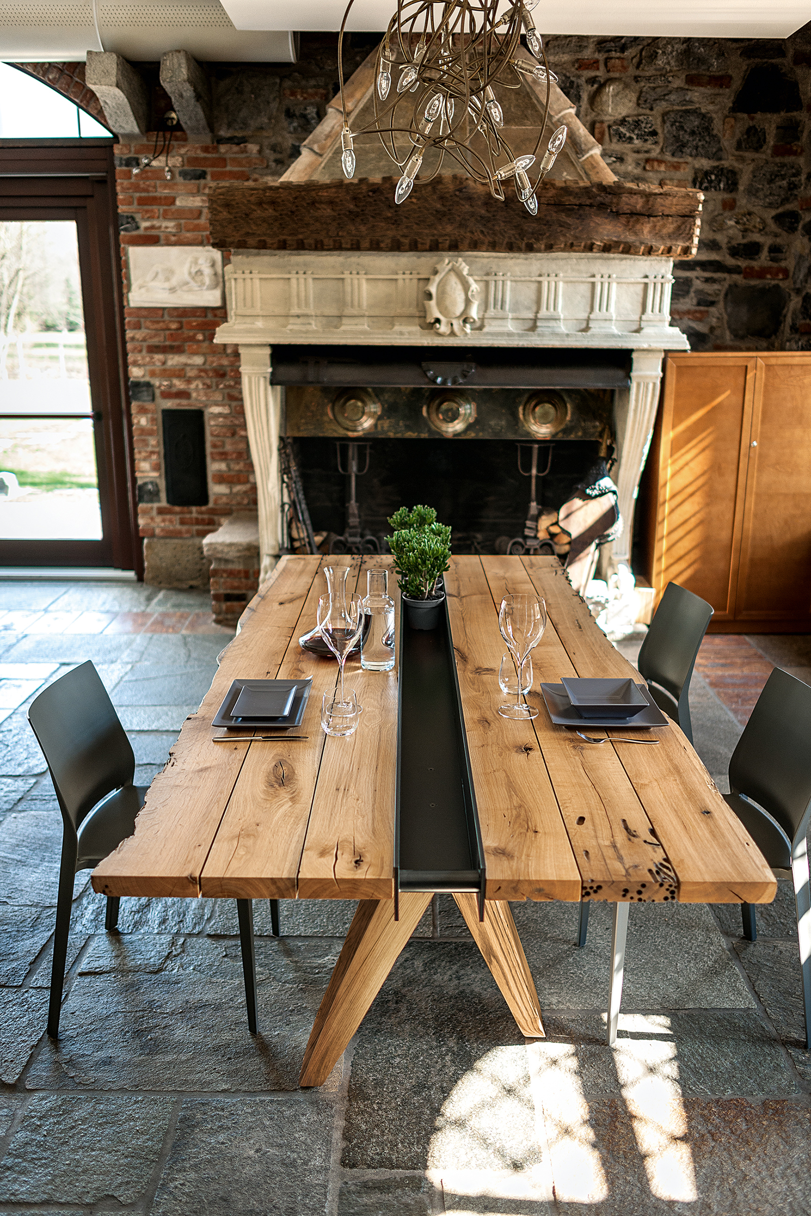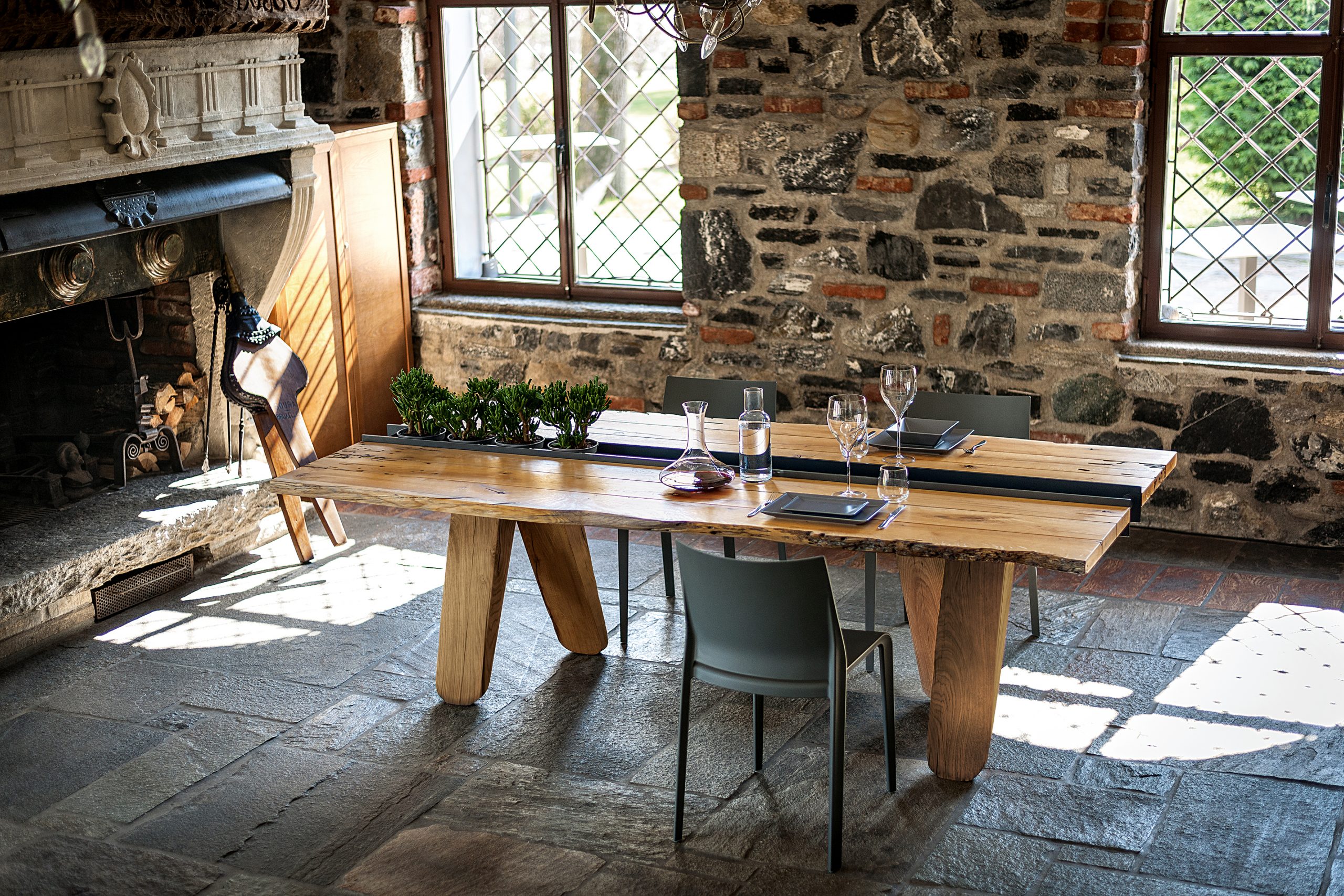 Стол со столешницей из массива Briccola, с досками с краями естественной формы. Оснащен центральным железным отсеком с функцией контейнера. Столешницу несут четыре ножки с геометрическим сечением.