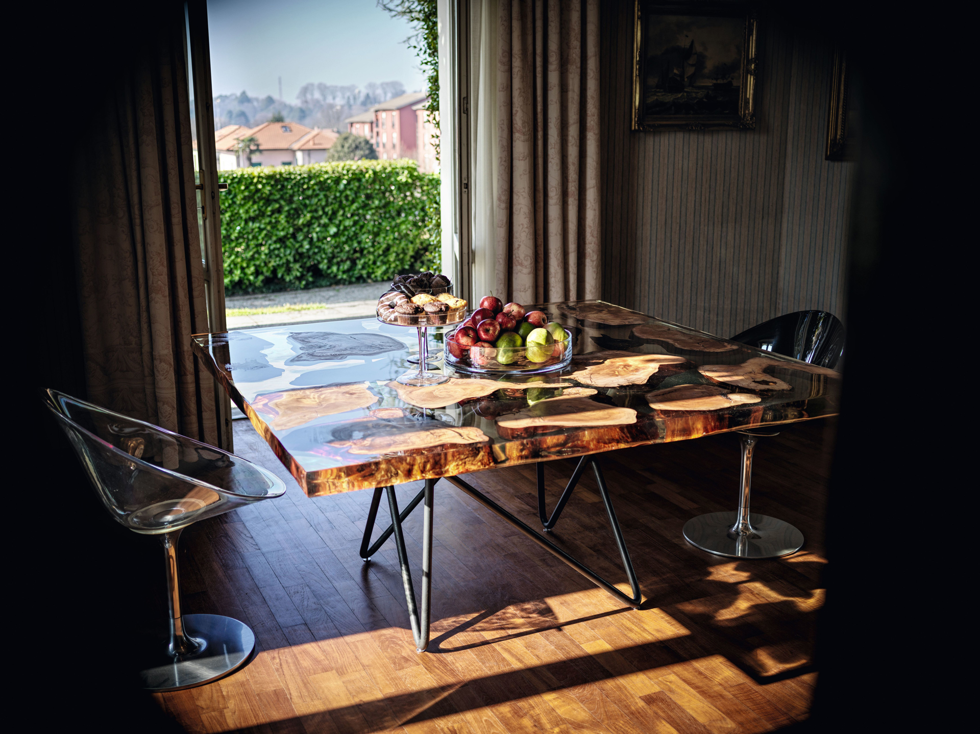 Переосмысление оригинального проекта, в котором столешница представлена квадратной, а не круглой формой. Столешница из дерева каури и смолы, стилизованное изображение земного шара: метафорически - деревянные части представляют континенты, а смола - океаны. Основание из чугуна с трубчатым профилем.