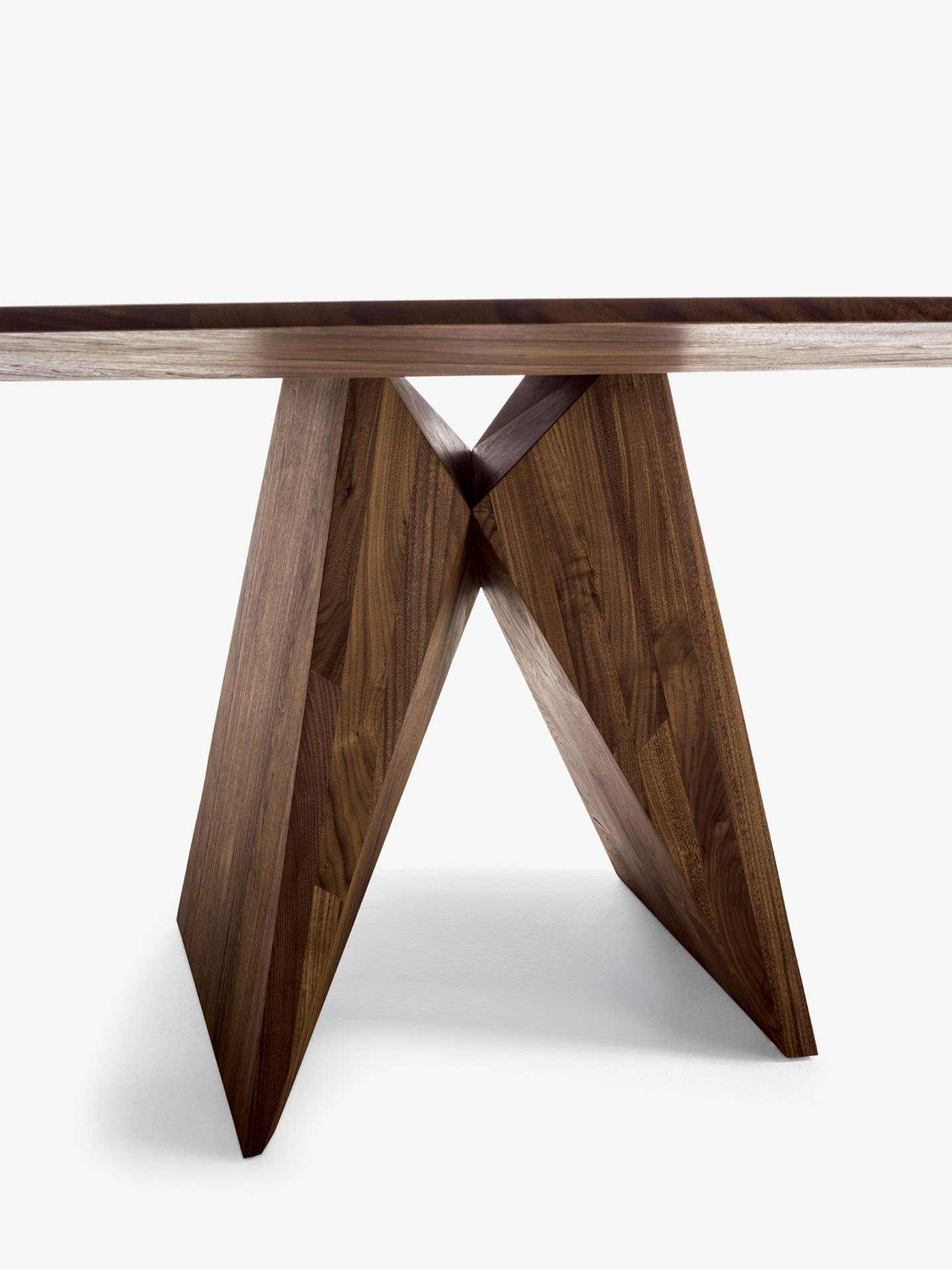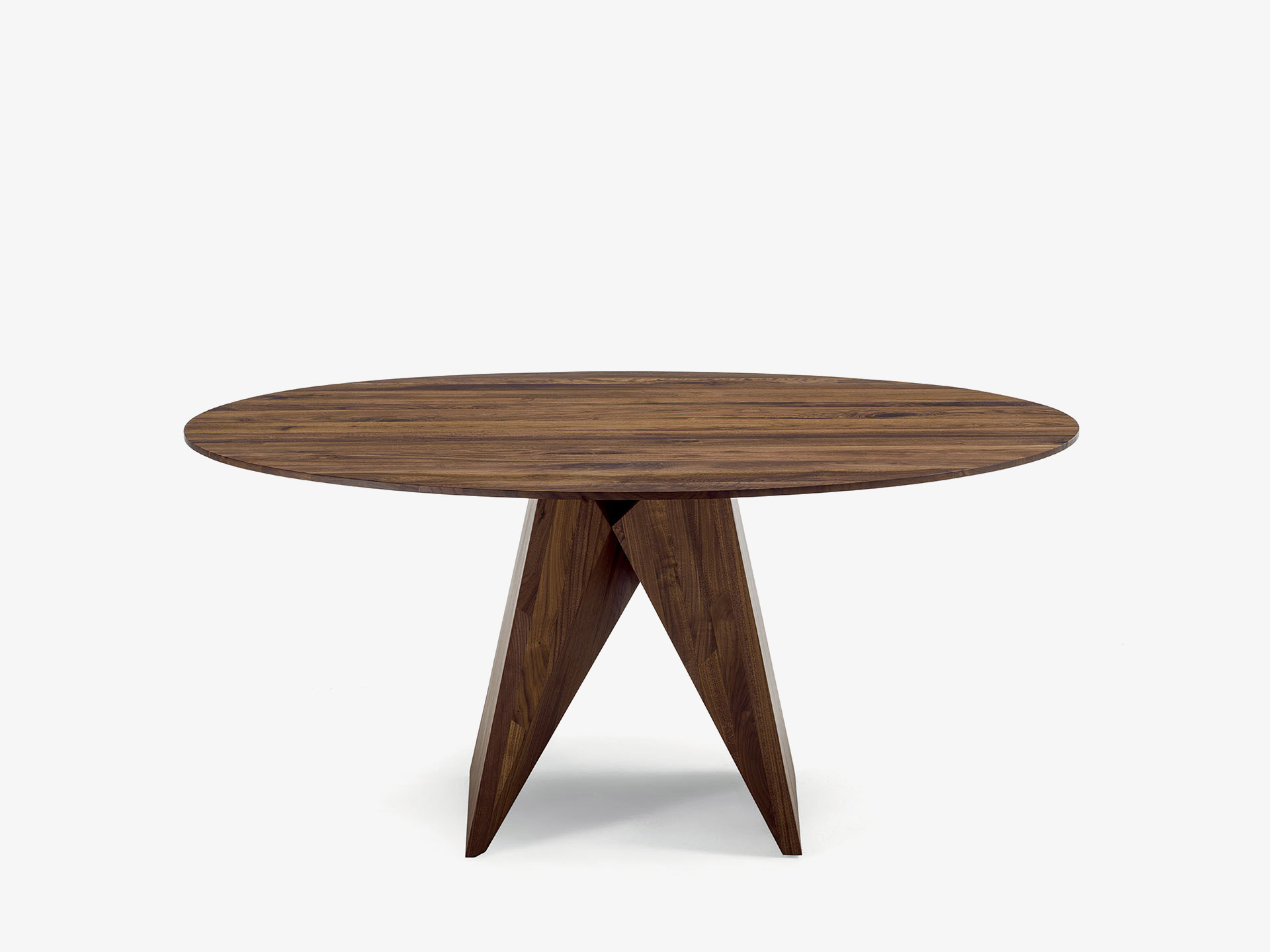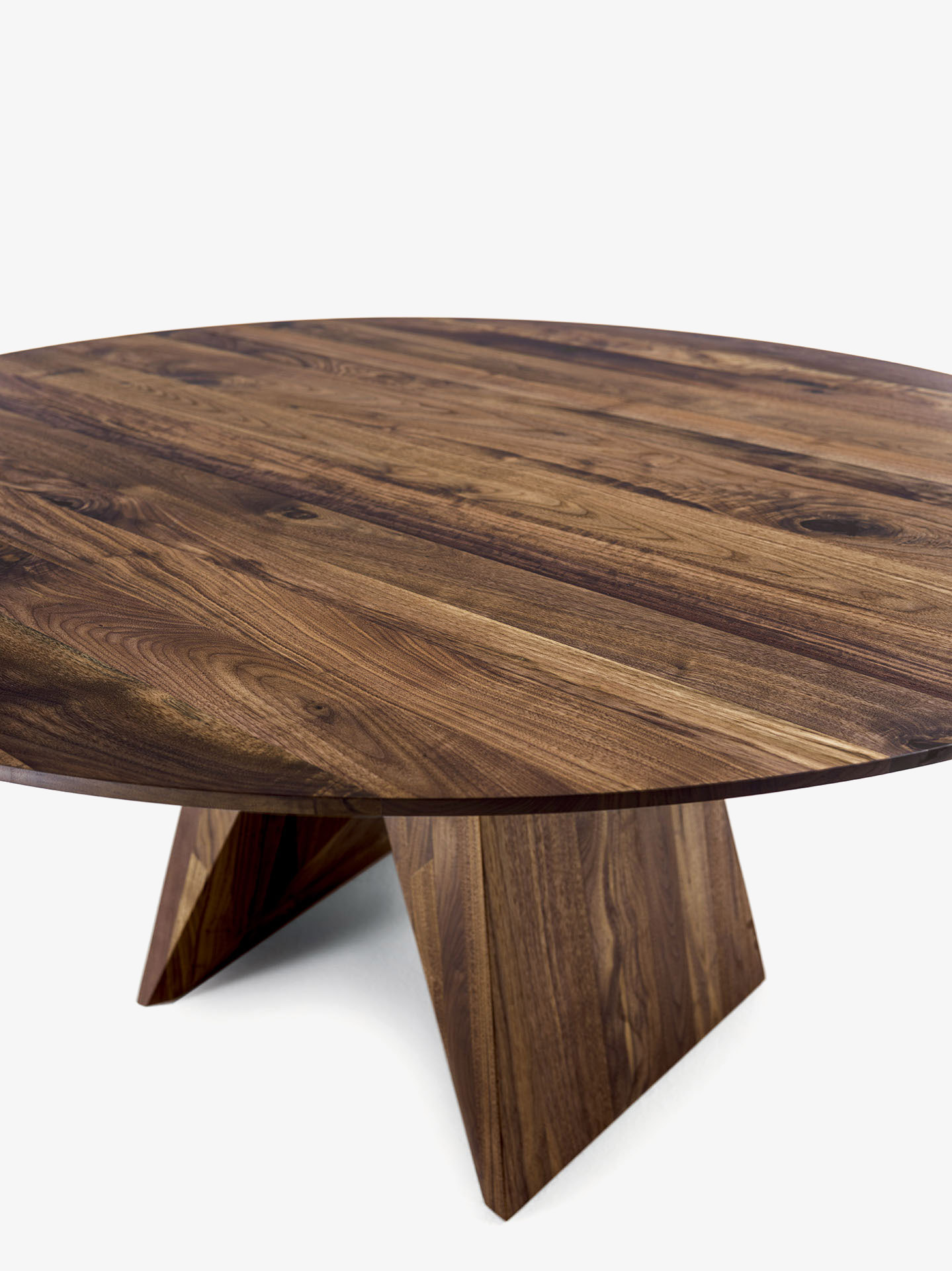 Стол полностью из массива дерева, с круглой столешницей с клееными досками и двумя ножками геометрической формы.
