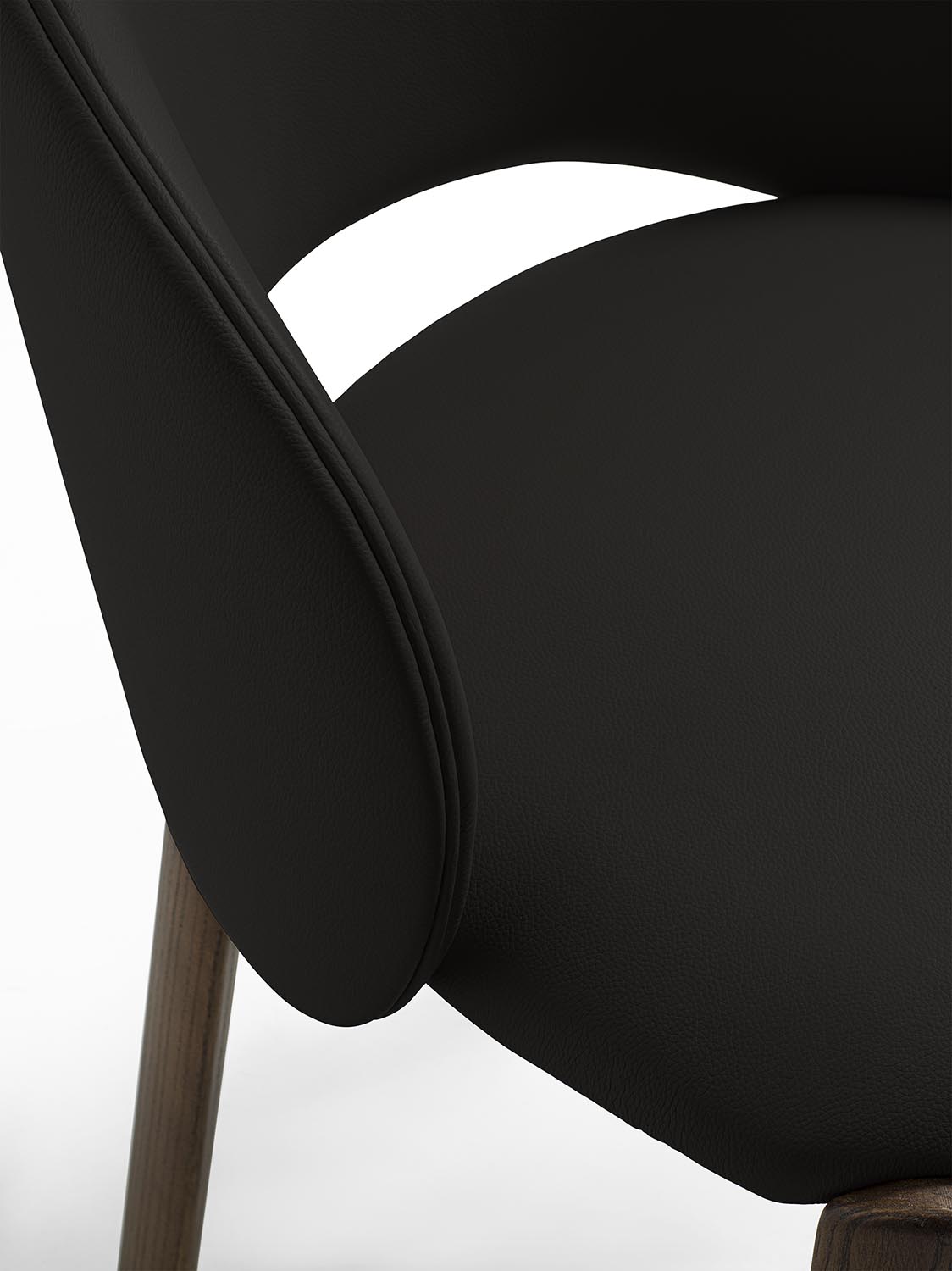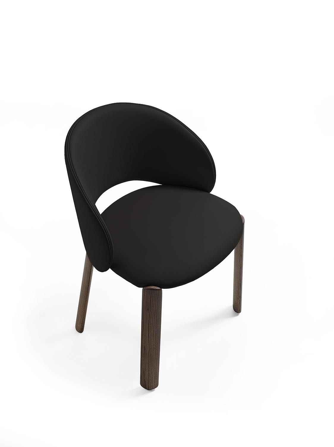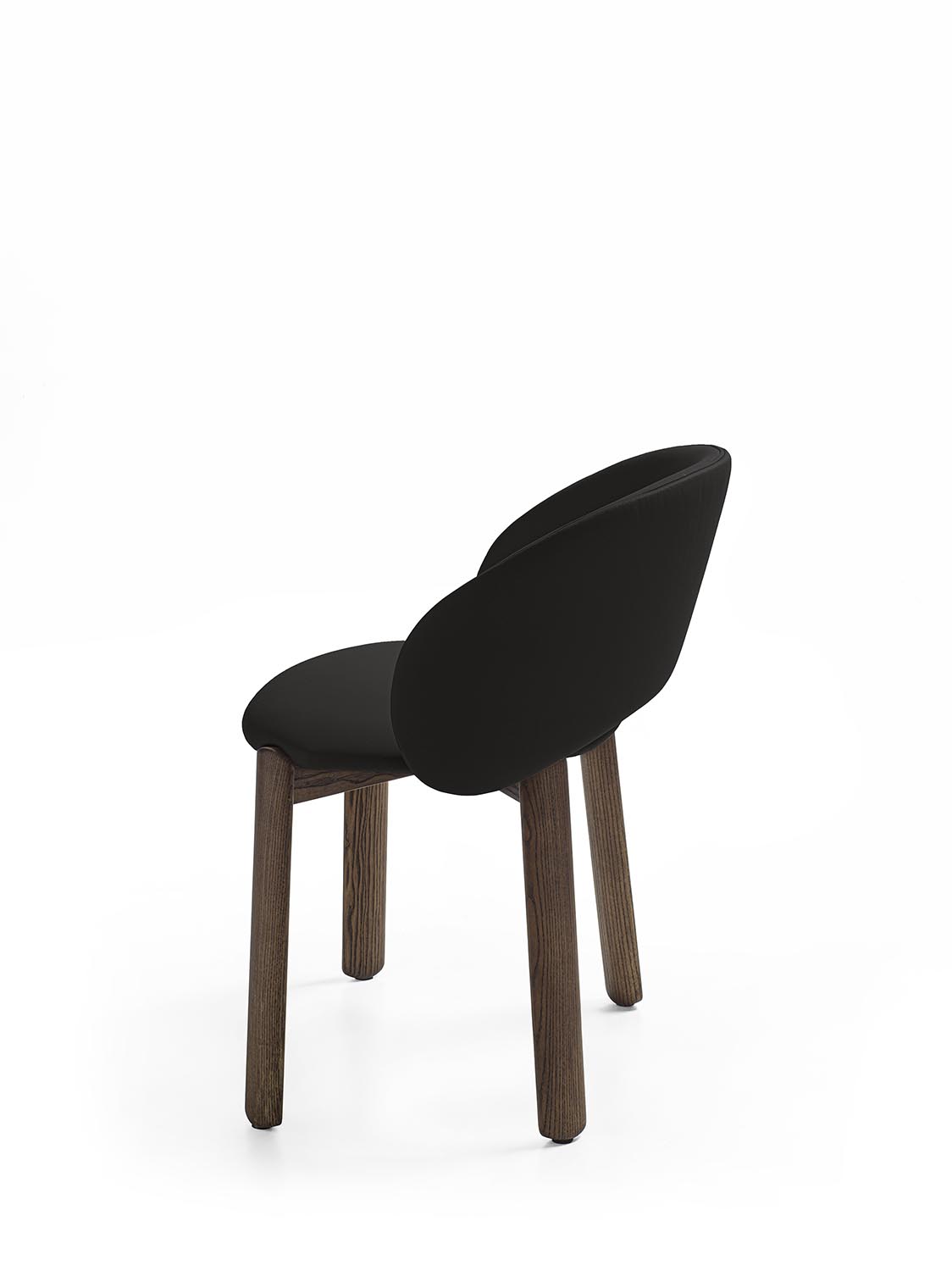 Стул с ножками из массива дерева, отличающийся плавными формами и закругленными профилями. Спинка плавно переходит в подлокотники. Сиденье и спинка могут быть обиты кожей или тканью.