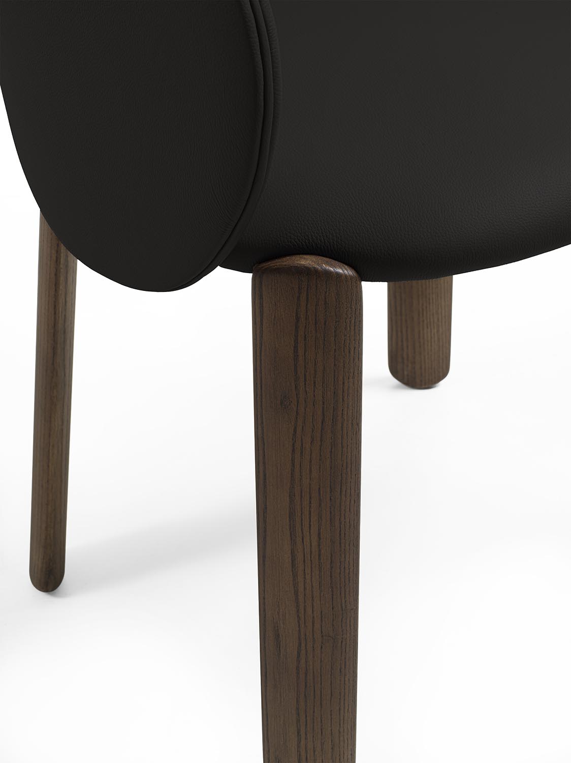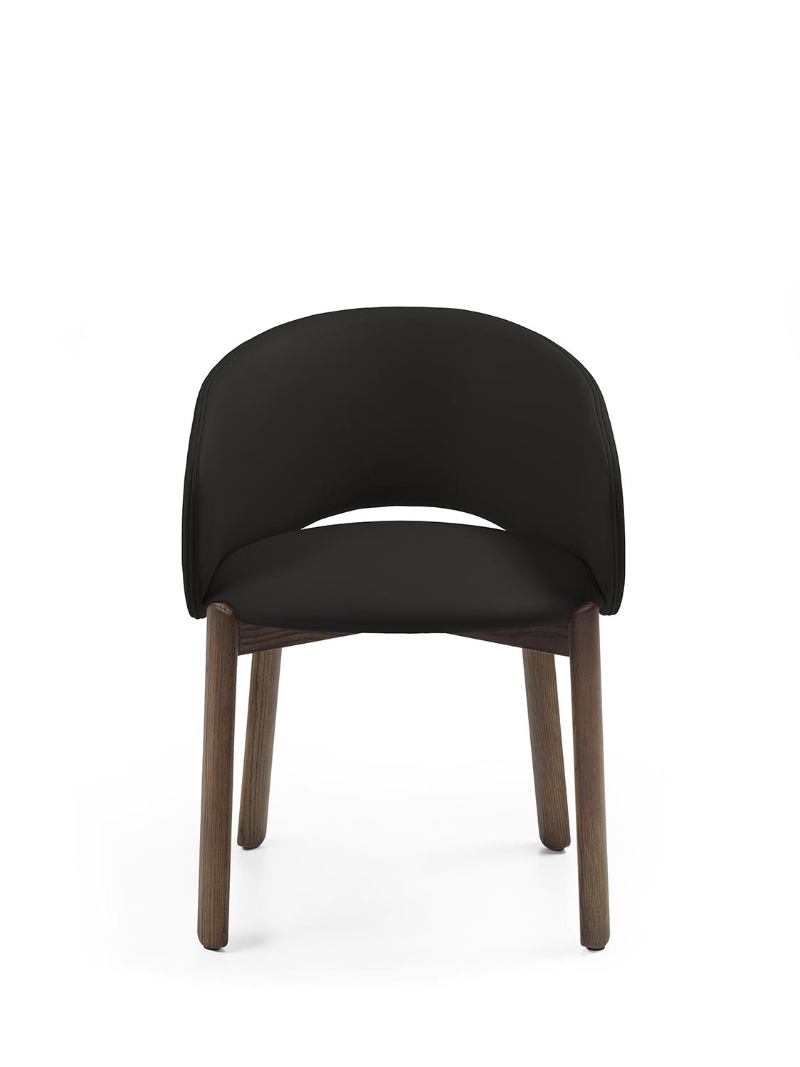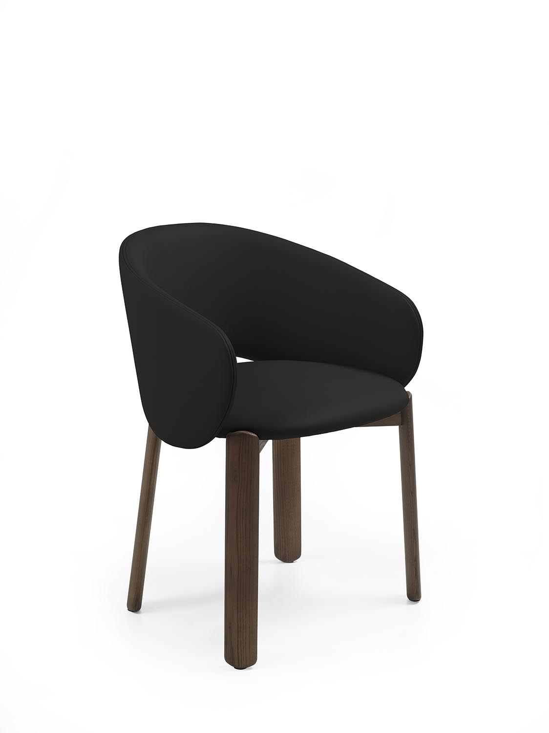 Стул с ножками из массива дерева с плавными линиями и закругленными профилями. Спинка плавно переходит в подлокотники, образуя единую, цельную конструкцию. Сиденье и спинка доступны в кожаной или тканевой обивке.
