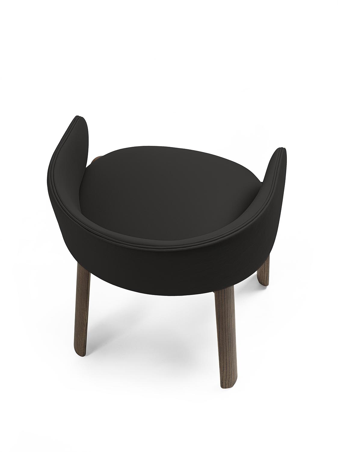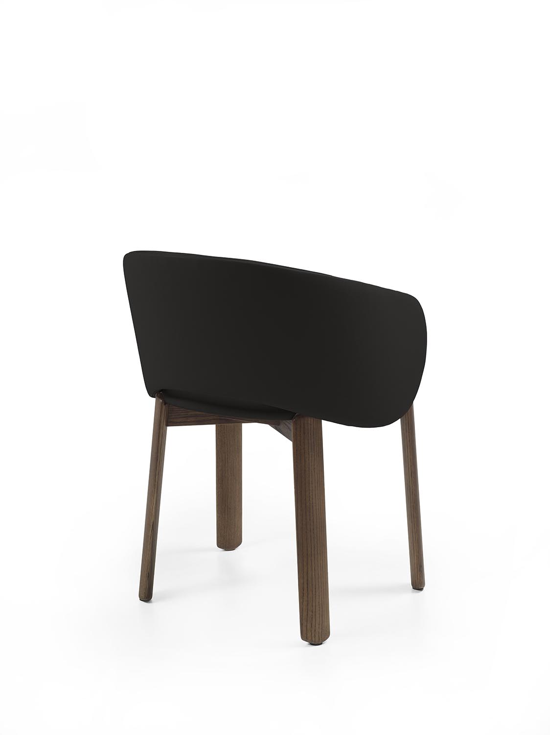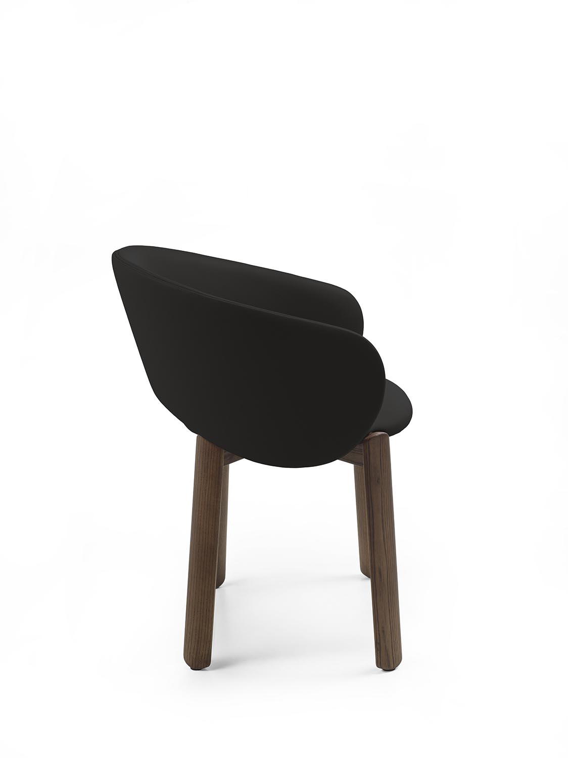 Стул с ножками из массива дерева с плавными линиями и закругленными профилями. Спинка плавно переходит в подлокотники, образуя единую, цельную конструкцию. Сиденье и спинка доступны в кожаной или тканевой обивке.