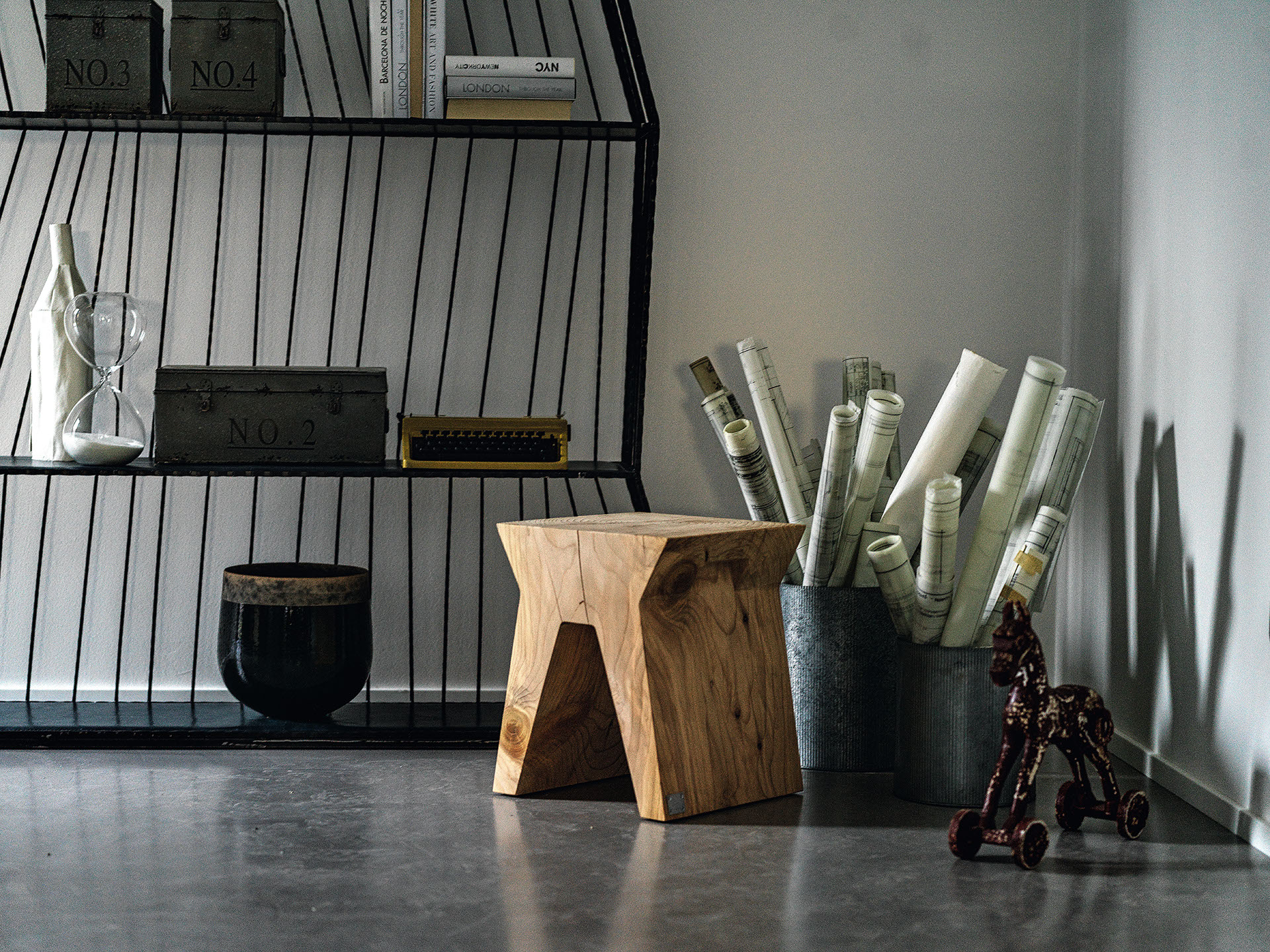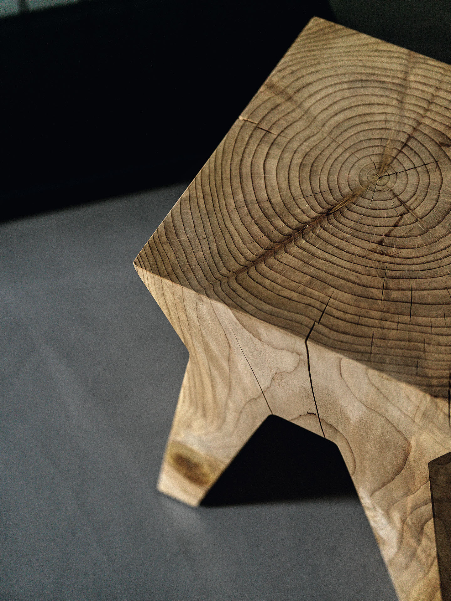 Табурет из массива душистого кедра, изготовленный из цельного блока, характеризуется геометрической формой с боковыми канавками для облегчения захвата.
