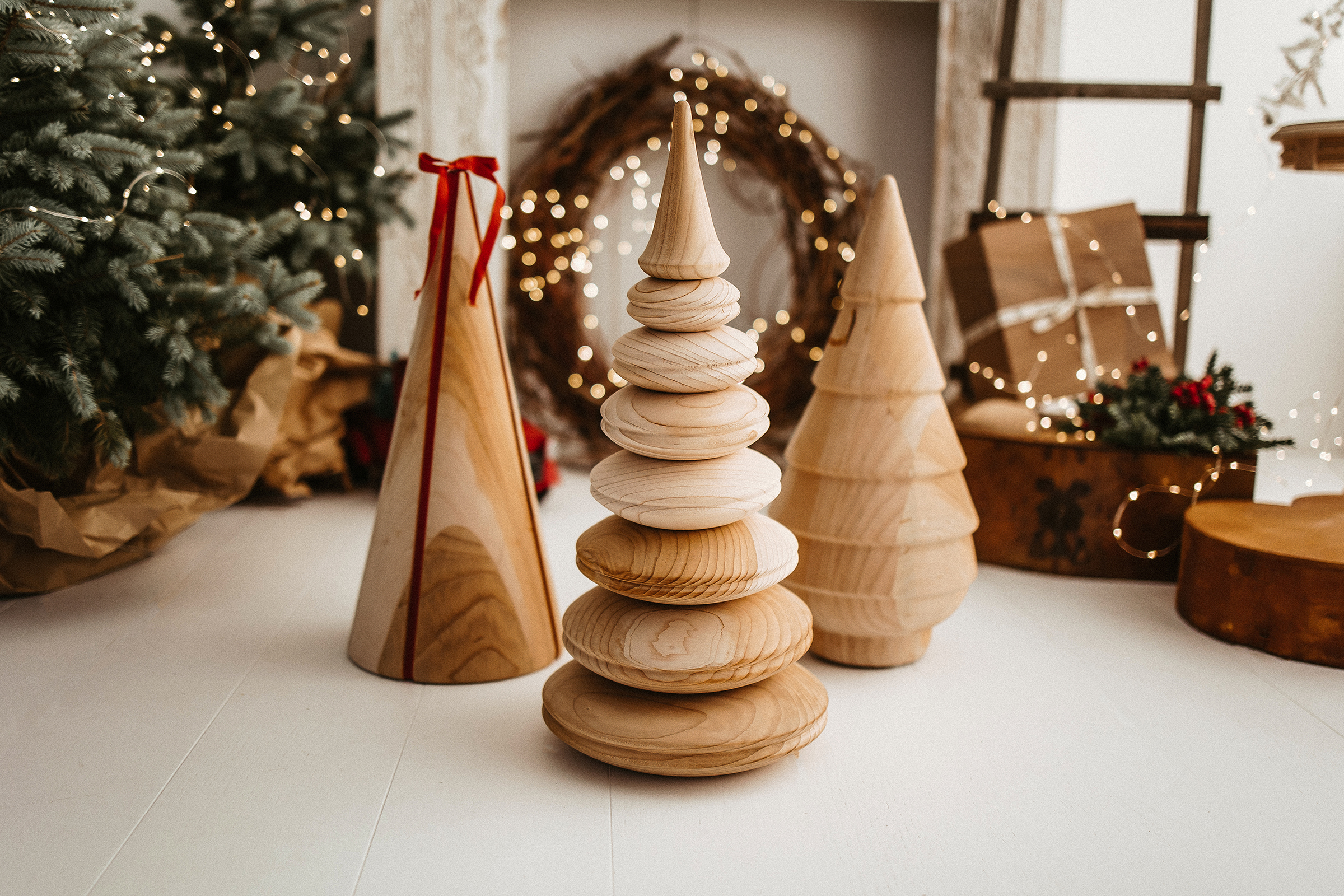 该设计刻画了两个圣诞节象征的结合:圣诞树和礼盒。其特点在于缠绕着红色绳索的圆锥形状,营造出丝带装饰礼盒的视觉效果。