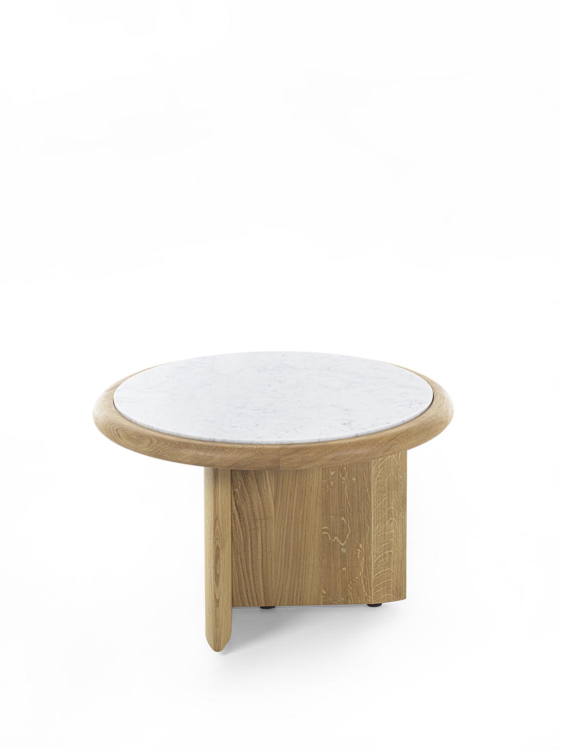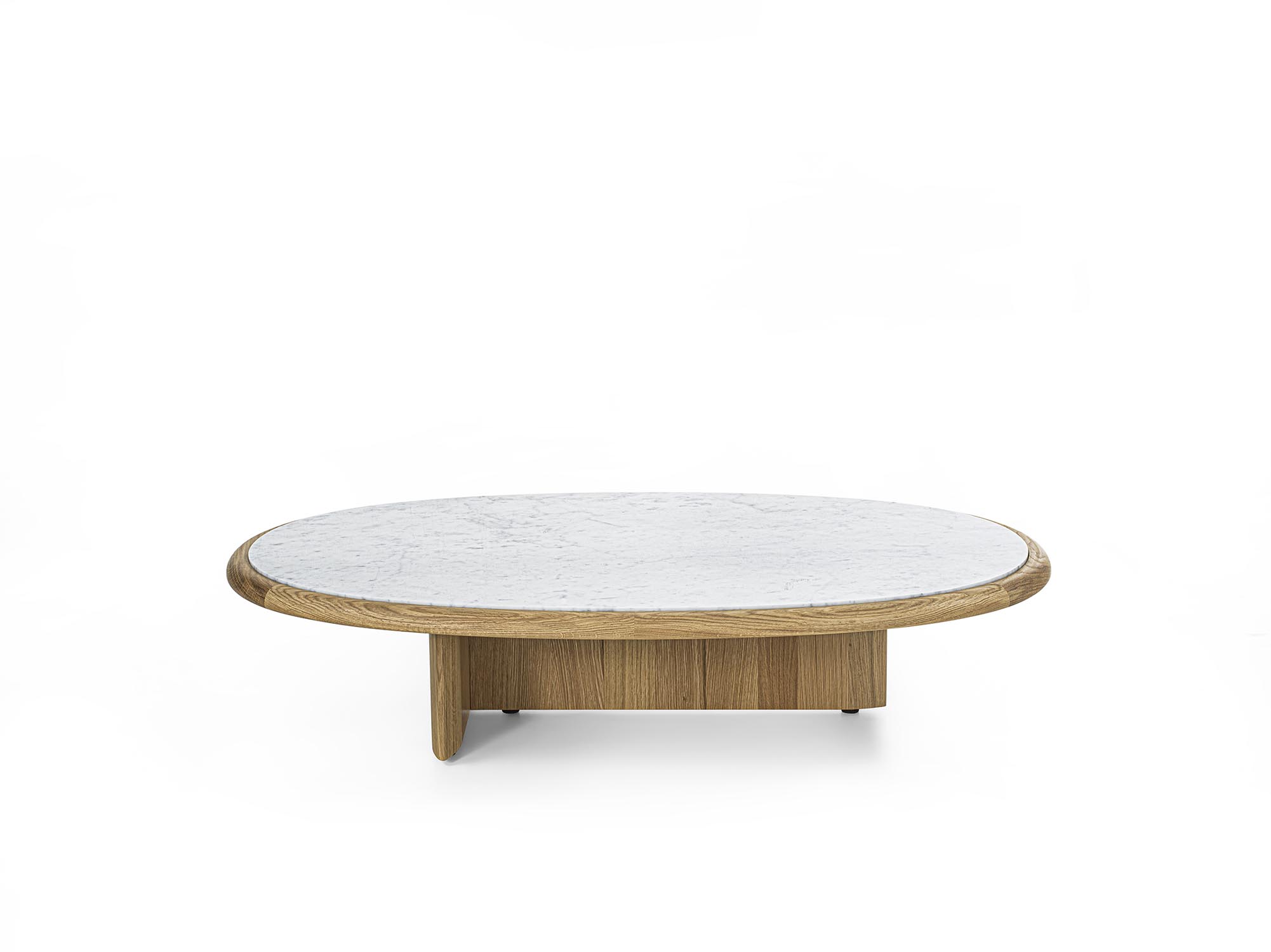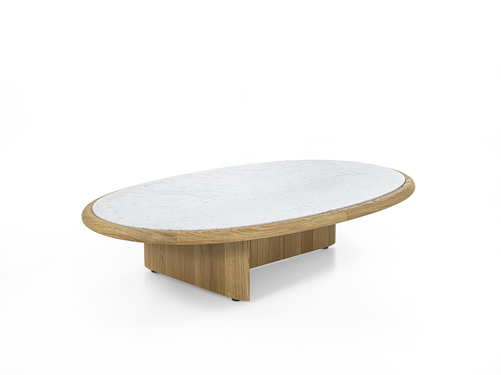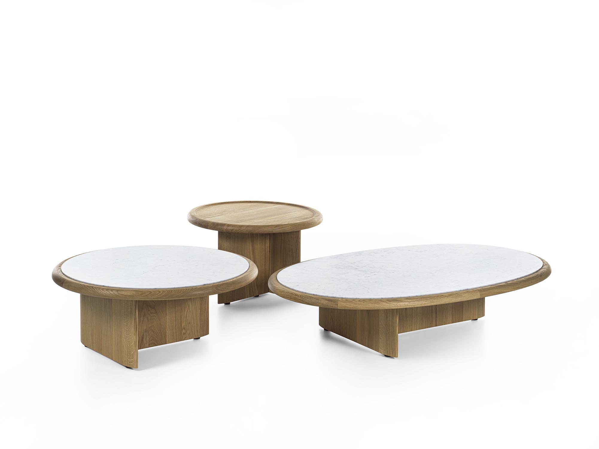 实木茶几,底座由彼此垂直布置的支撑构件组成,呈现出简约而富有雕塑感的结构。有不同高度版本可供选择;台面可为圆形或椭圆形,配大理石嵌件及木质外围框架,或全部采用实木制成。