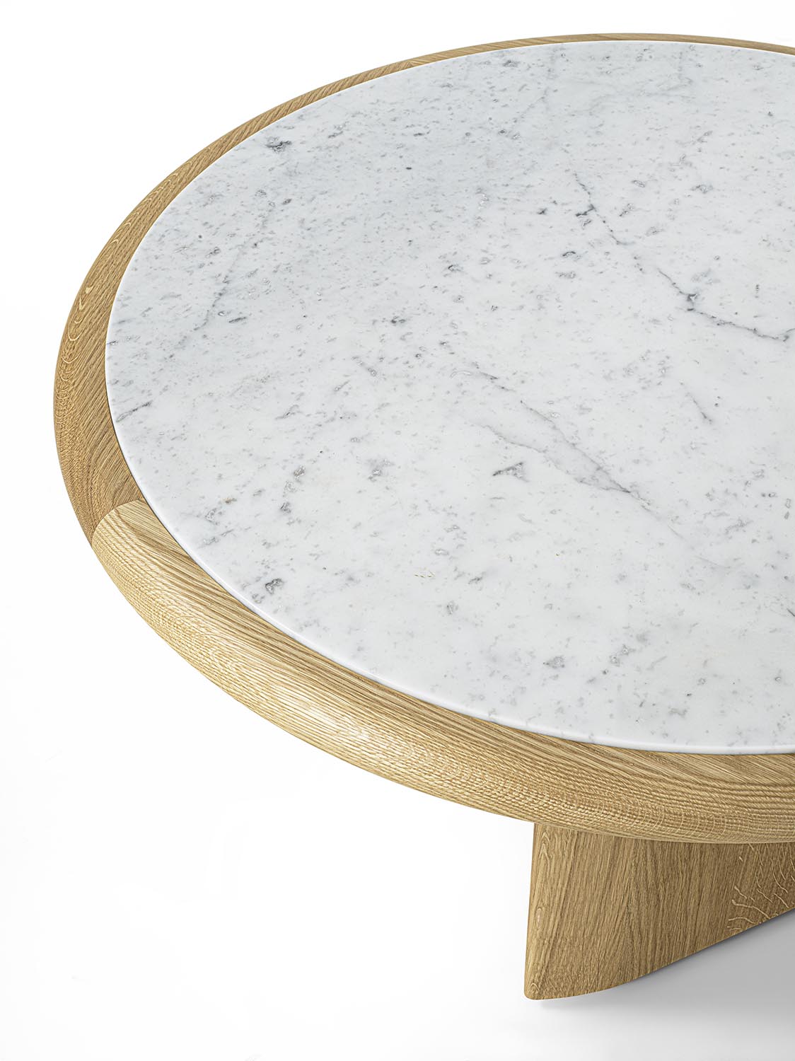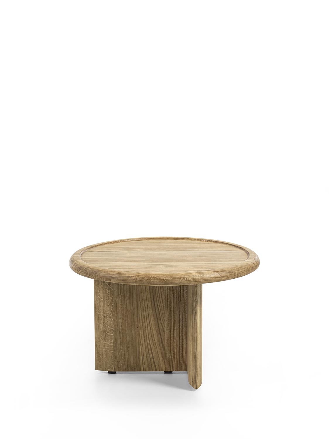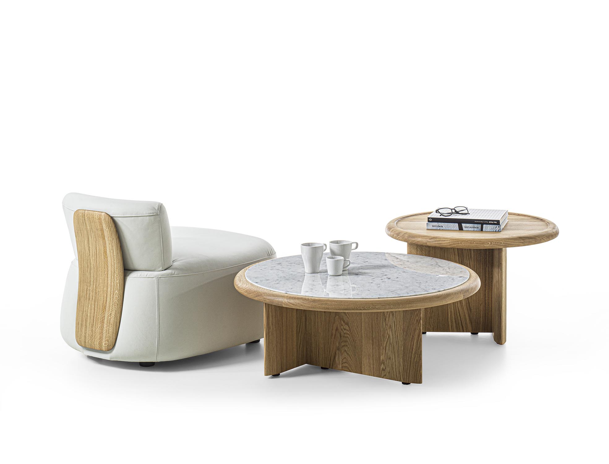 实木茶几,底座由彼此垂直布置的支撑构件组成,呈现出简约而富有雕塑感的结构。有不同高度版本可供选择;台面可为圆形或椭圆形,配大理石嵌件及木质外围框架,或全部采用实木制成。