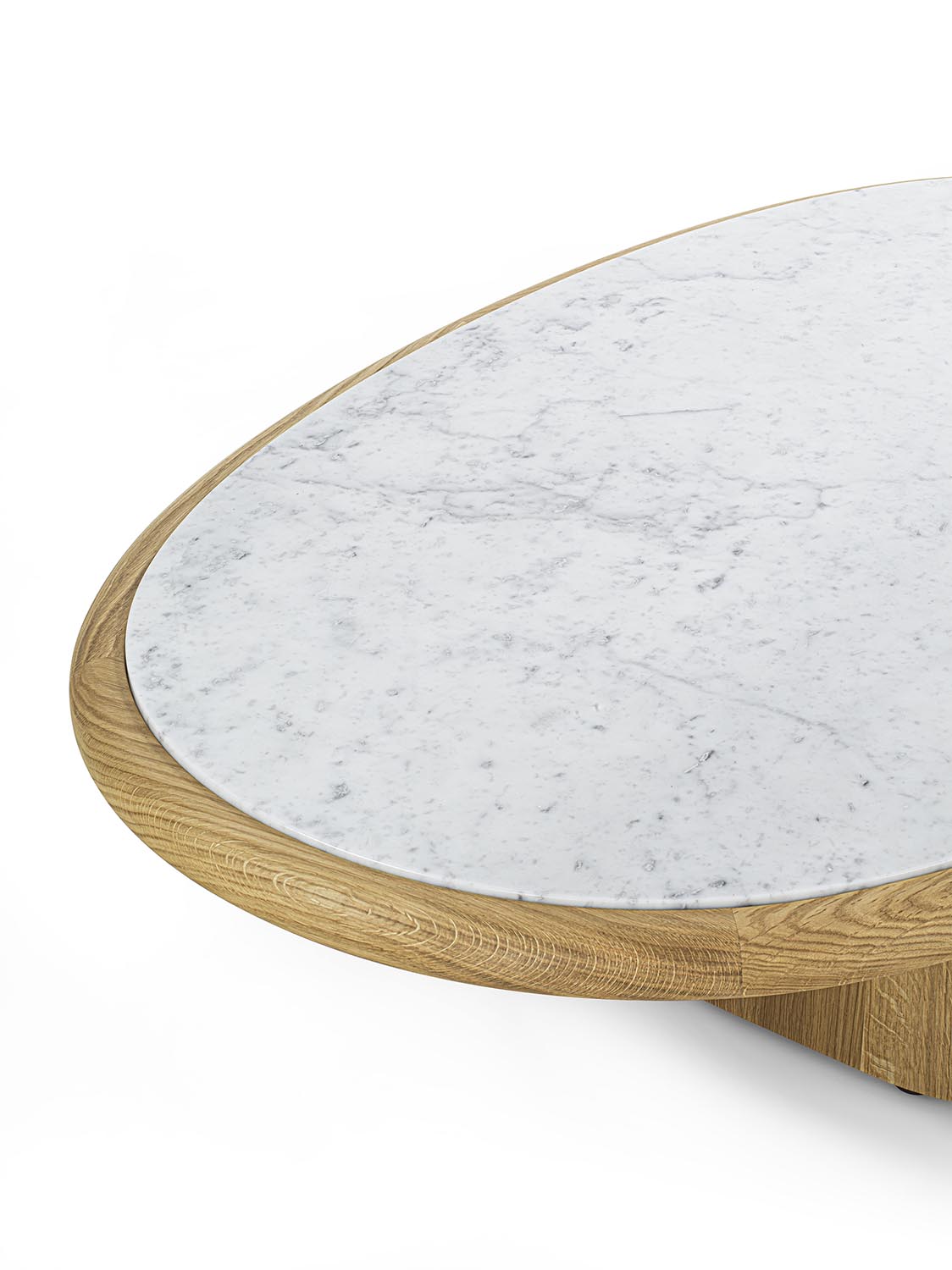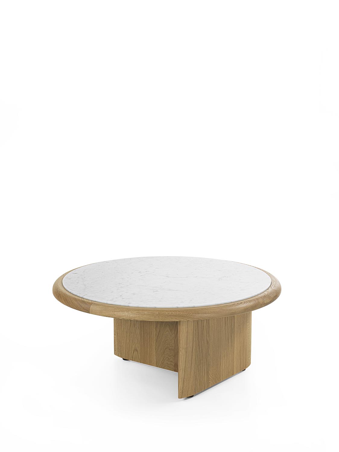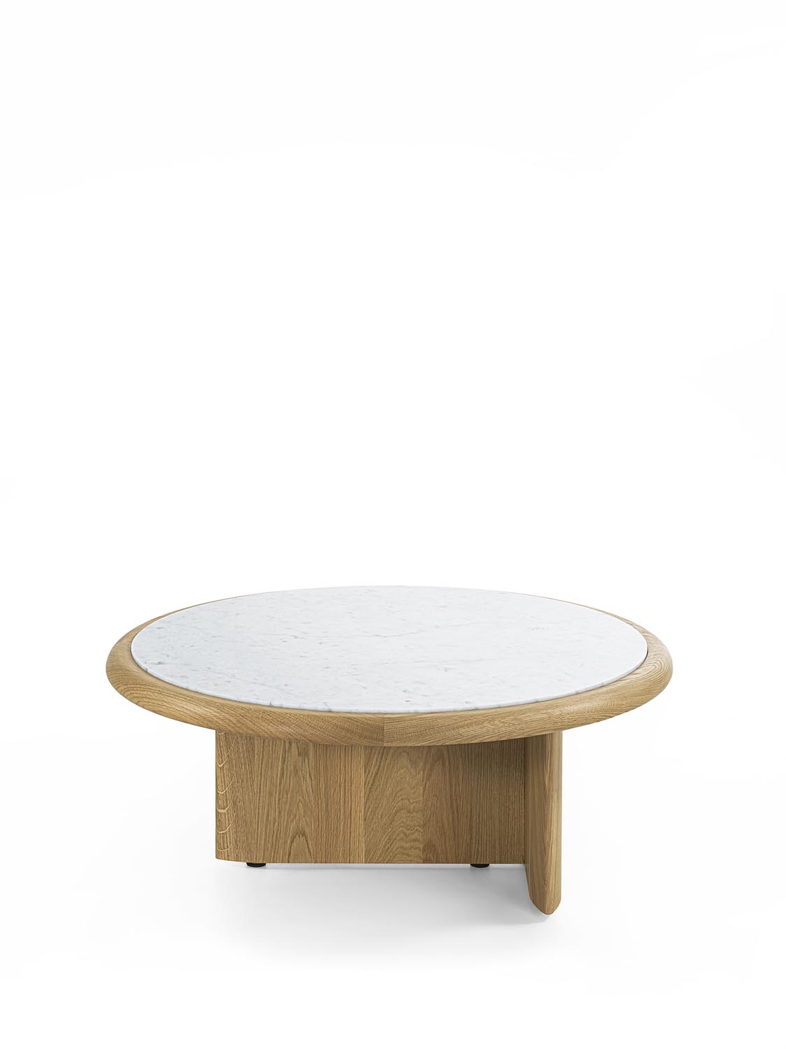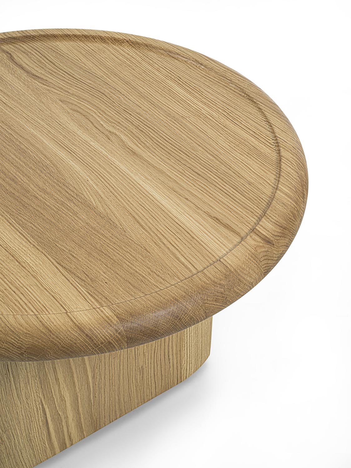 实木茶几,底座由彼此垂直布置的支撑构件组成,呈现出简约而富有雕塑感的结构。有不同高度版本可供选择;台面可为圆形或椭圆形,配大理石嵌件及木质外围框架,或全部采用实木制成。
