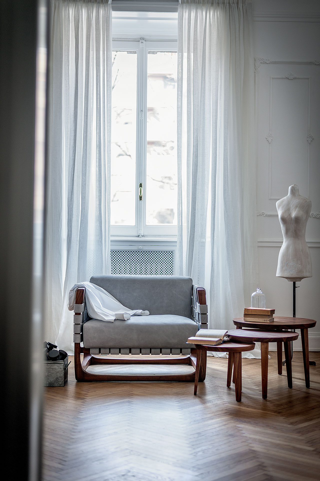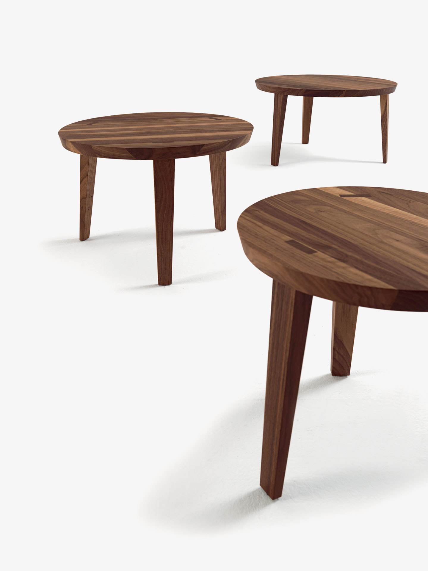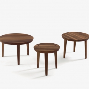 一系列由实木制成的小桌,有多种直径和高度可供选择,可相互叠放。桌腿贯穿台面,表面可见其分布。