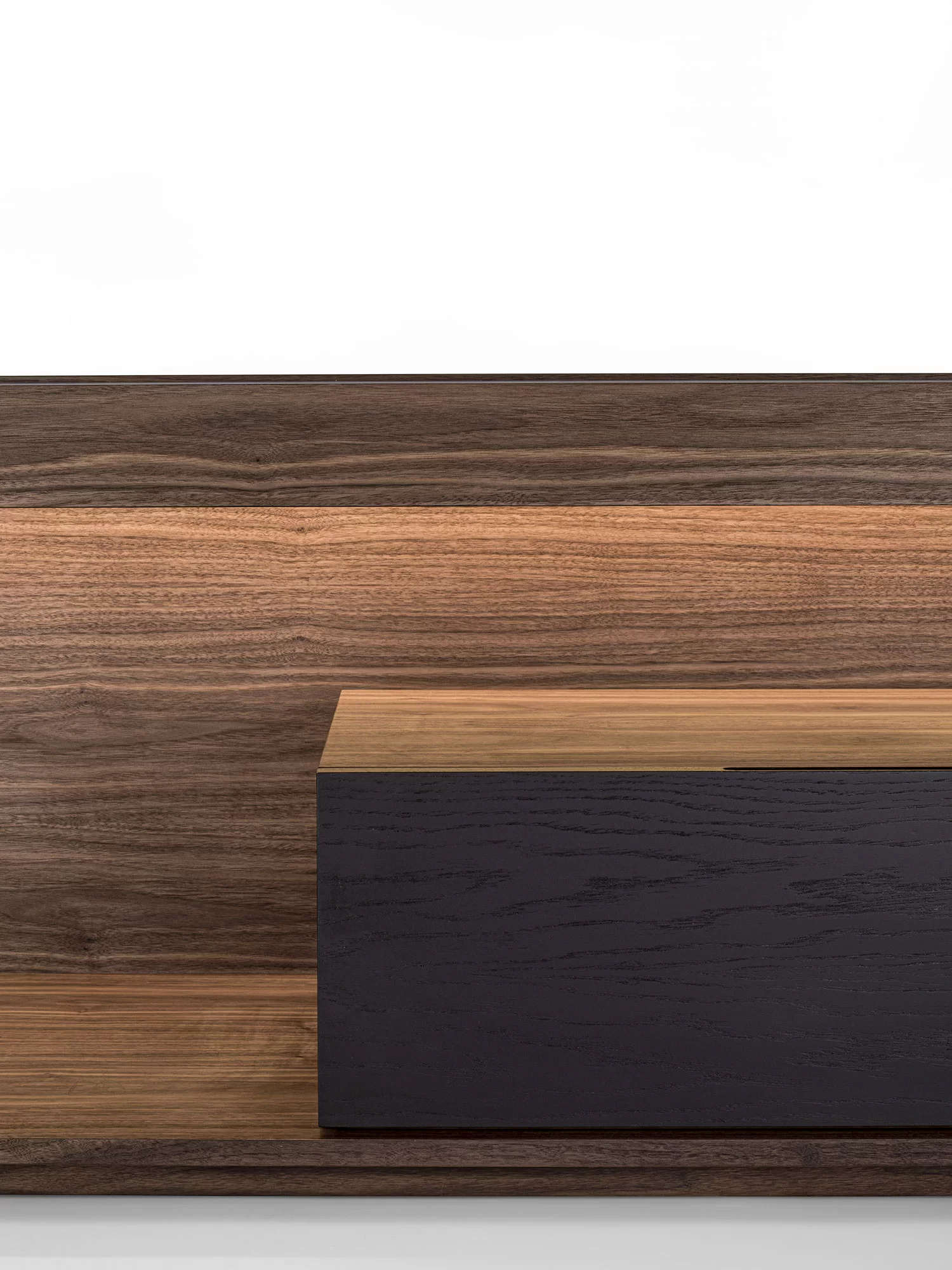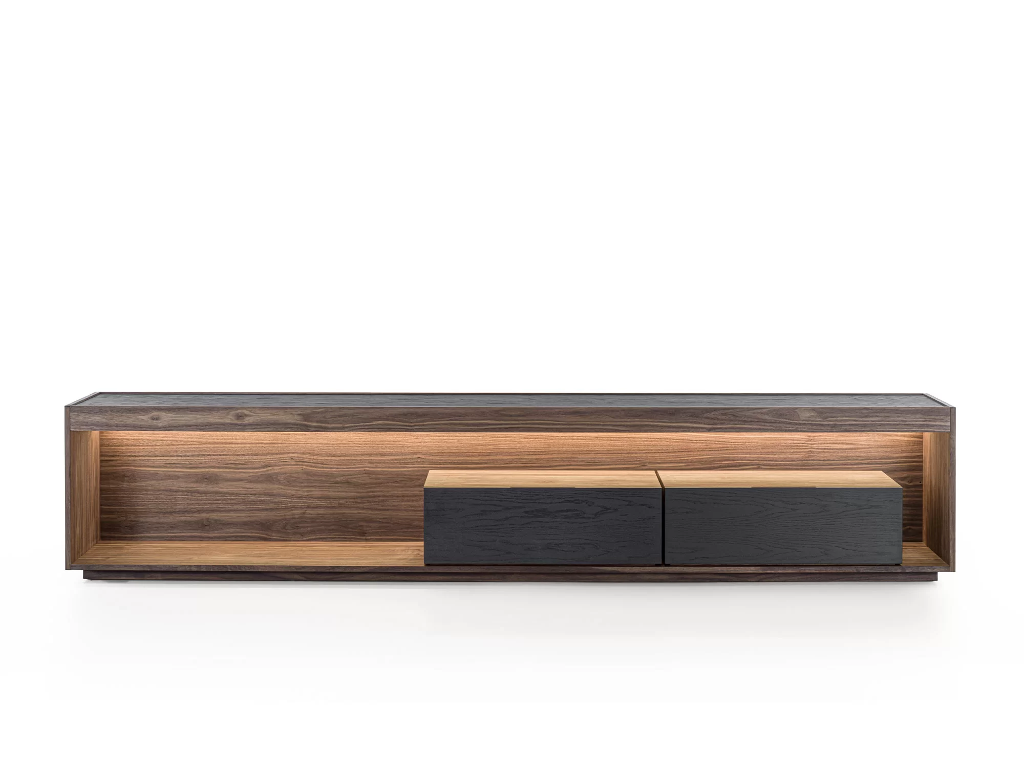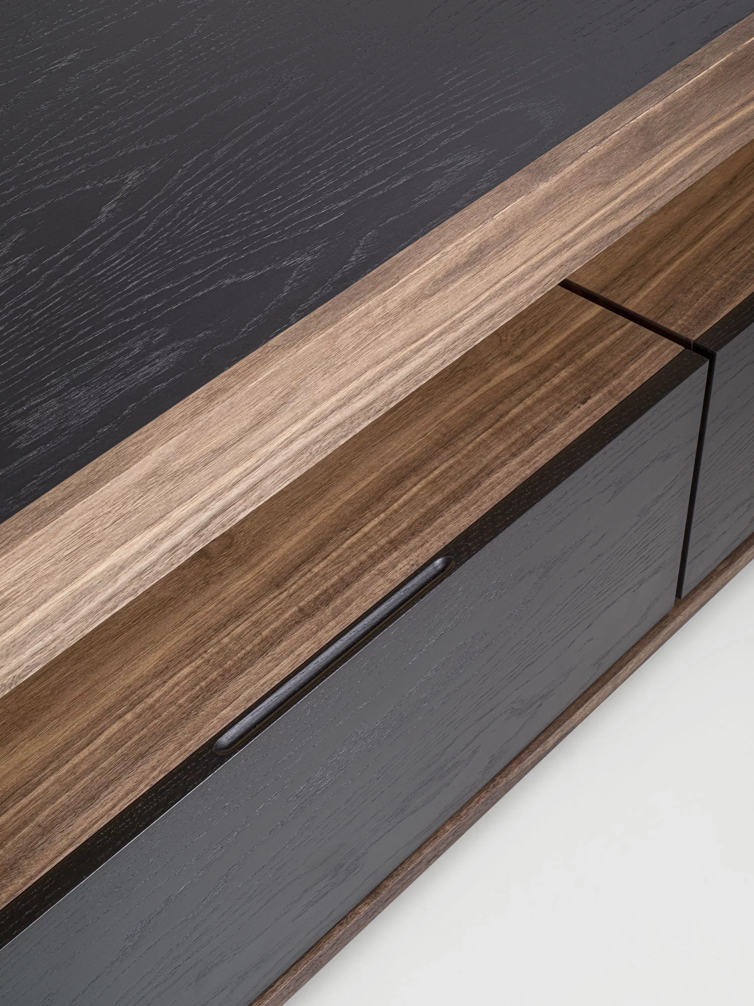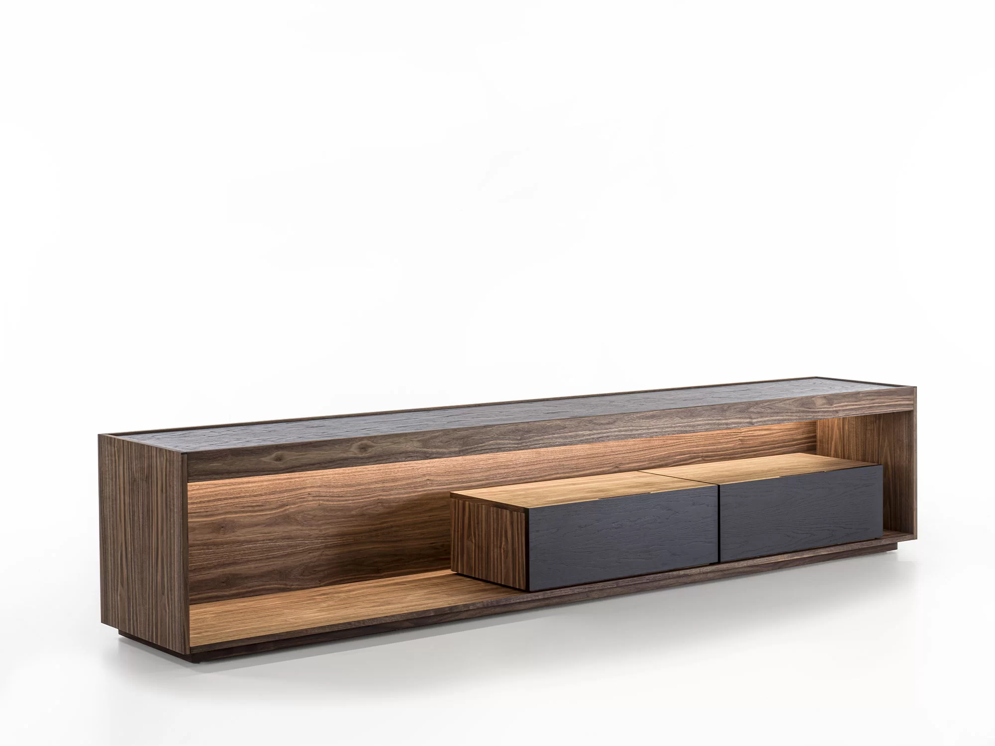 由原木和细木工板制成的边柜被木制结构包围,其特点是一个采用传统燕尾榫接合方式组装的抽屉。开放式隔间由LED灯照亮。