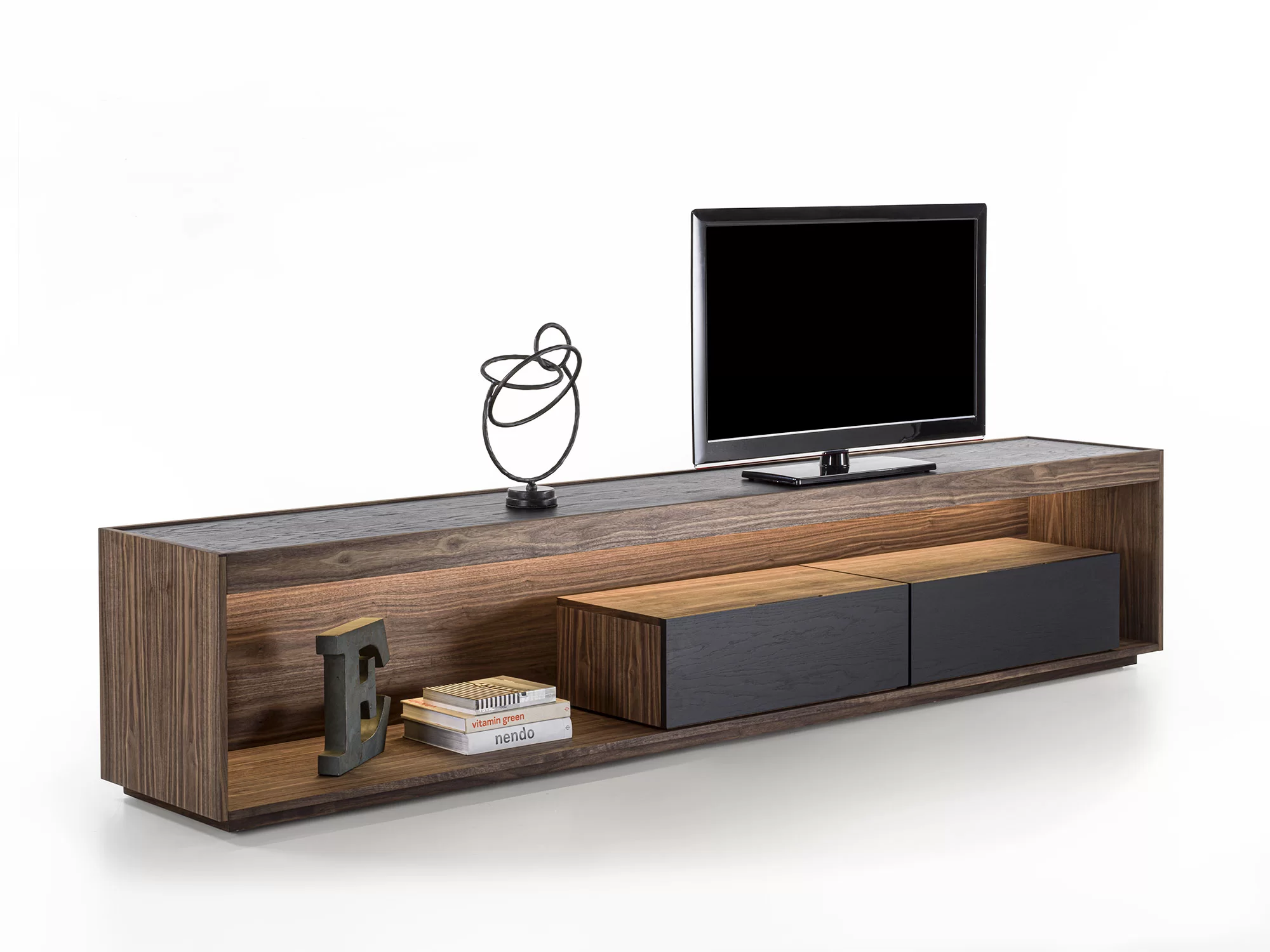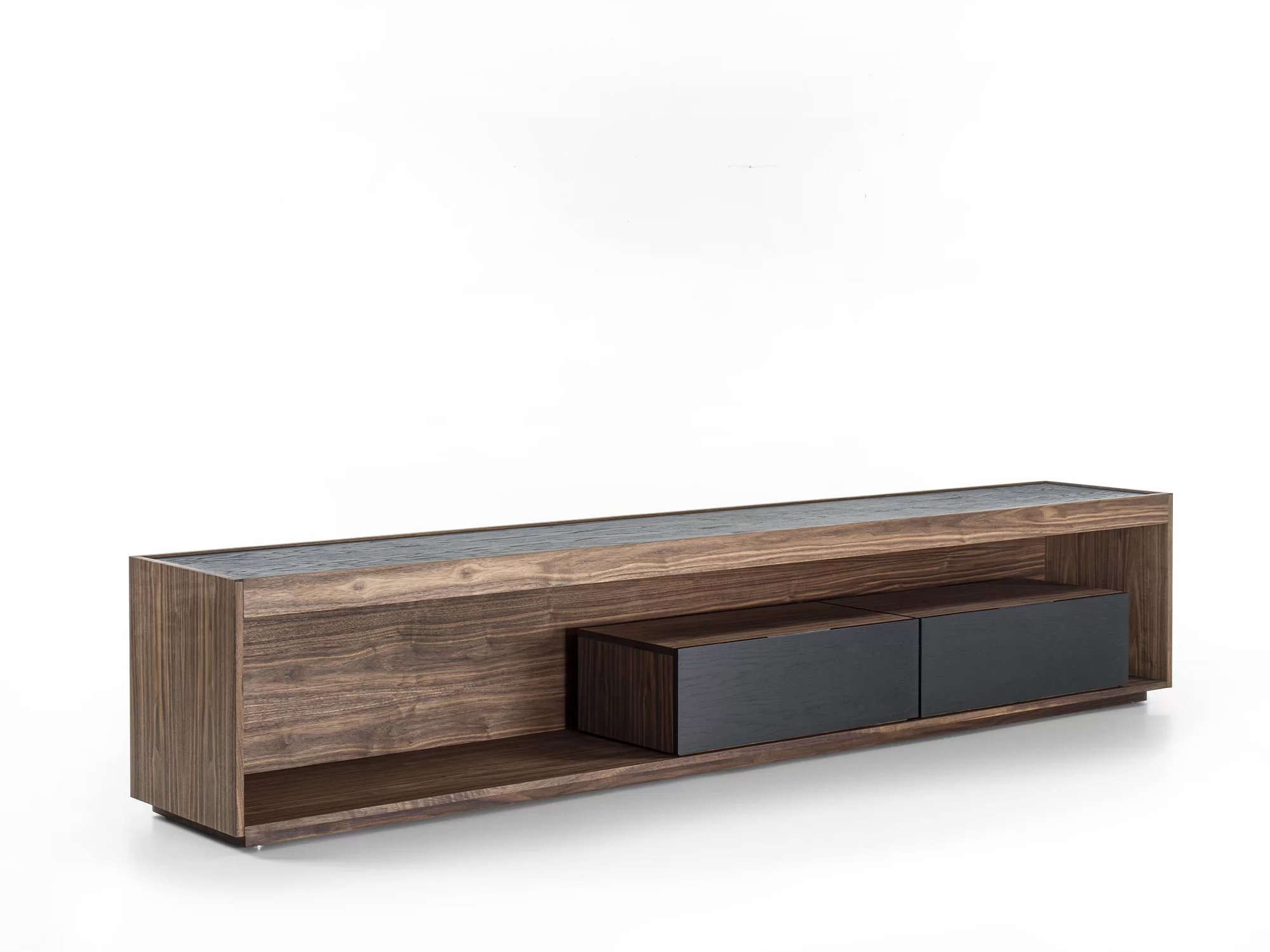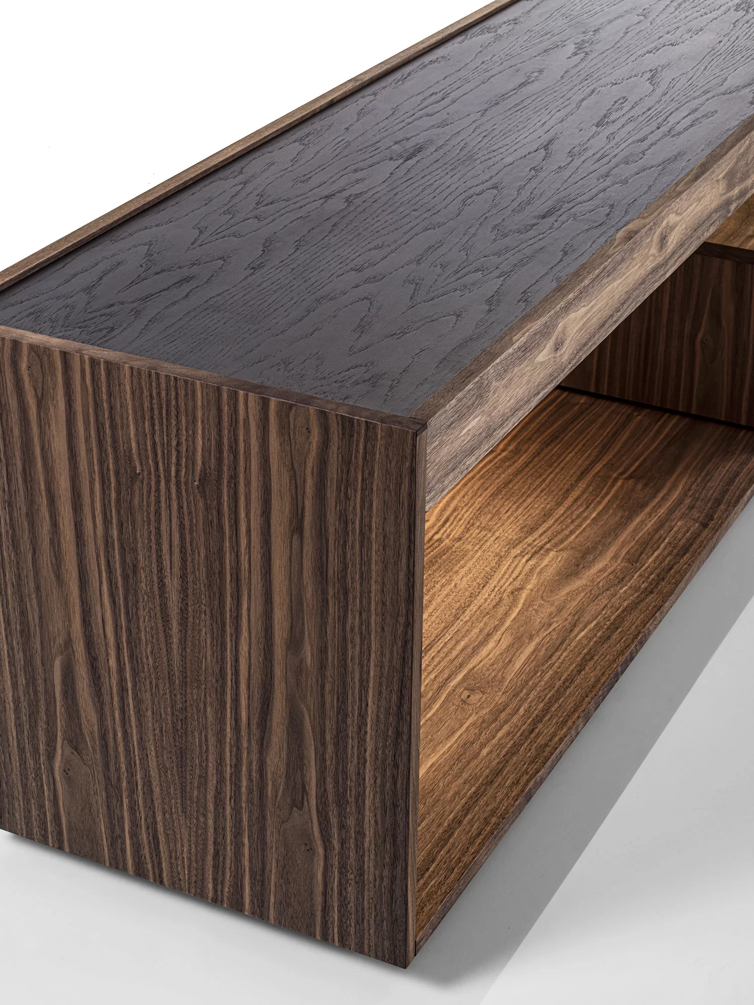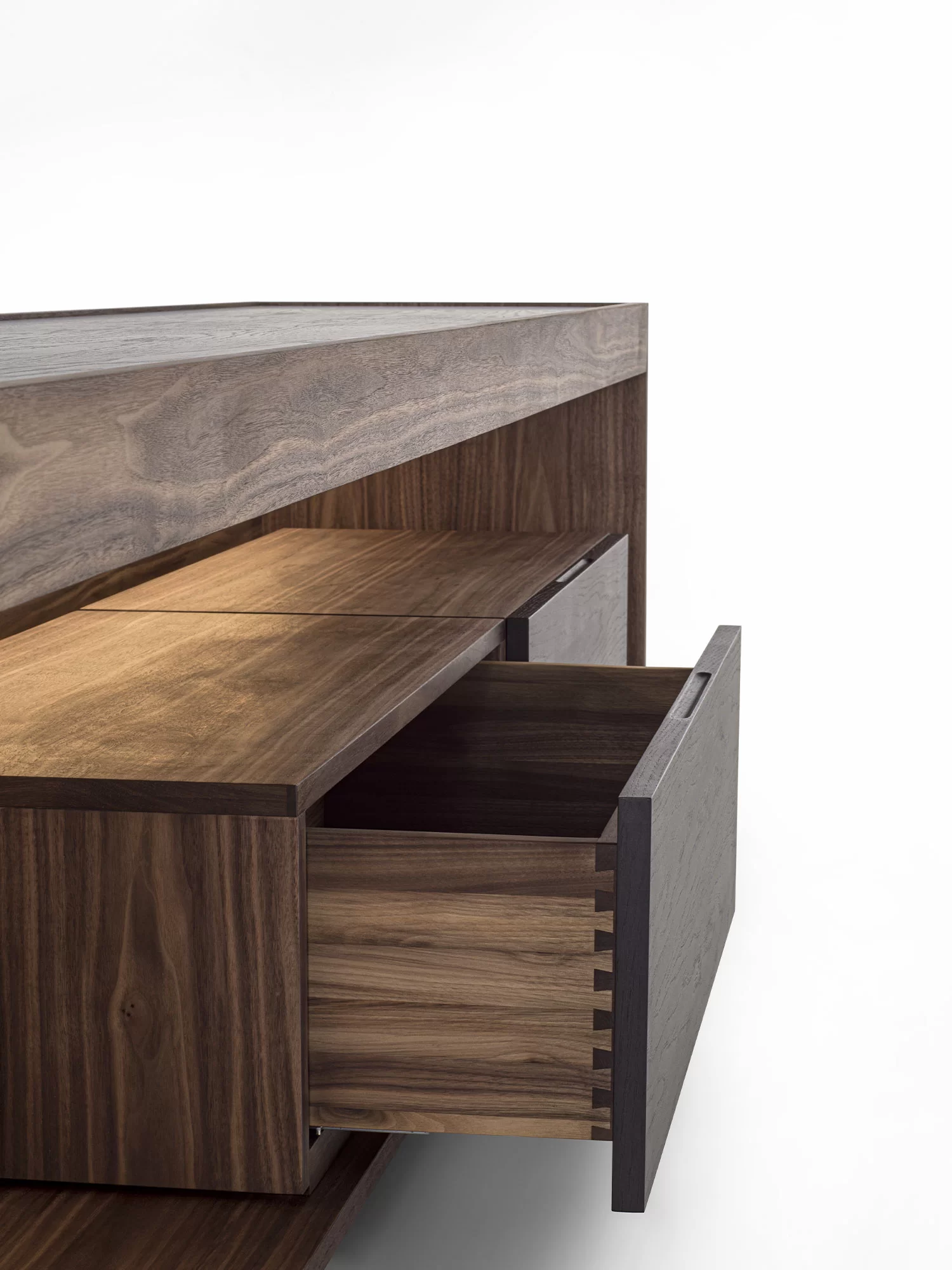 由原木和细木工板制成的边柜被木制结构包围,其特点是一个采用传统燕尾榫接合方式组装的抽屉。开放式隔间由LED灯照亮。