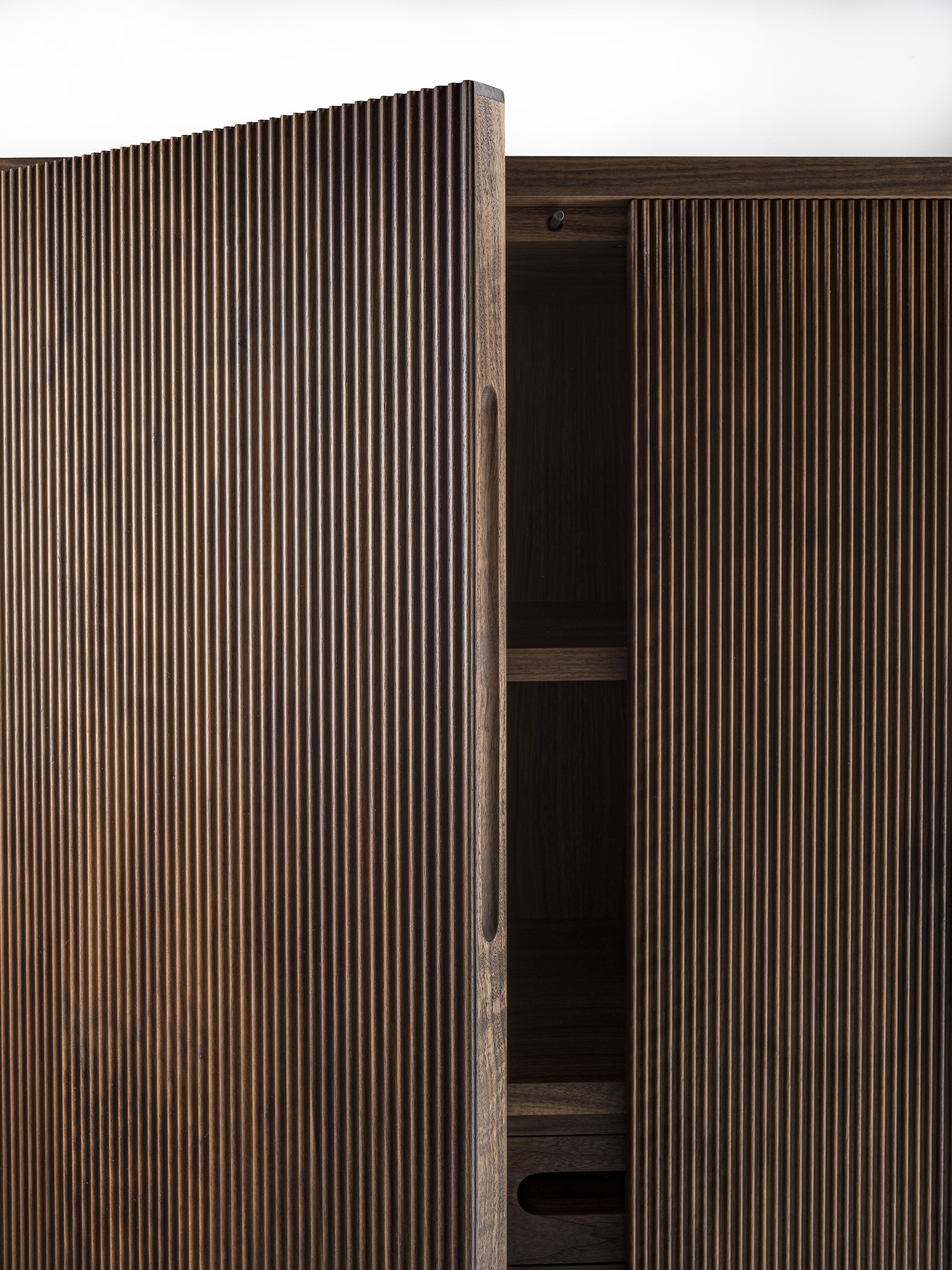 是一款高大的实木和木板制成的橱柜,其顶部被包含在一个边框内,内部有使用传统的燕尾榫拼接的架子和抽屉,并配有拉手。橱柜有两个推拉式门,采用按压式开门方式。门纵向经过Fresart工艺特殊处理,营造出现代动态的几何效果。