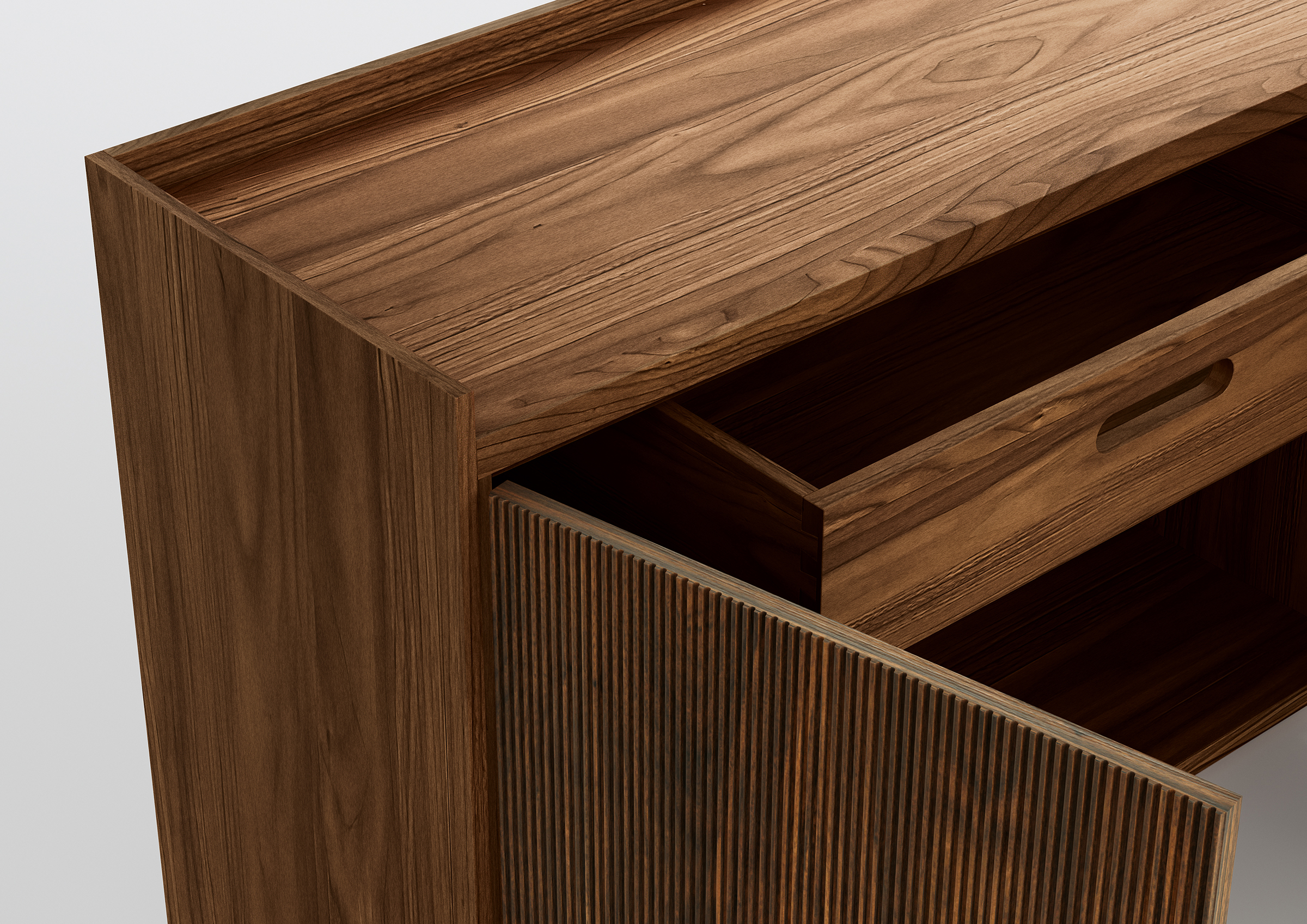 抽屉柜由细木工板和实木制成,带有外框,台面嵌入其中。抽屉以传统燕尾榫接头组装而成,并带有凹槽手柄。正面采用Fresart垂直条纹工艺处理,营造出现代而动感的几何效果。