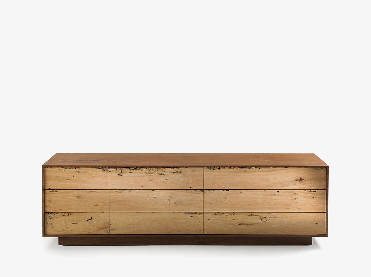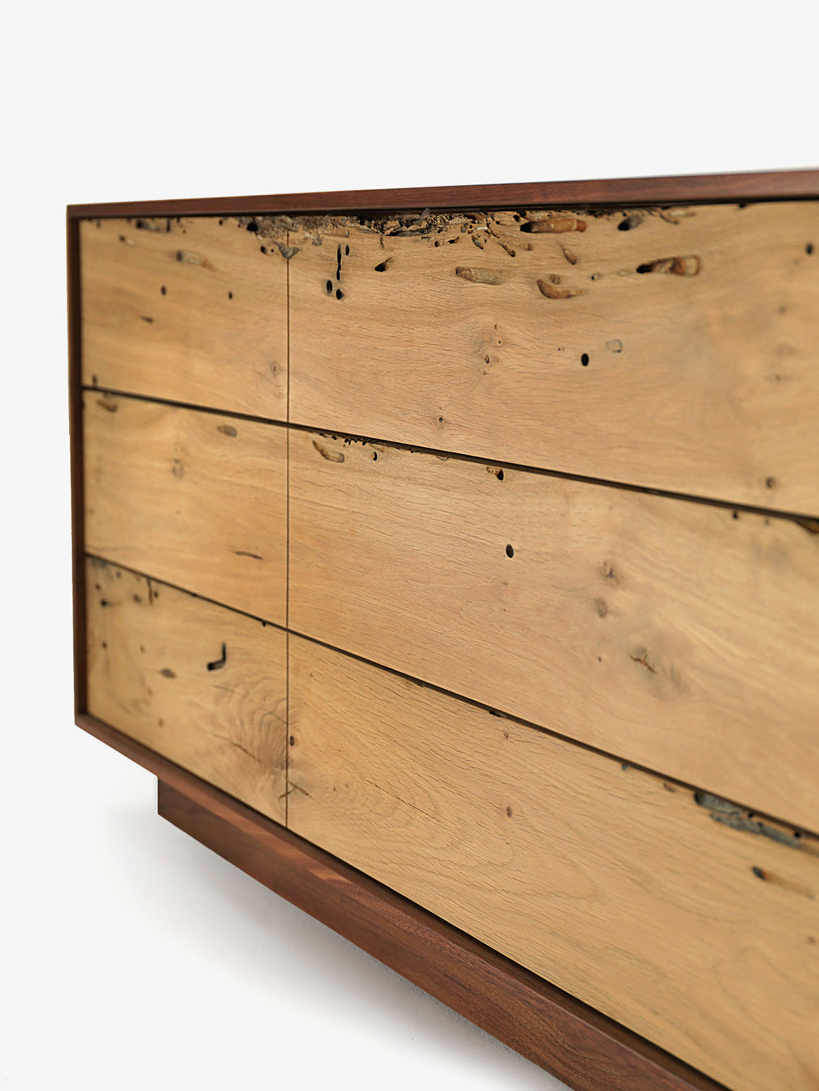 边柜采用实木和细木工板制成,带铁制或木制外框,抽屉采用燕尾榫接缝工艺组装而成。