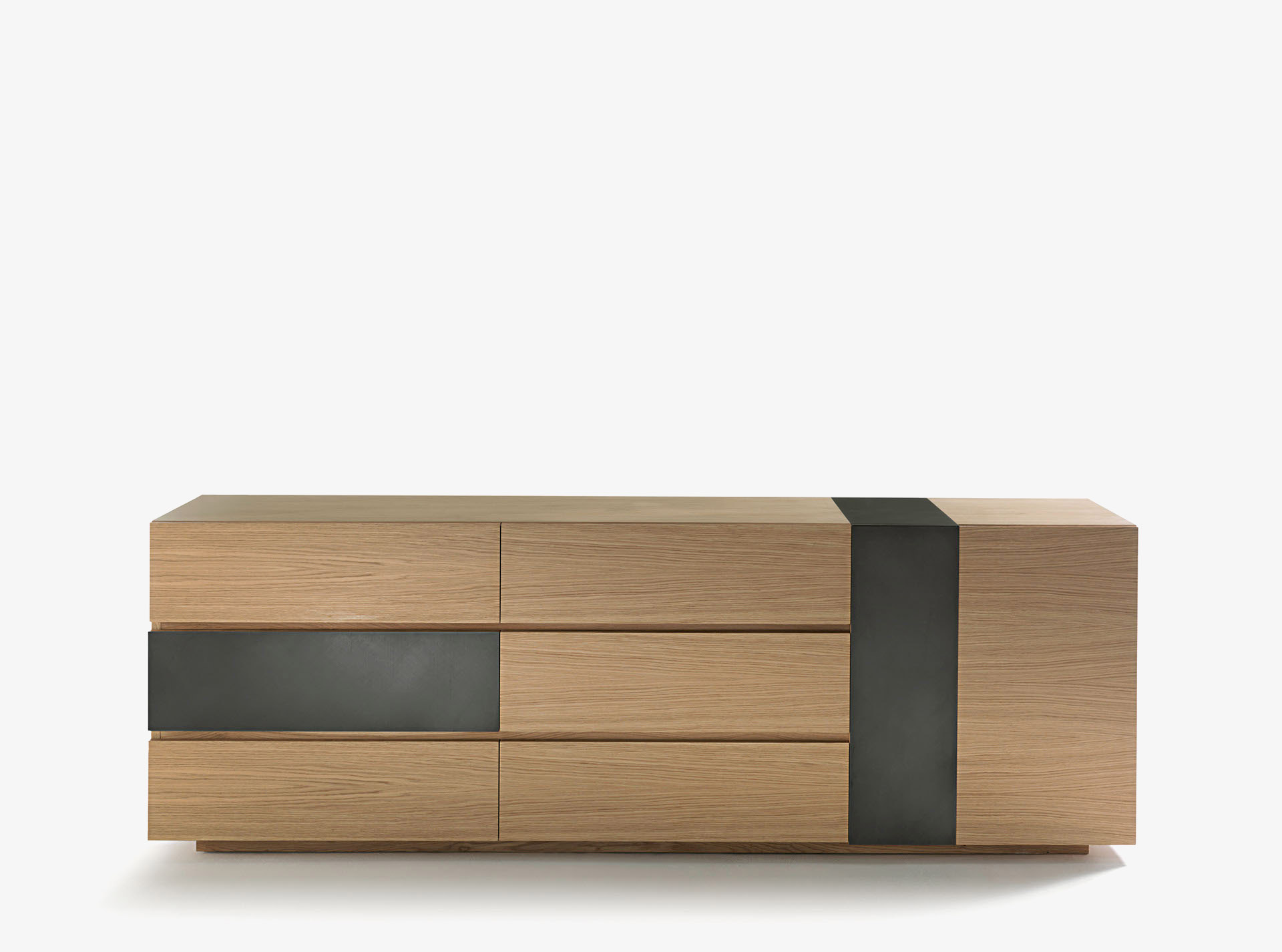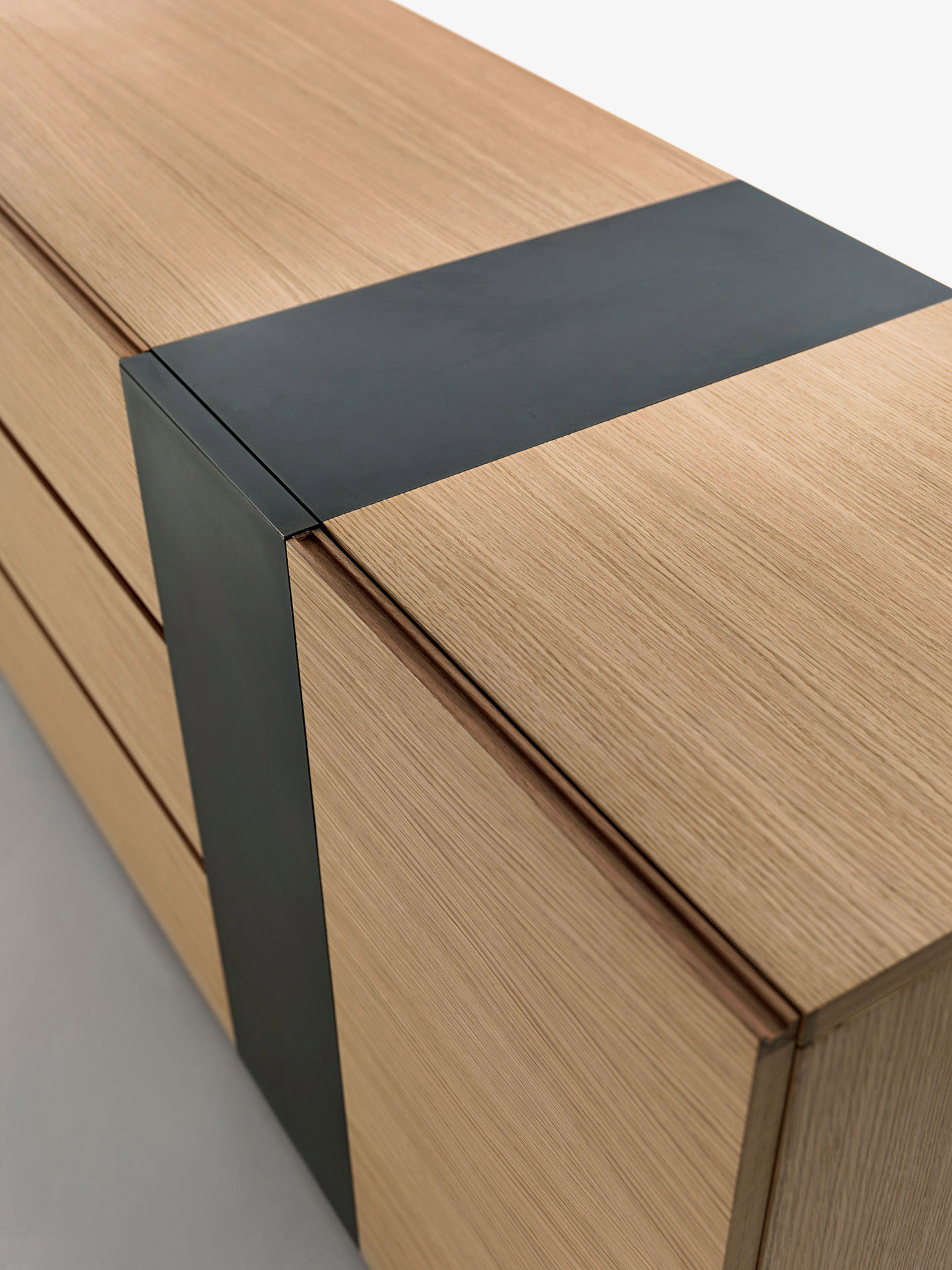 "边柜采用实木和细木工板打造,带有个性铁制嵌件,柜门和抽屉设有凹槽手柄,抽屉采用传统燕尾榫接头组装。