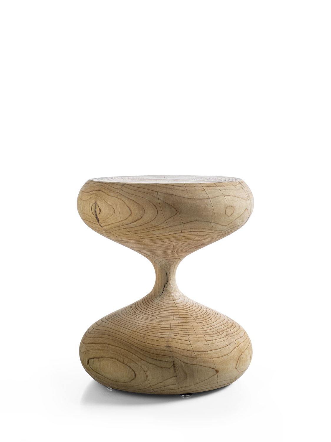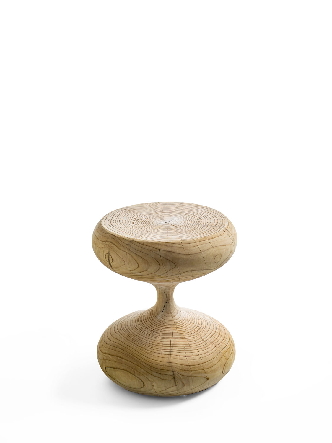 这款凳子由整块实心香雪松木雕刻而成,灵感源自吹制玻璃沙漏的柔美曲线,其中部略显纤细的连接处,实则是稳固结构的核心。