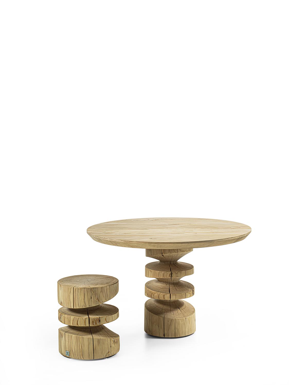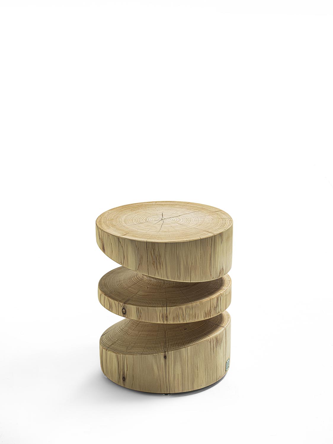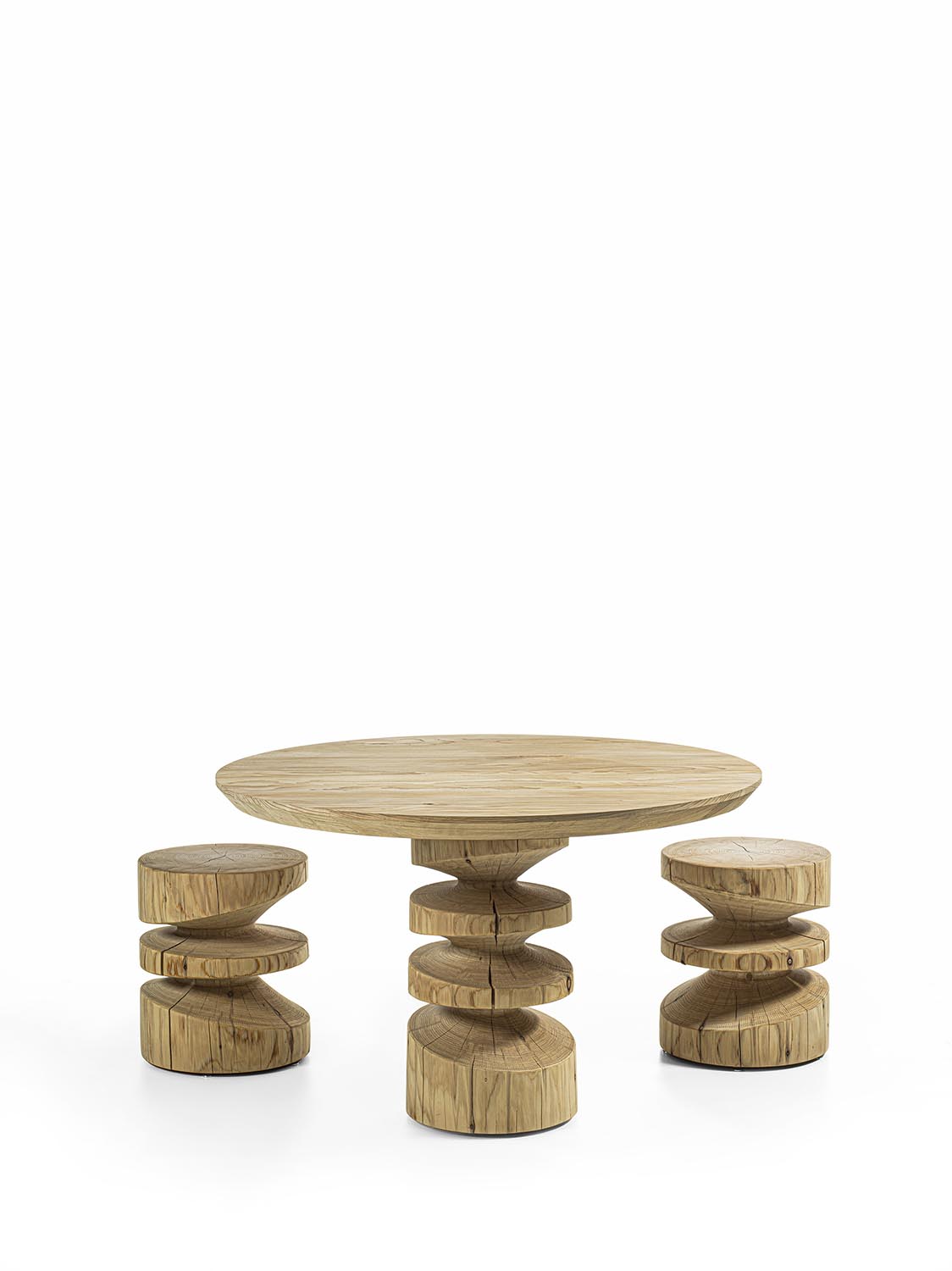 高脚凳采用整块雪松实木雕制而成,其设计灵感源自龙卷风的形态,呈现出层层叠加的几何体结构。由此产生的对比交错效果,勾勒出兼具强烈材质感与造型感的雕塑式支撑。