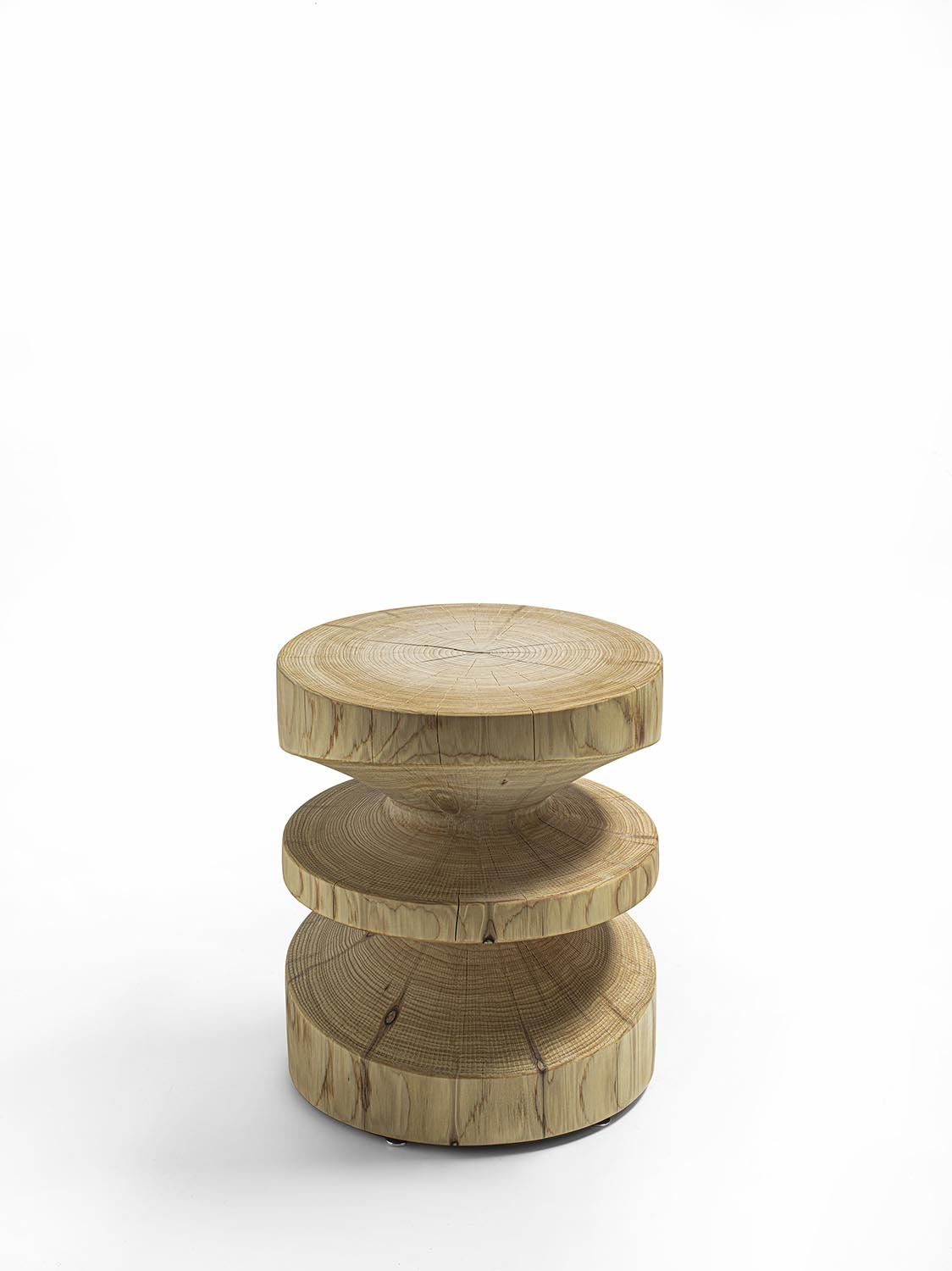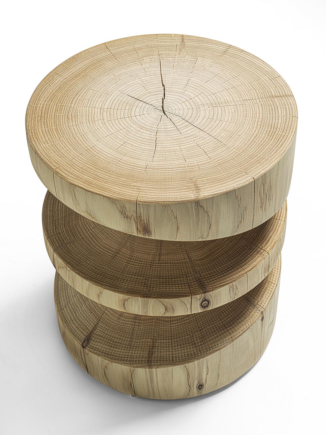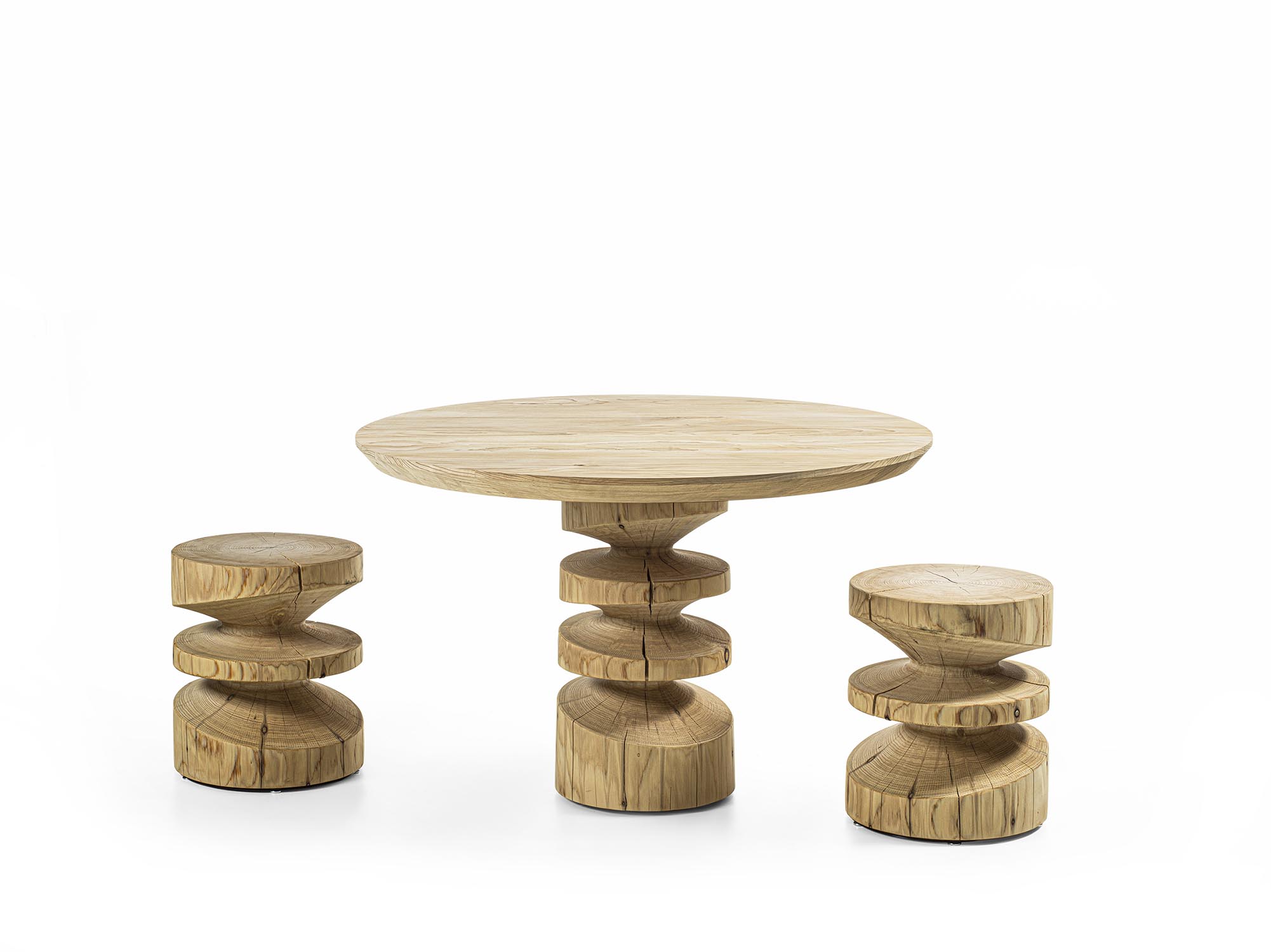 高脚凳采用整块雪松实木雕制而成,其设计灵感源自龙卷风的形态,呈现出层层叠加的几何体结构。由此产生的对比交错效果,勾勒出兼具强烈材质感与造型感的雕塑式支撑。