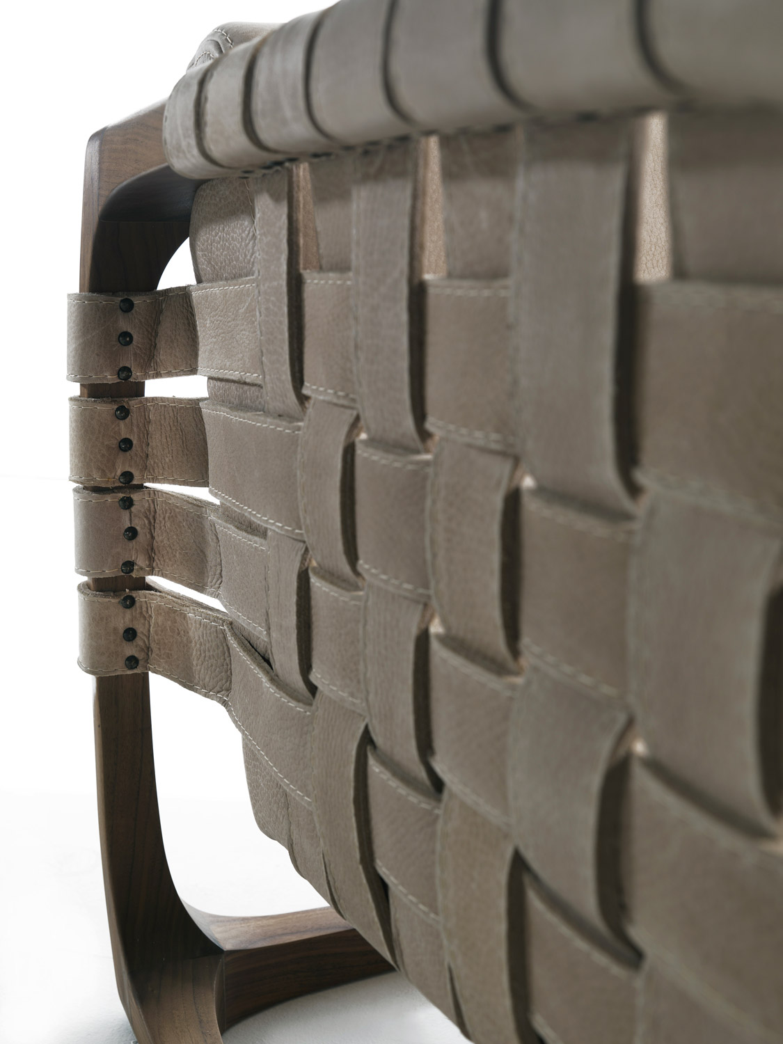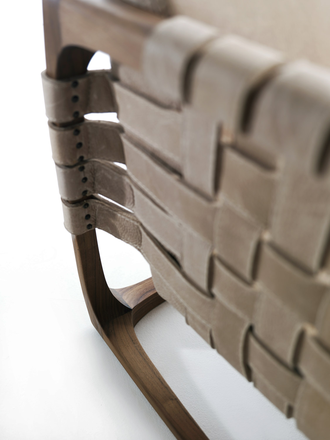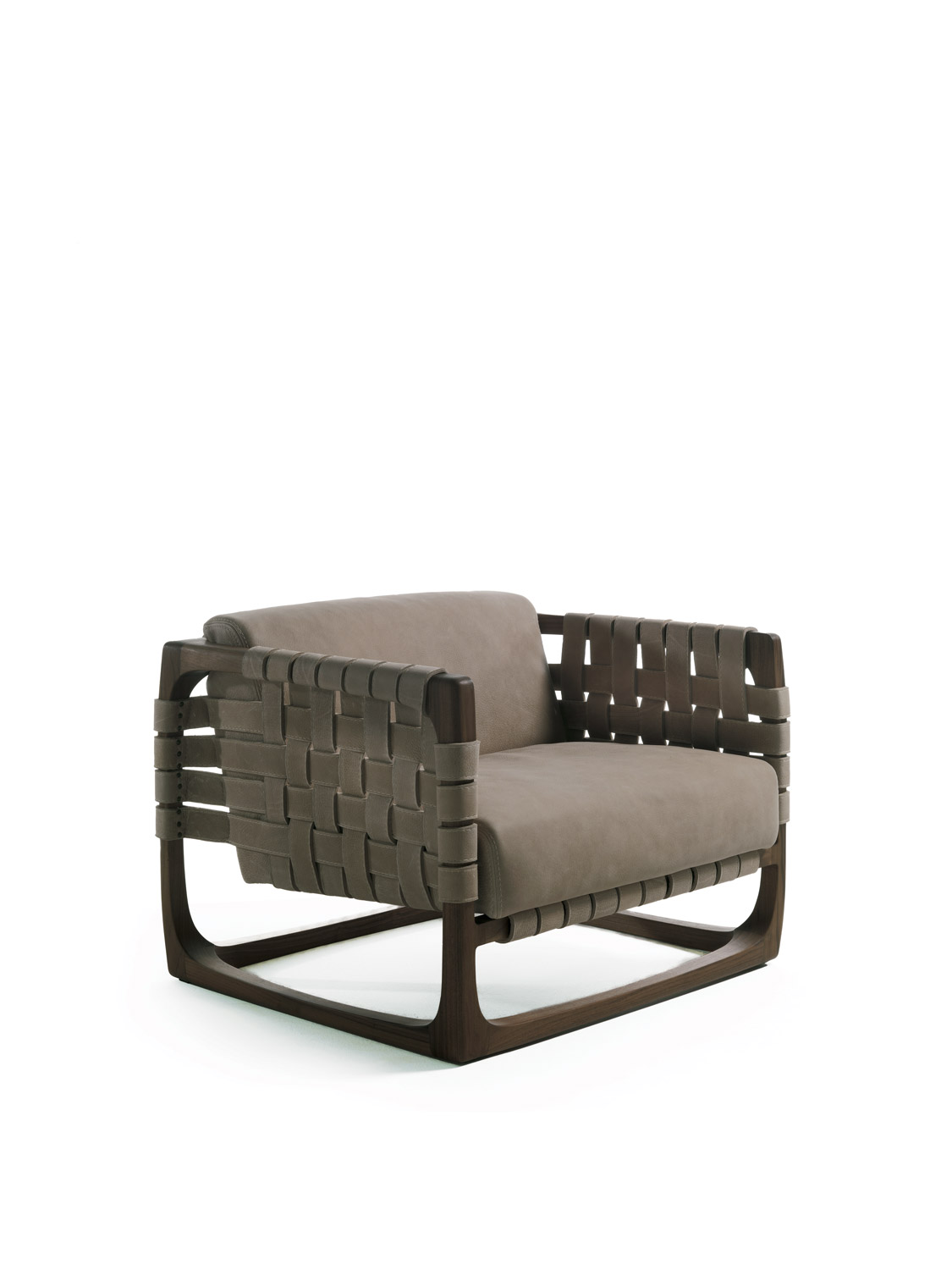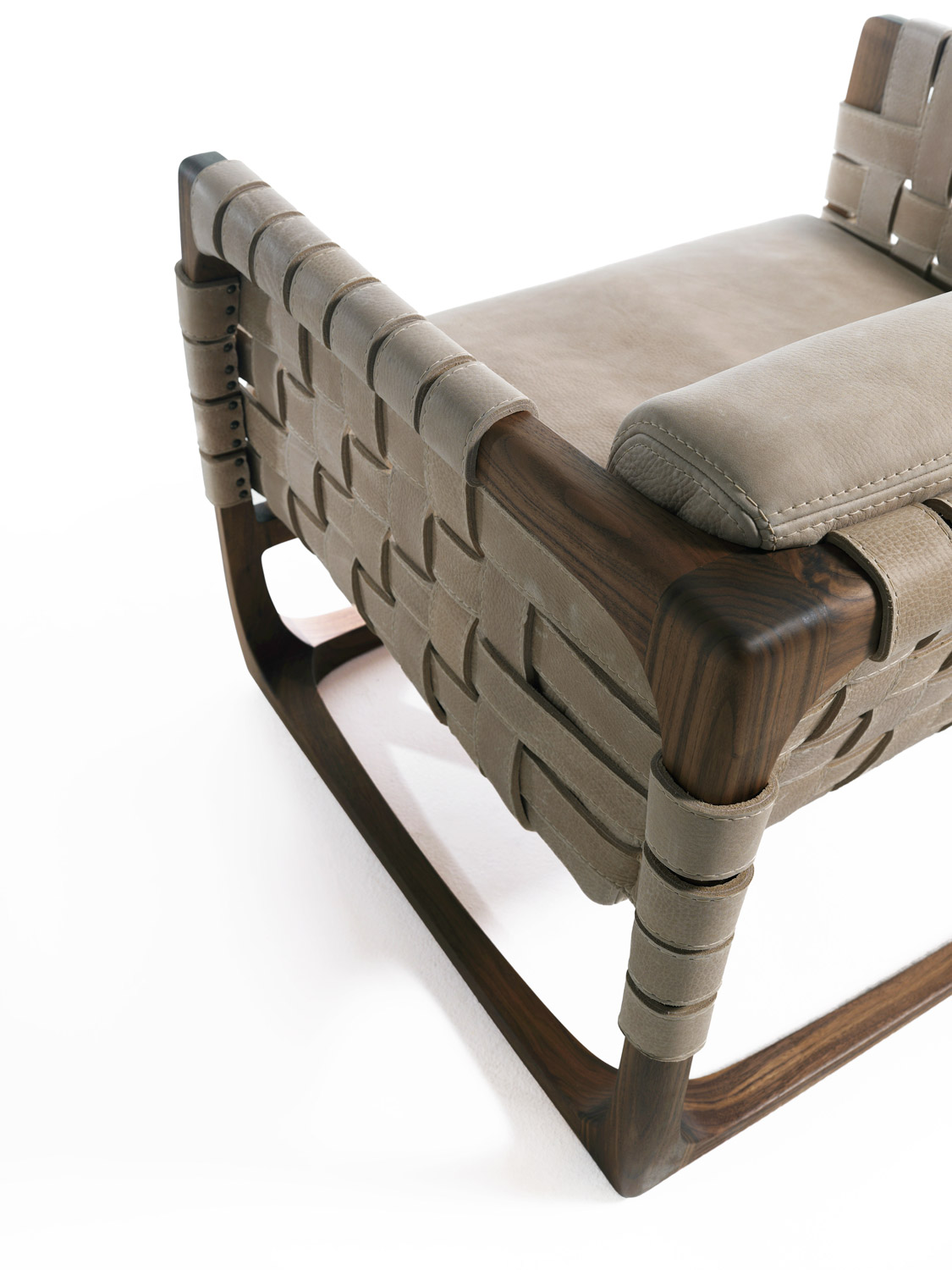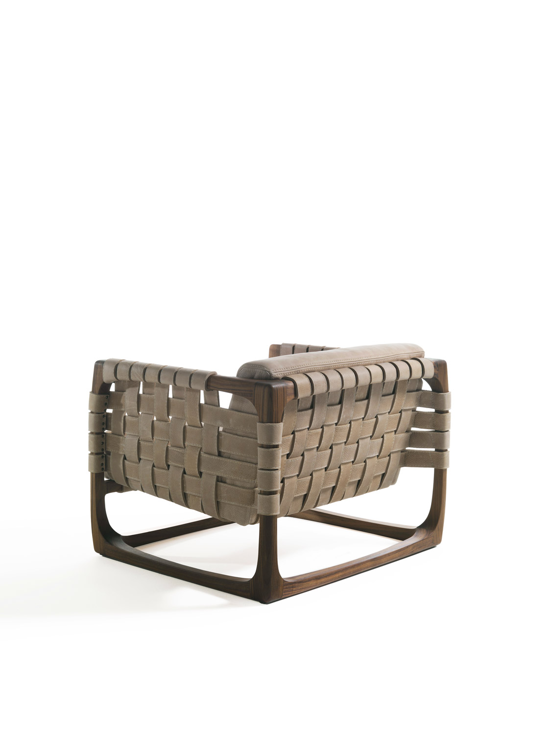 扶手椅带软垫,采用实木结构,全手工制作、组装、打磨而成。其独具创意的细节在于由皮革带或织物带编织而成的椅座、椅背和扶手。当编织带为织物时,其内部有结构性支撑。