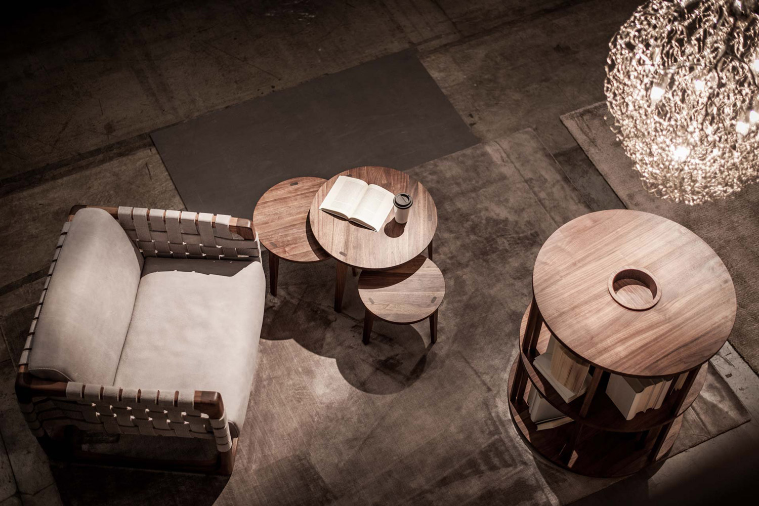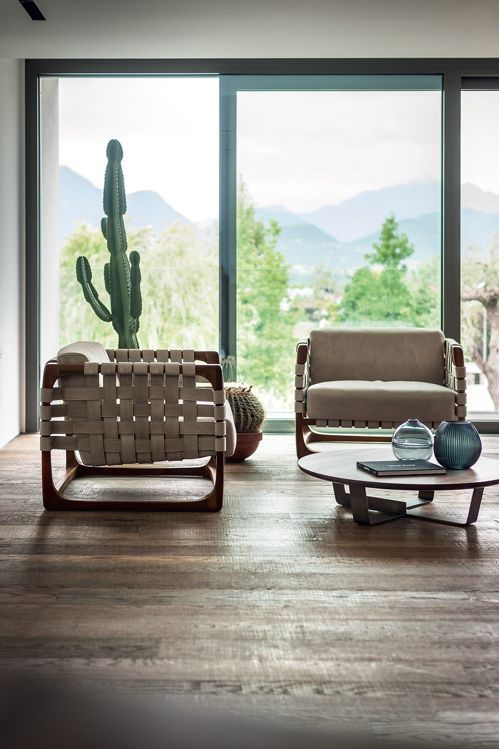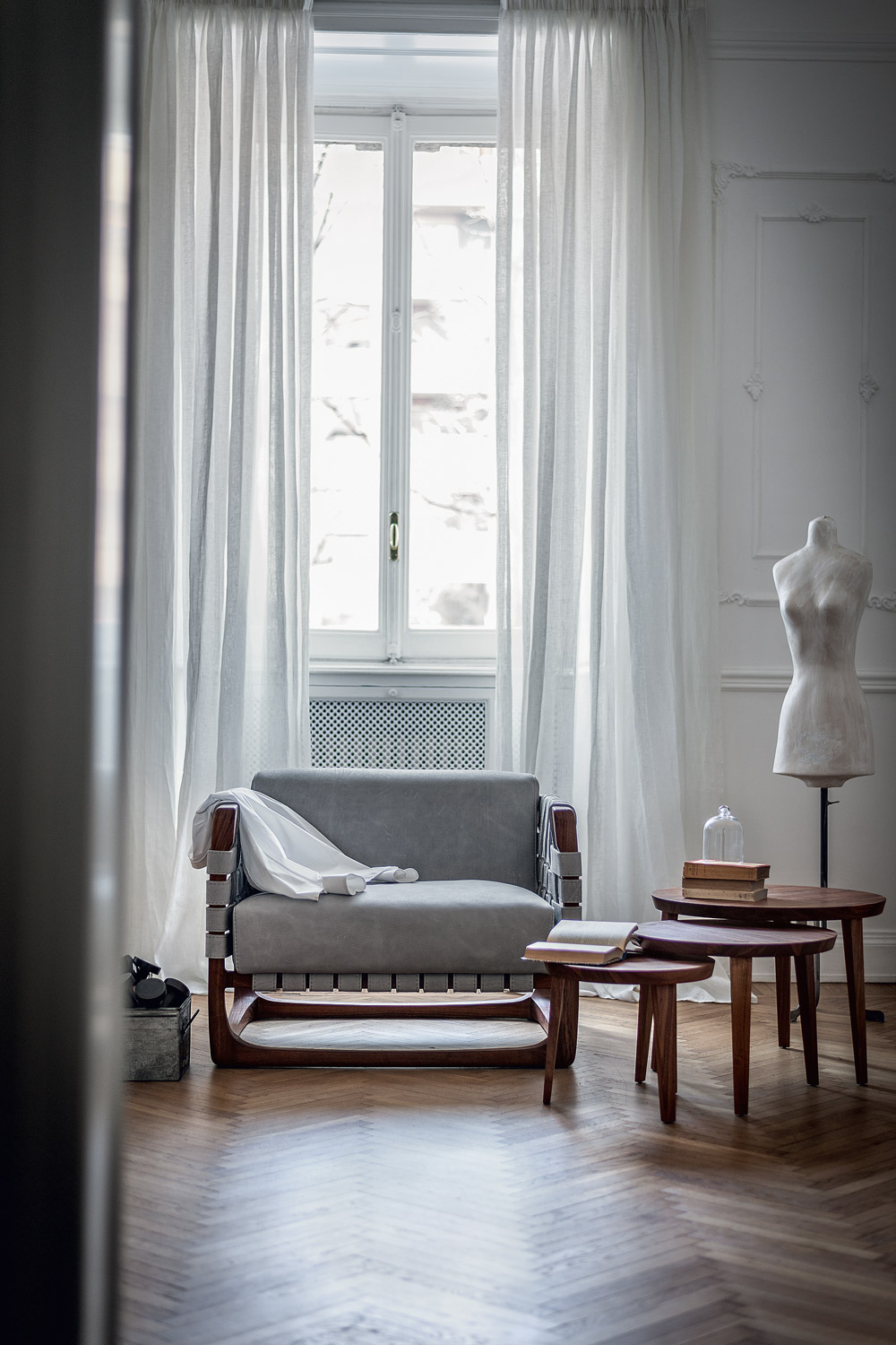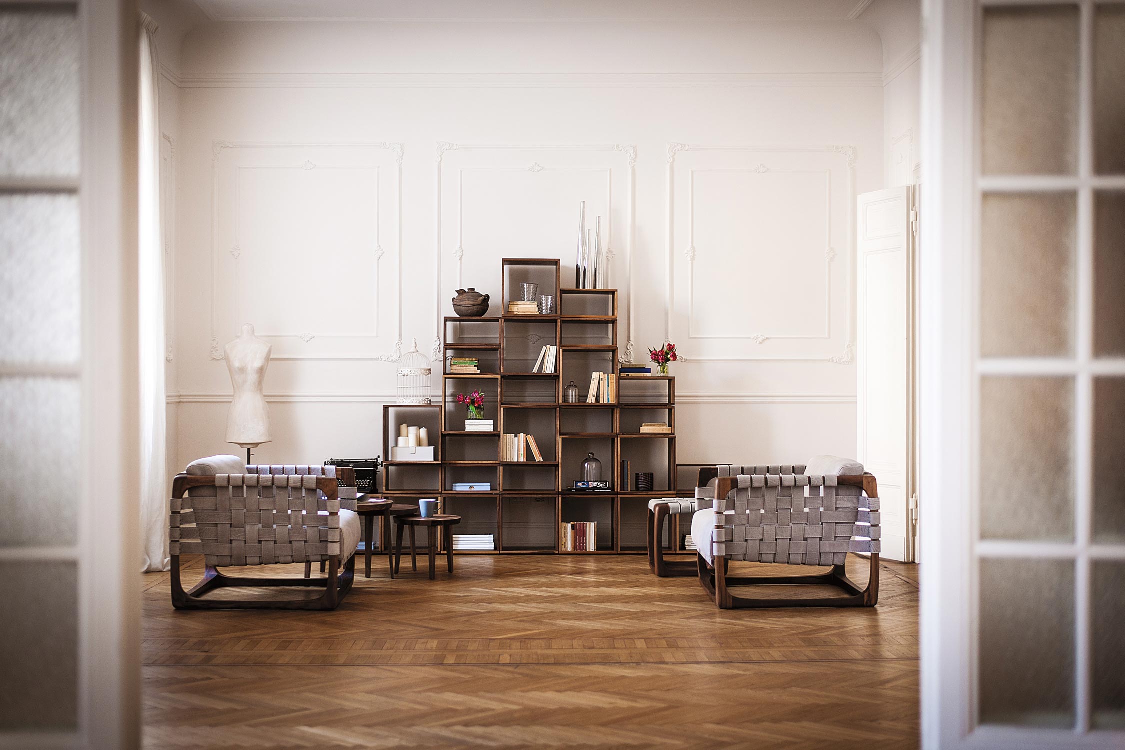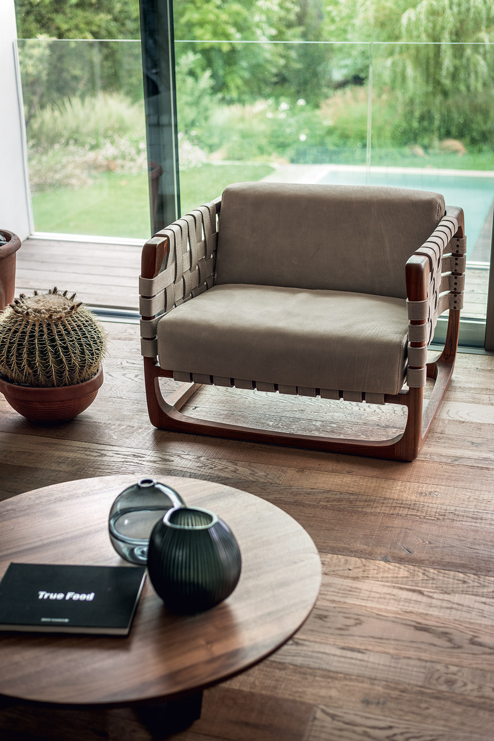 扶手椅带软垫,采用实木结构,全手工制作、组装、打磨而成。其独具创意的细节在于由皮革带或织物带编织而成的椅座、椅背和扶手。当编织带为织物时,其内部有结构性支撑。