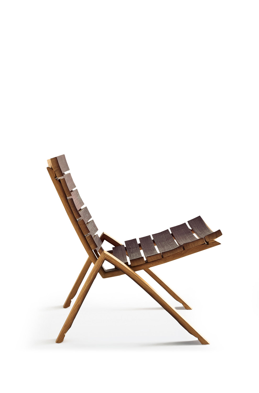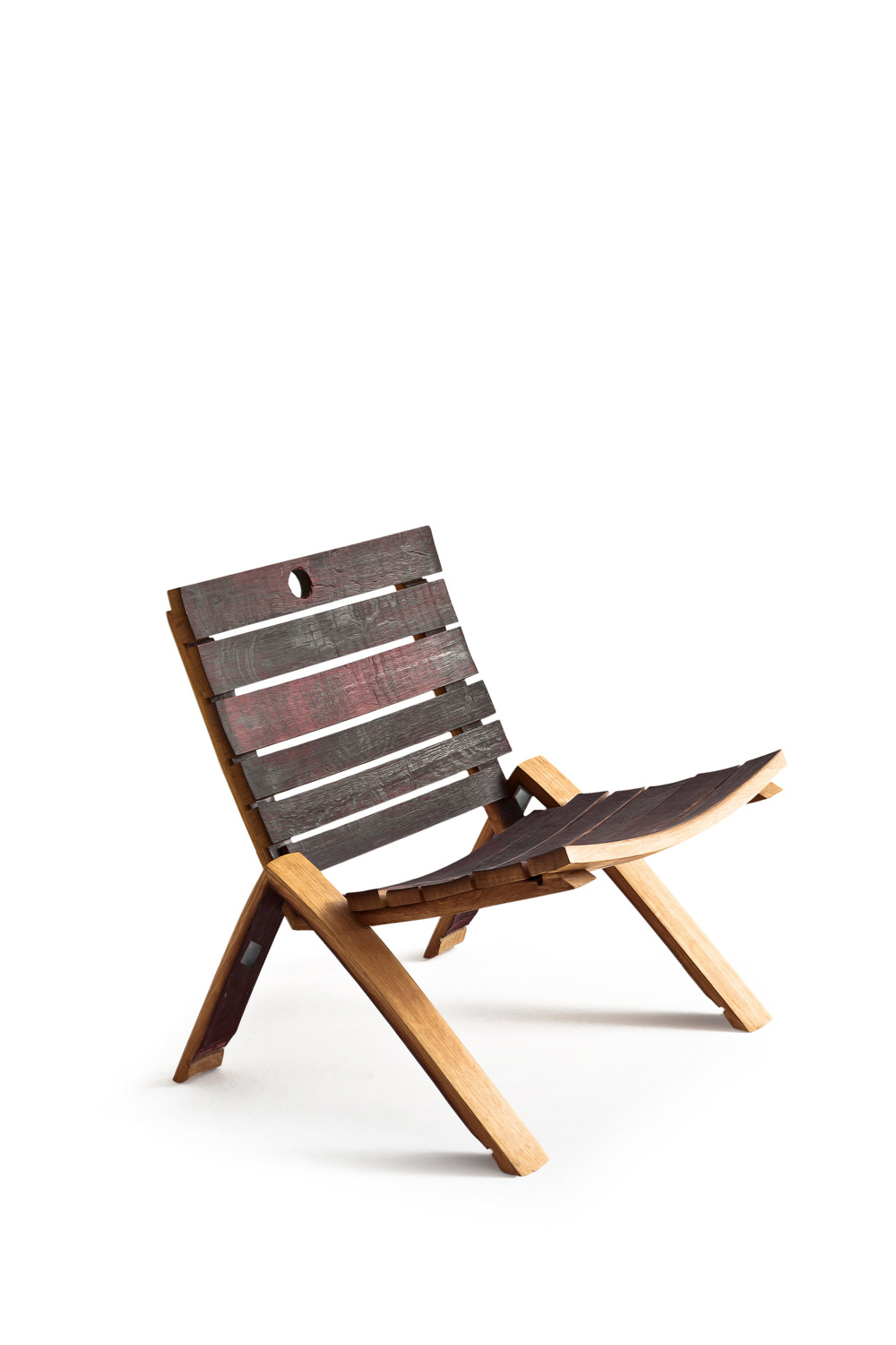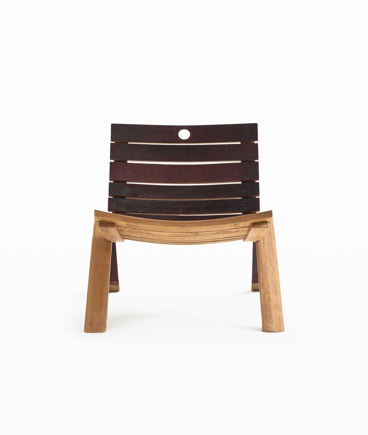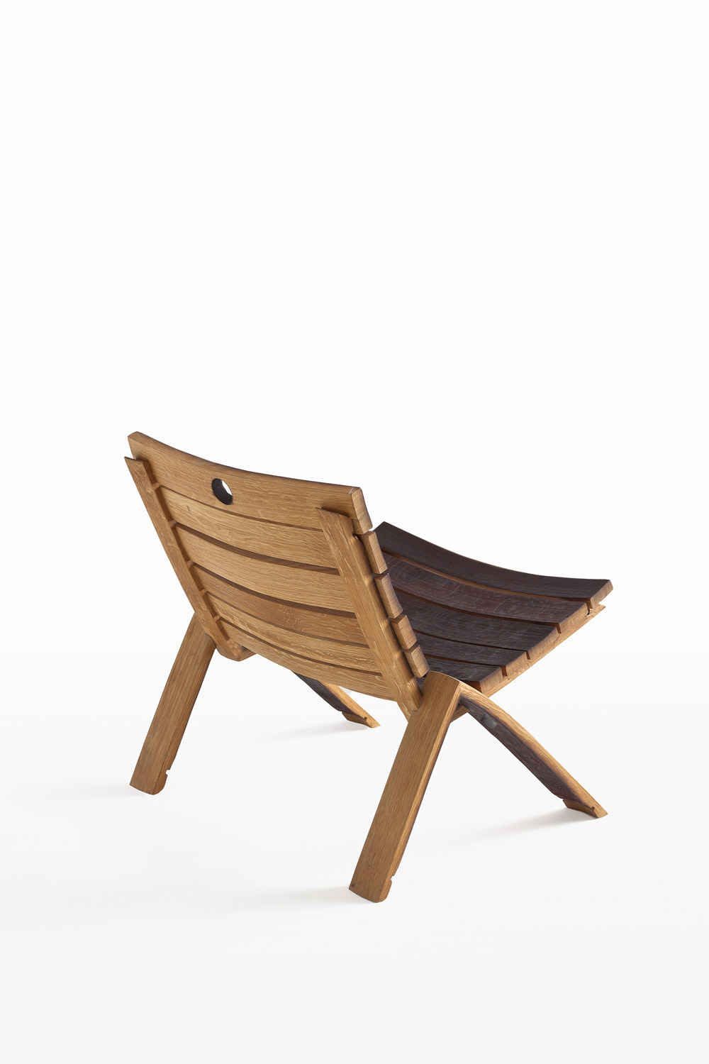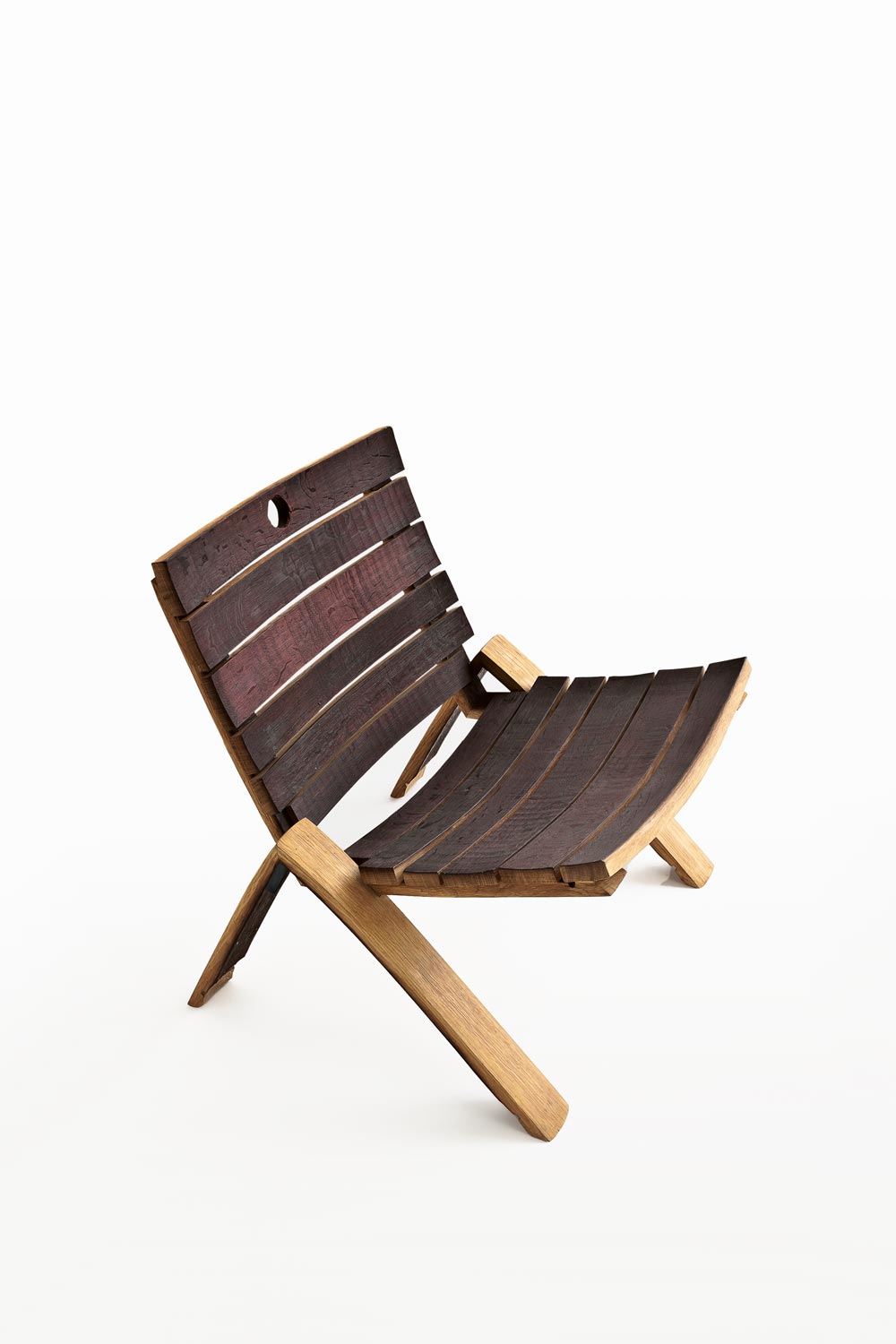 扶手椅完全由橡木酒桶的板条拼接而成。其底座呈倒“V”形,由两块桶板对接而成。