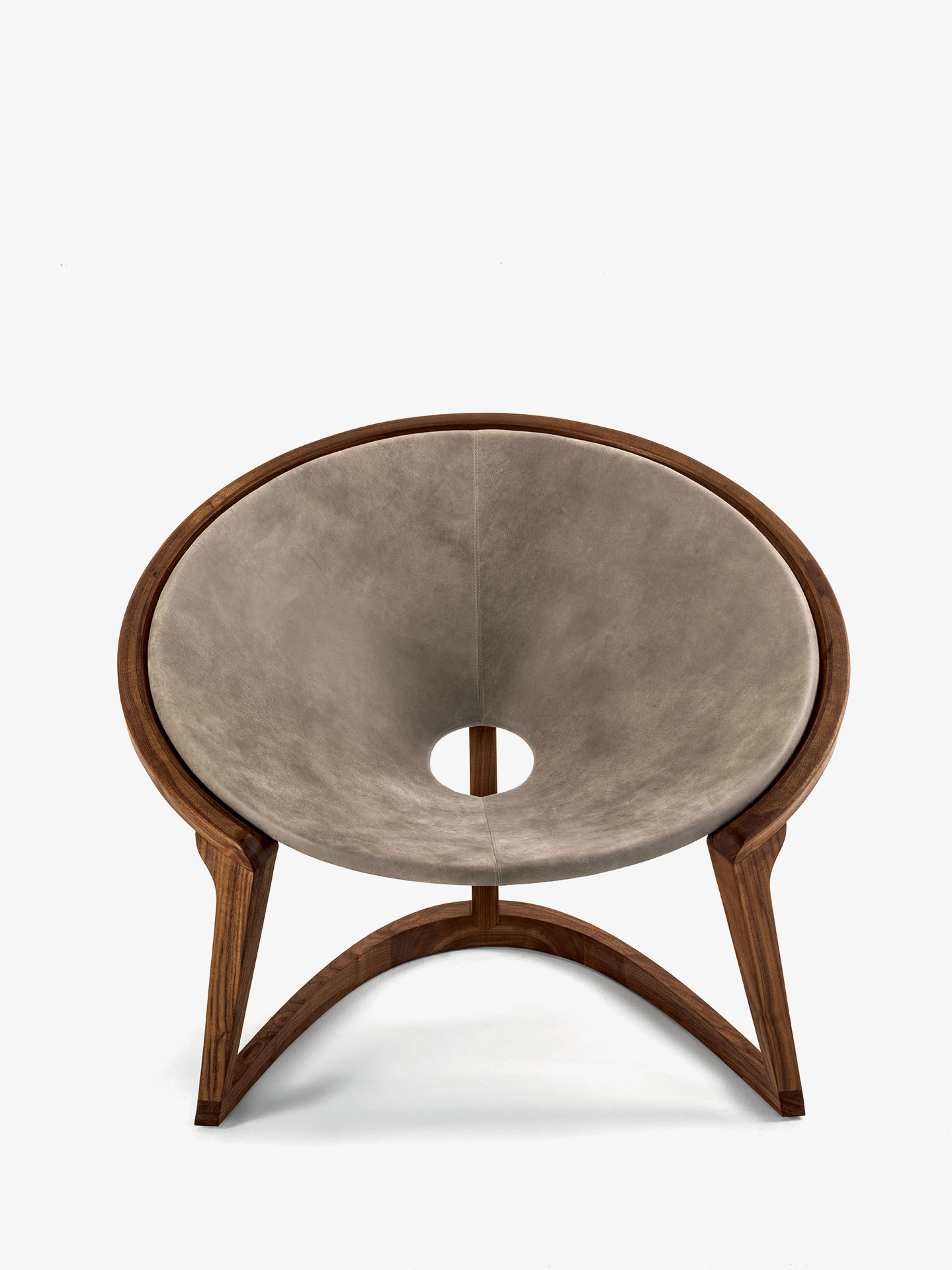 全手工制作、组装、打磨而成的胡桃木实木躺椅。整体结构采用连续流程的弧线将底座和座位无缝连接,椅座由圆形和凹面的多层板制成,覆以绒面皮饰面,采用裸露的缝线。
