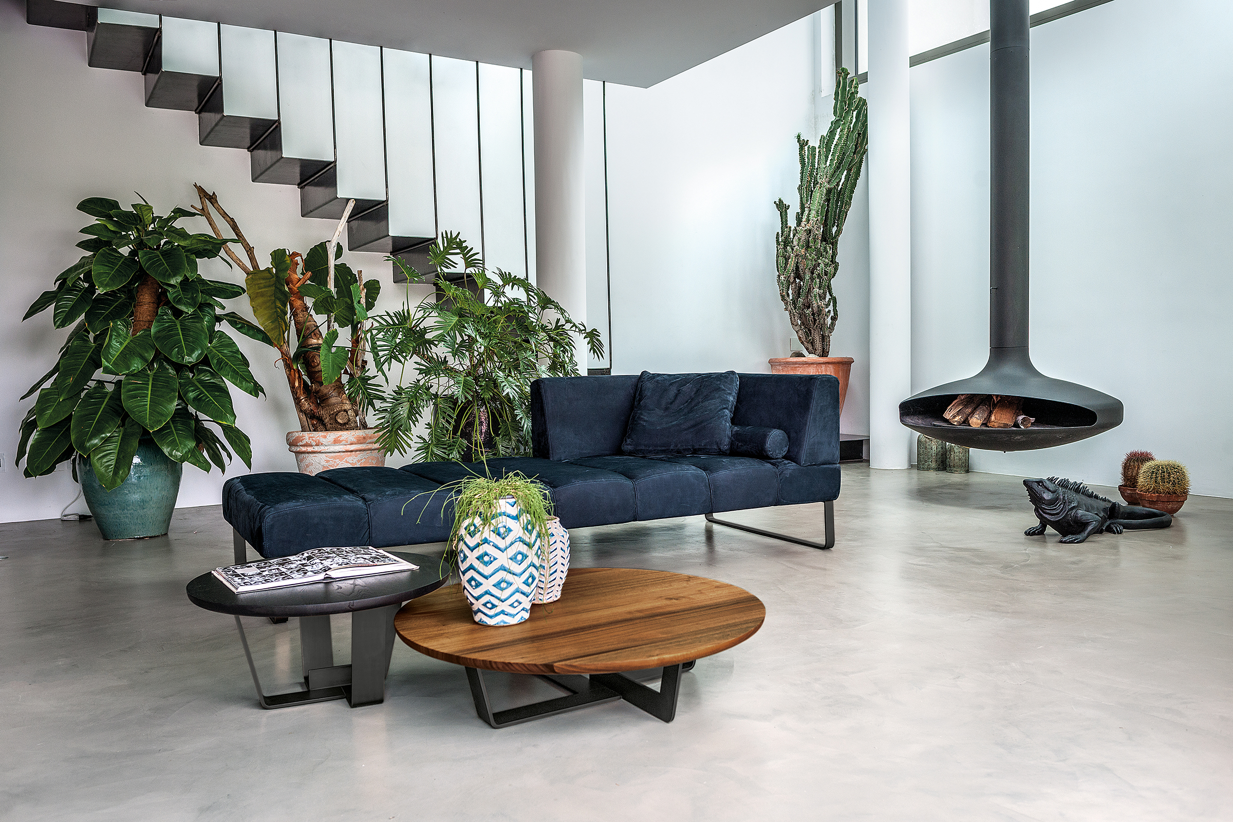 皮革或布艺软包沙发,采用裸露缝线。带铁制沙发腿,有多种组合和模块化元素可供选择,其中一些元素由一整块实木打造而成,可用作工作台、杂志桌或陈列台。