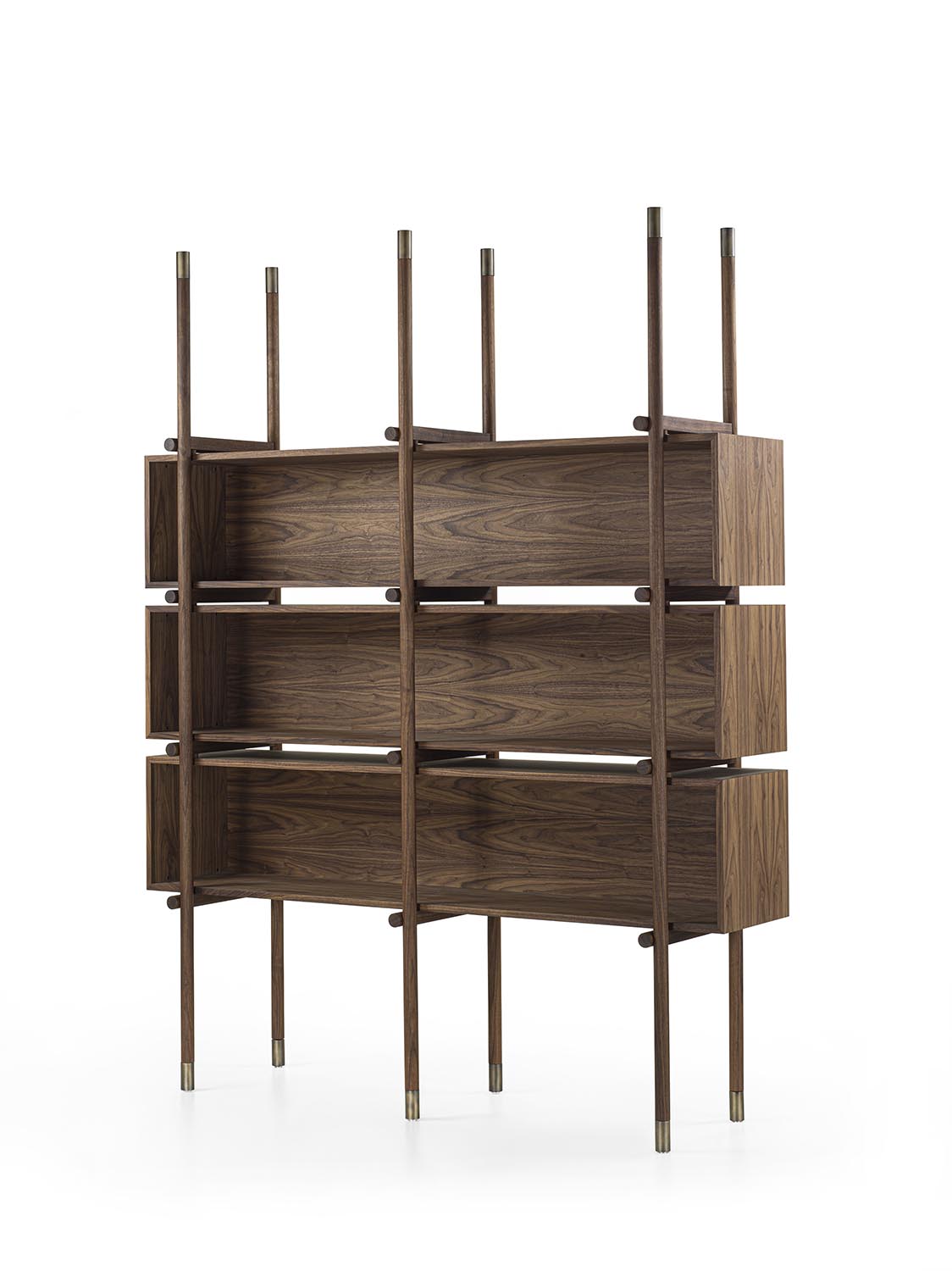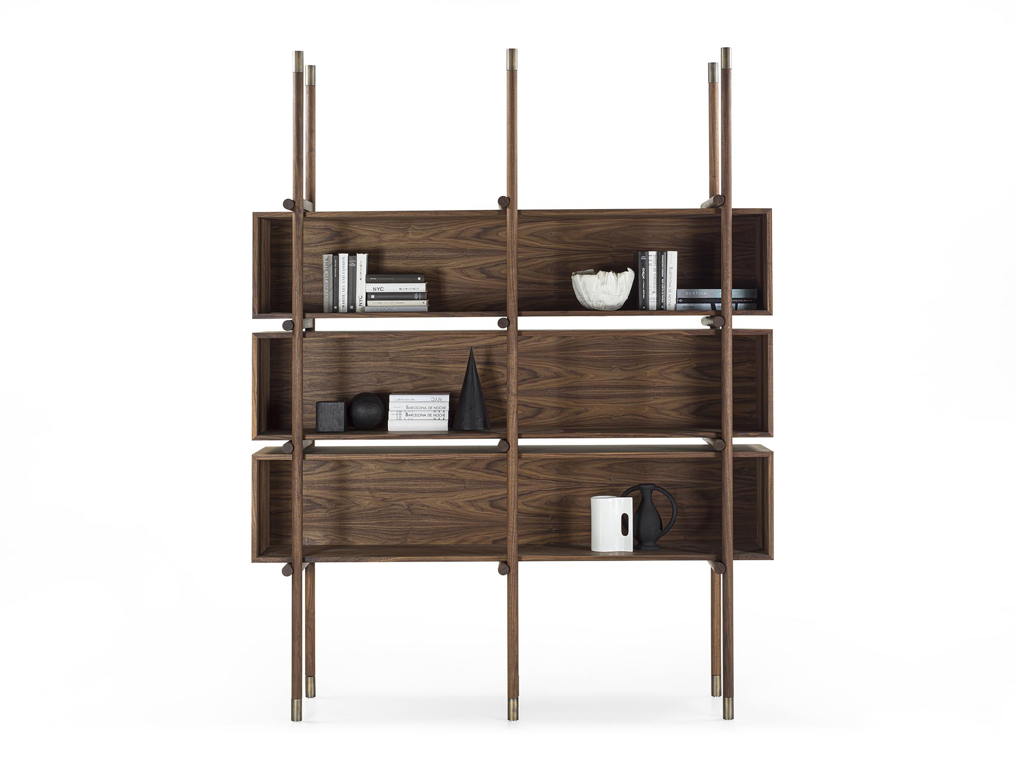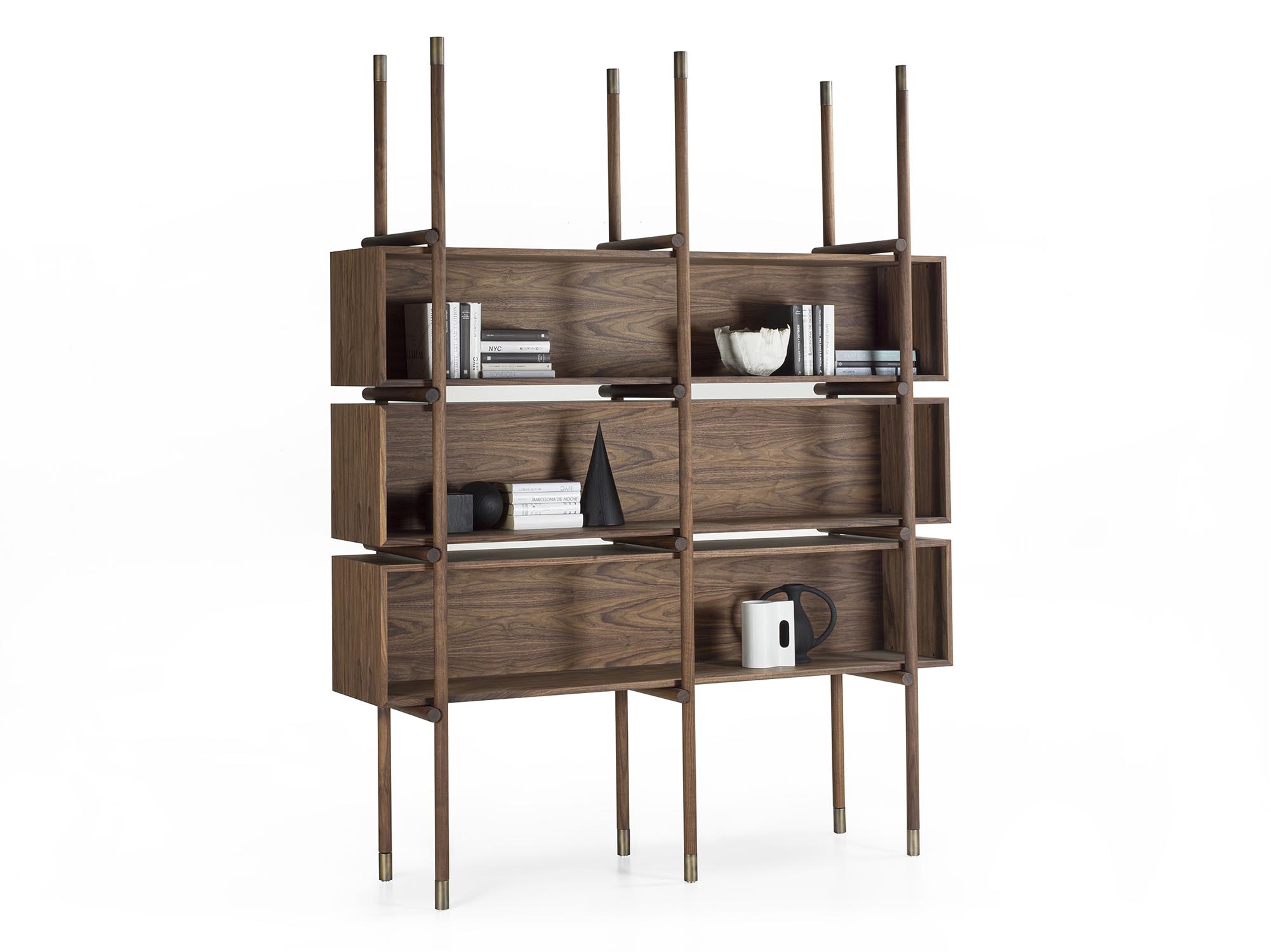 书架采用实木和多层板制成,其结构由车削实木圆形立柱和水平开放式模块组成。立柱两端均饰以金属细节,设置于每个构件的起始与末端。模块化系统使书架能够灵活配置,以适应不同的组合与功能需求。