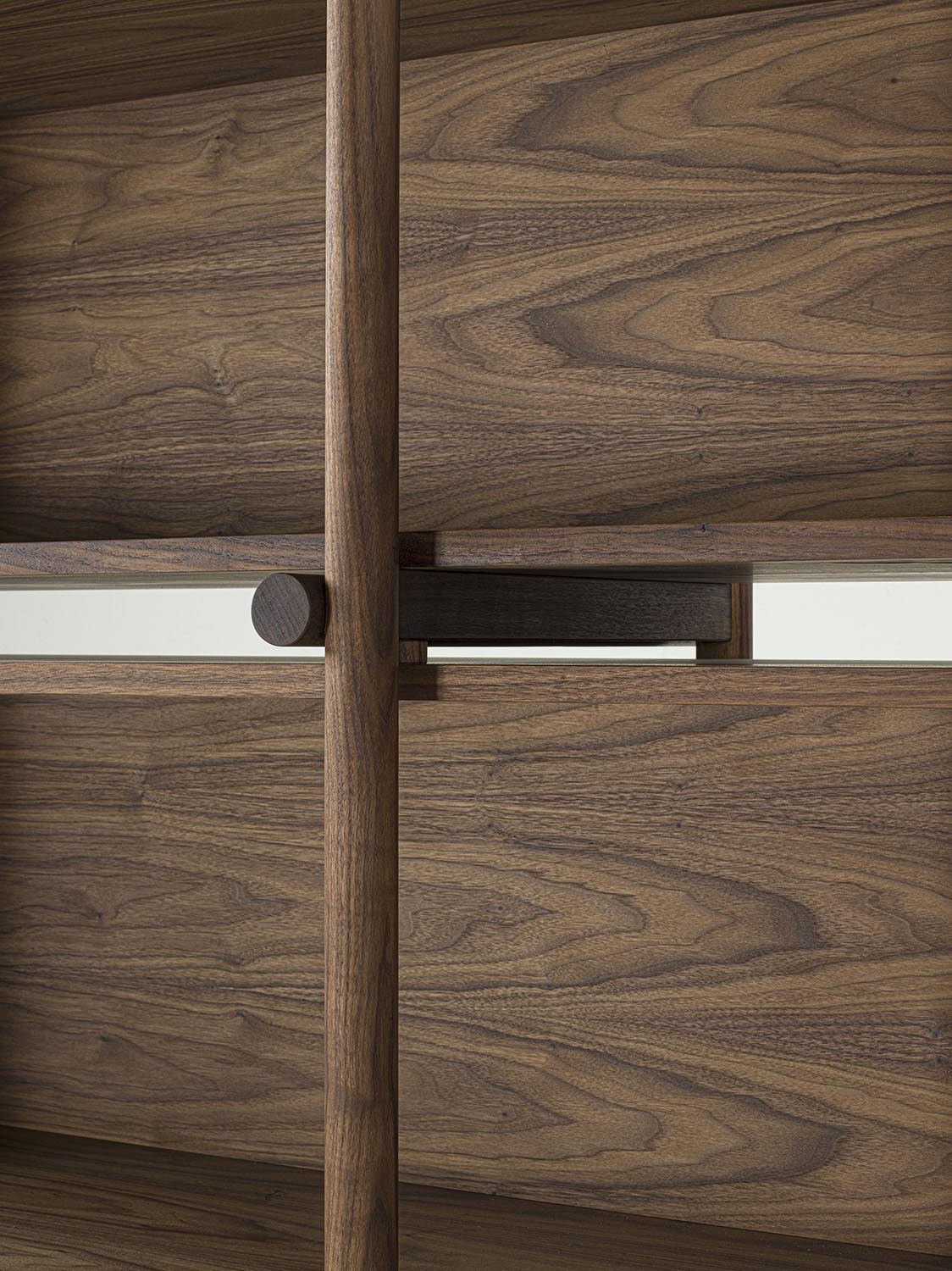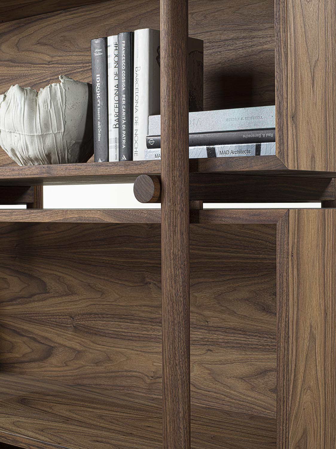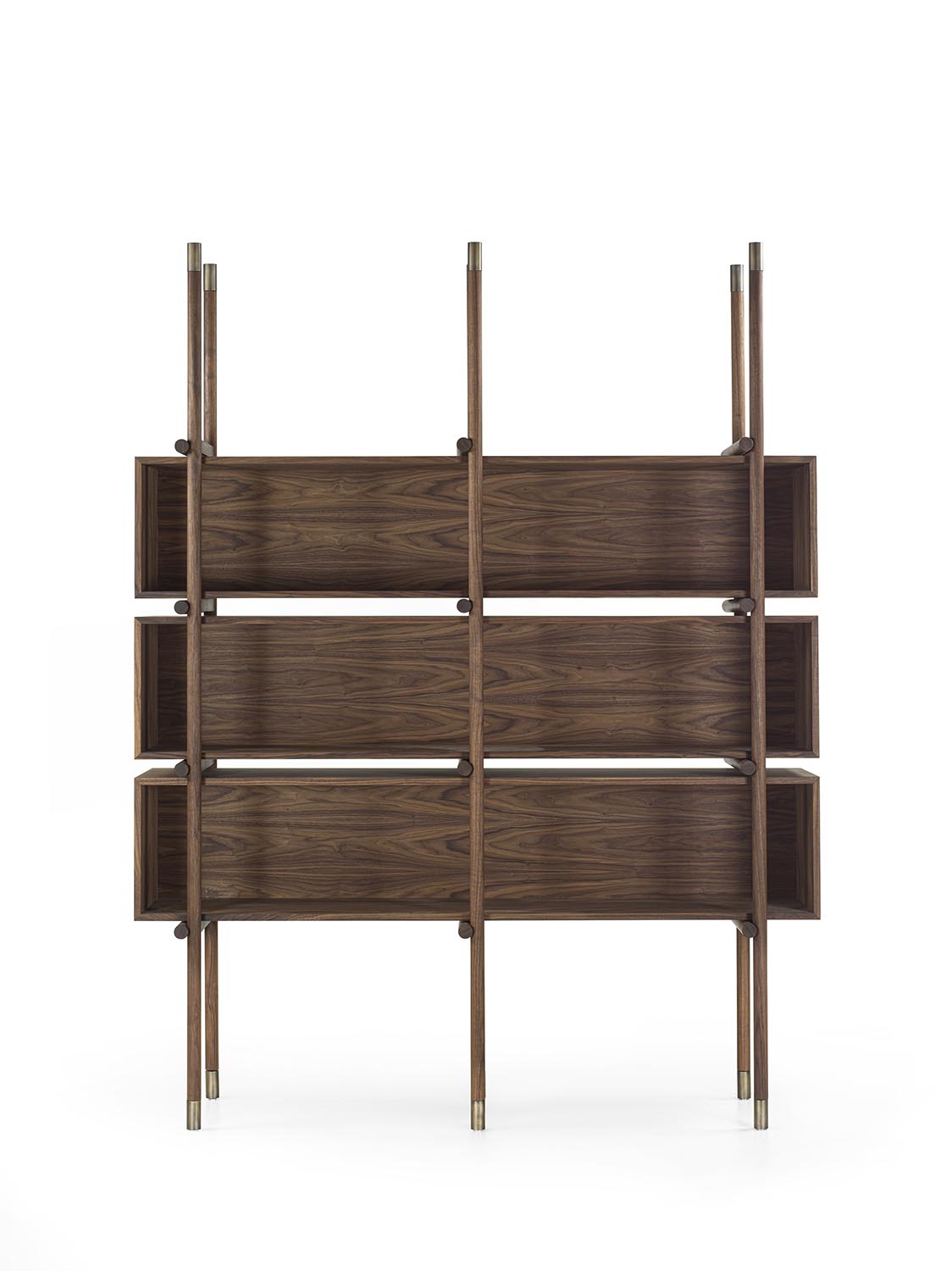 书架采用实木和多层板制成,其结构由车削实木圆形立柱和水平开放式模块组成。立柱两端均饰以金属细节,设置于每个构件的起始与末端。模块化系统使书架能够灵活配置,以适应不同的组合与功能需求。