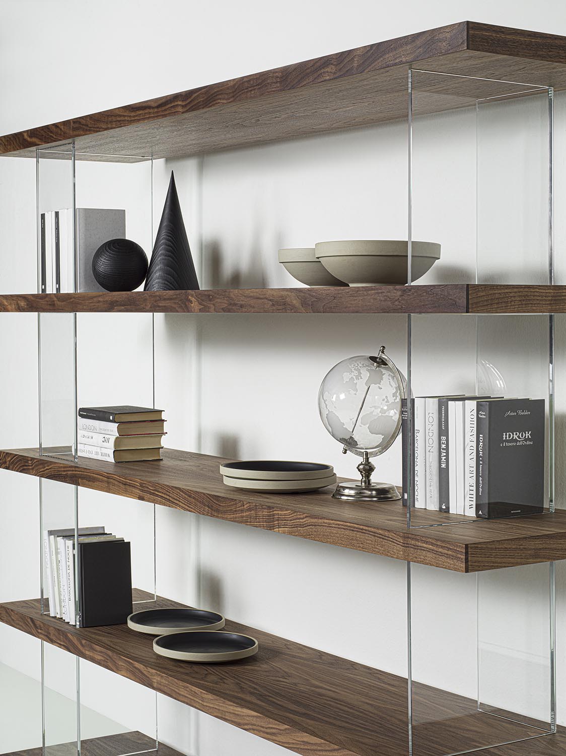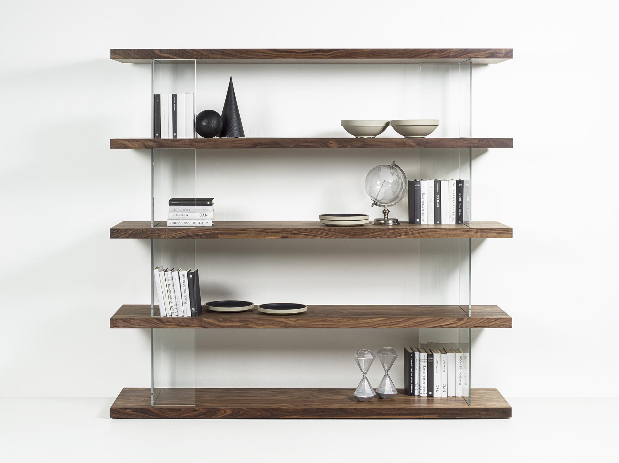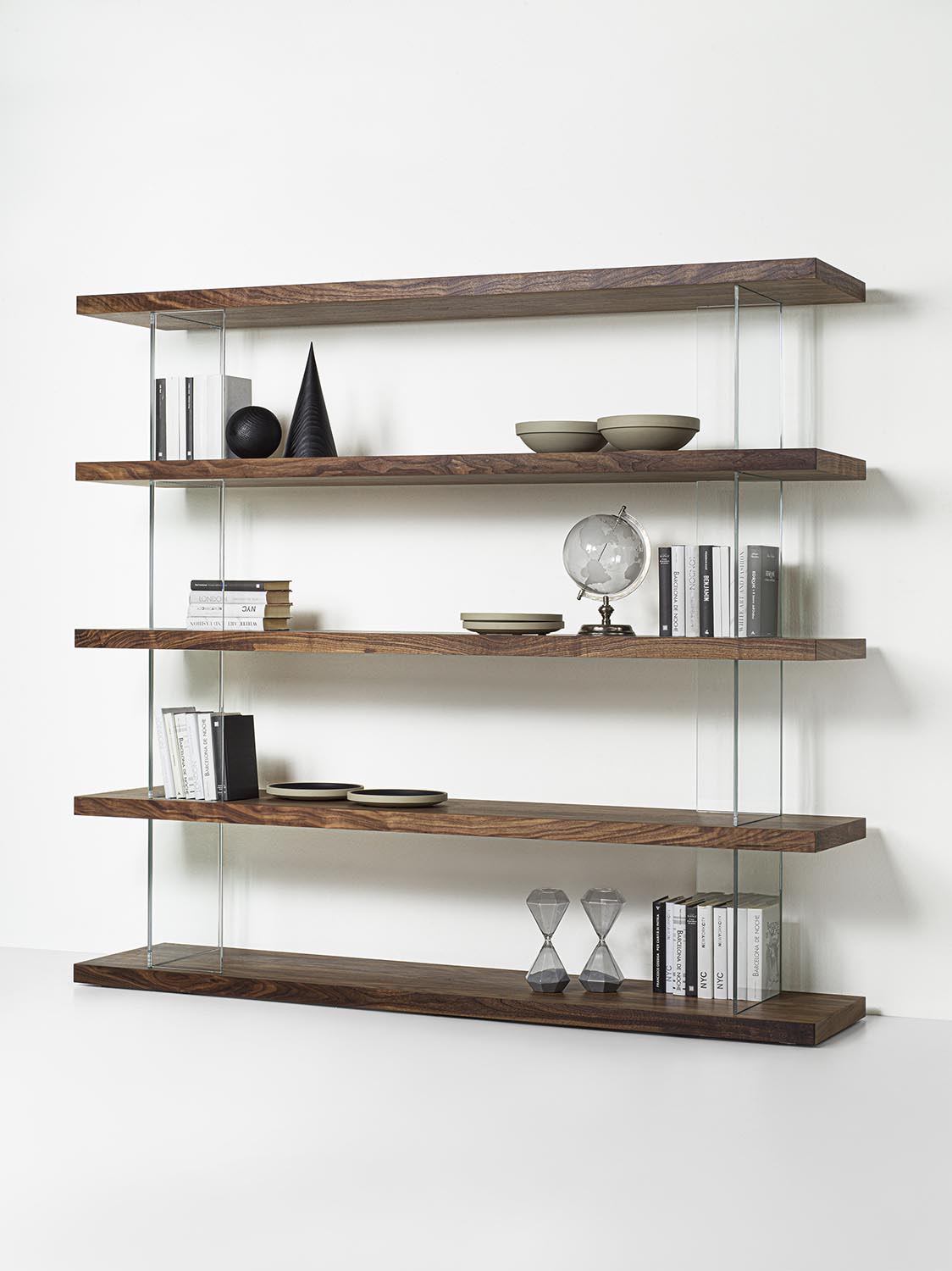 可组合式书架,采用实木和细木工板层板制成,以纵向的钢化玻璃支撑板进行分隔,起到支撑并拉开层板间距的作用。木质层板与透明构件的交替运用,勾勒出简约、轻盈且实用的结构,能够优雅地划分空间,而不显得厚重。该系统不含固定连接件,可实现多种组合配置,同时保持简洁而富有当代感的视觉效果。