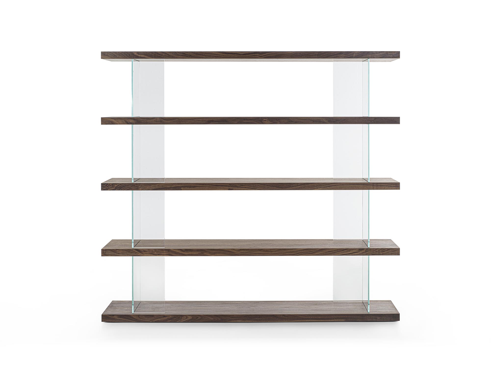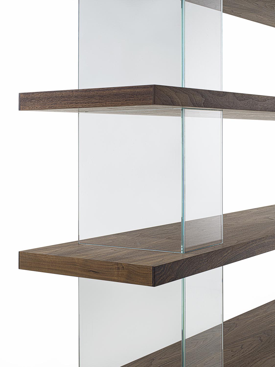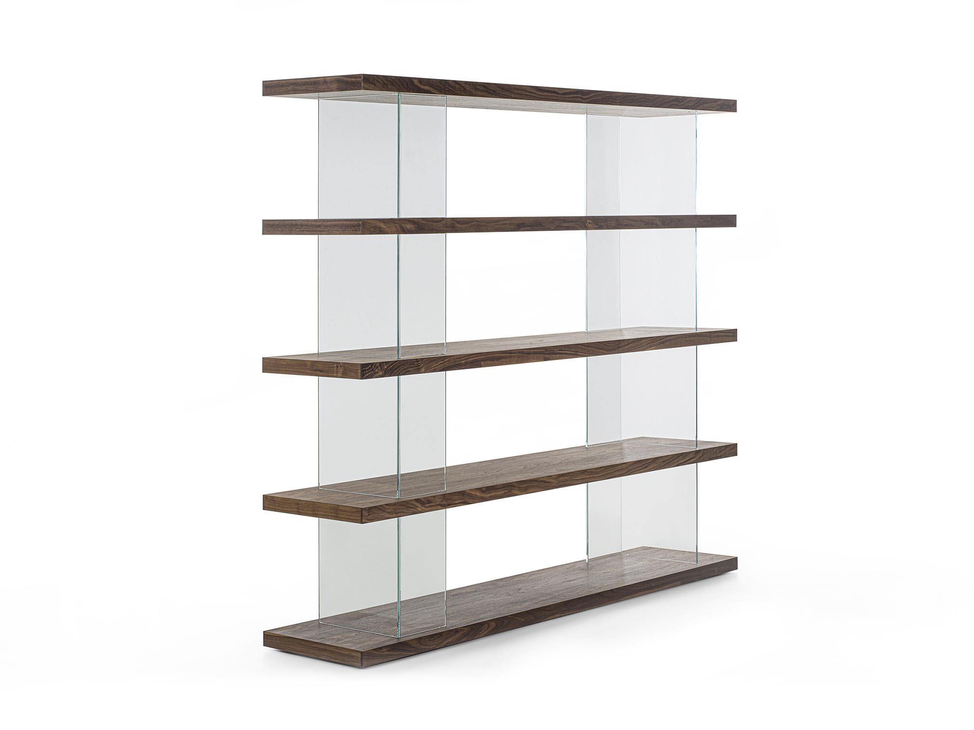 可组合式书架,采用实木和细木工板层板制成,以纵向的钢化玻璃支撑板进行分隔,起到支撑并拉开层板间距的作用。木质层板与透明构件的交替运用,勾勒出简约、轻盈且实用的结构,能够优雅地划分空间,而不显得厚重。该系统不含固定连接件,可实现多种组合配置,同时保持简洁而富有当代感的视觉效果。