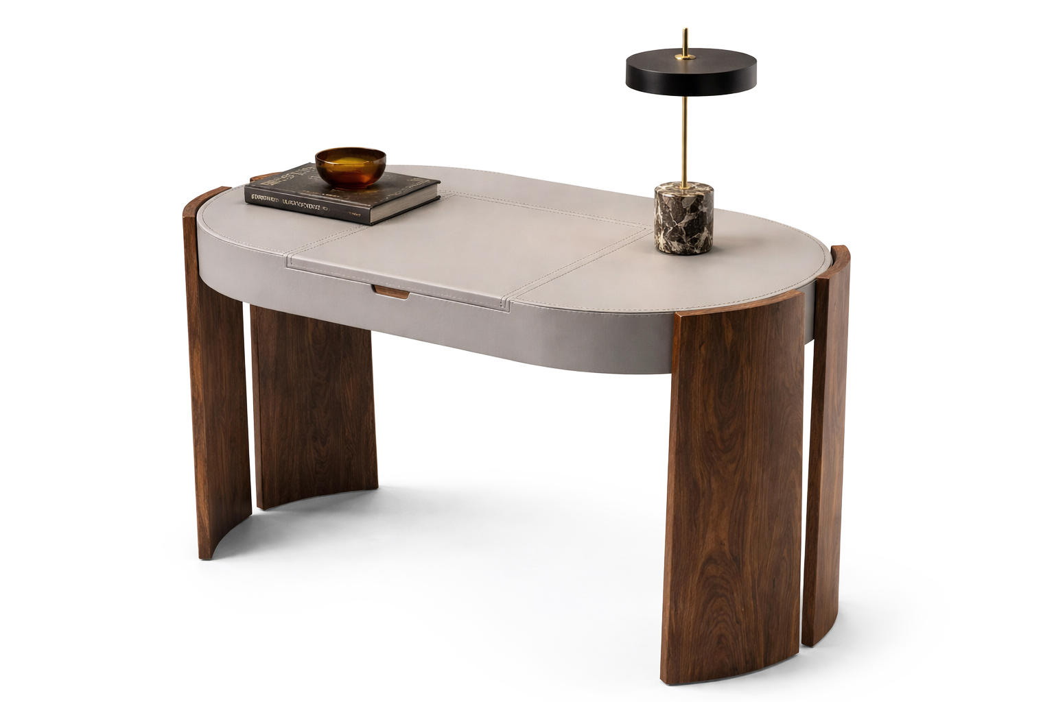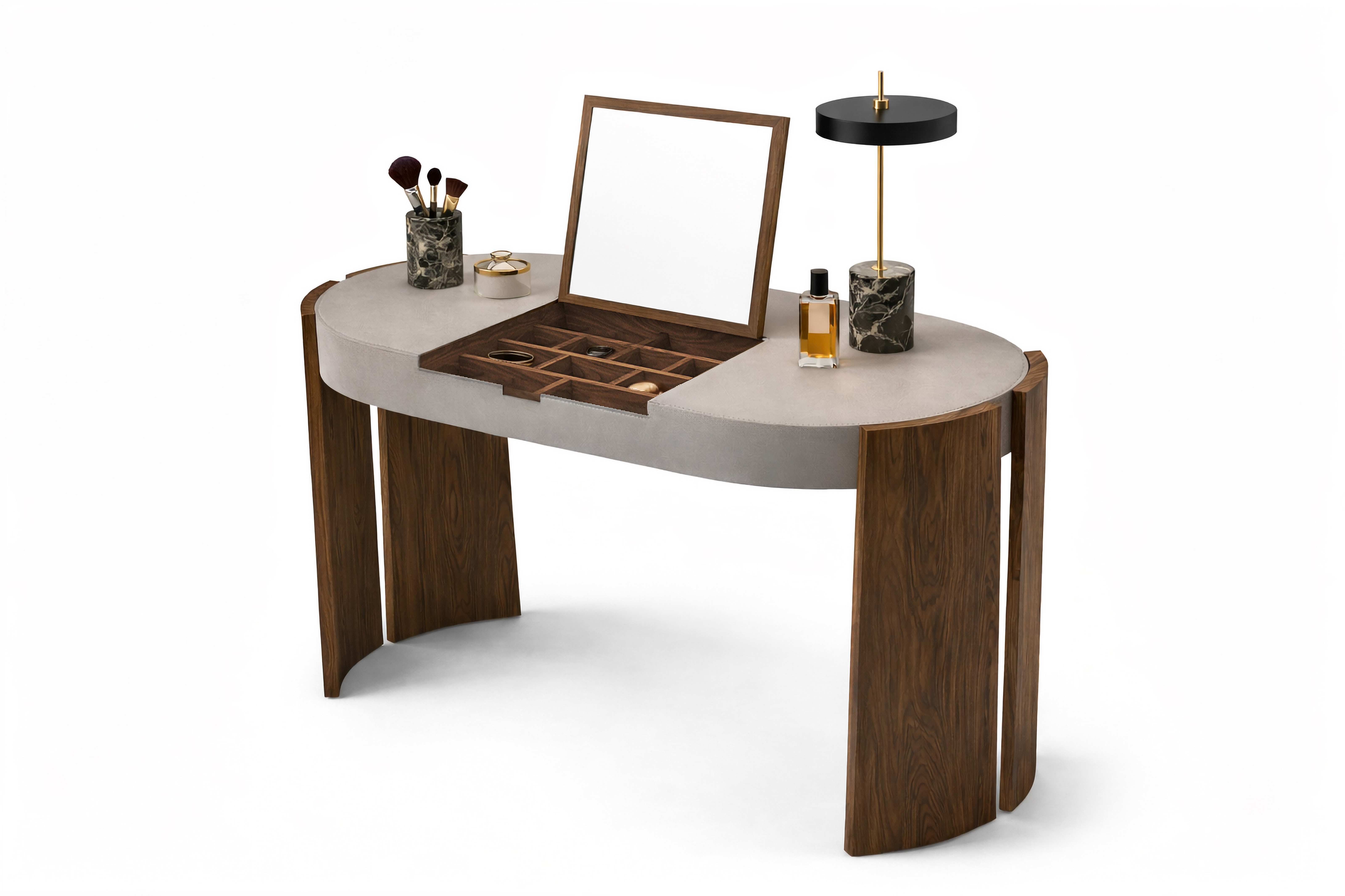 Vanity书桌,桌腿完全采用实木制成,并以数控加工勾勒出流畅的曲线轮廓。桌面造型柔和环抱,以细木工板和实木制成,并覆以皮革。桌面配有一面可掀起的镜子,其下方设有一个可用于收纳梳妆配件的内置储物格。