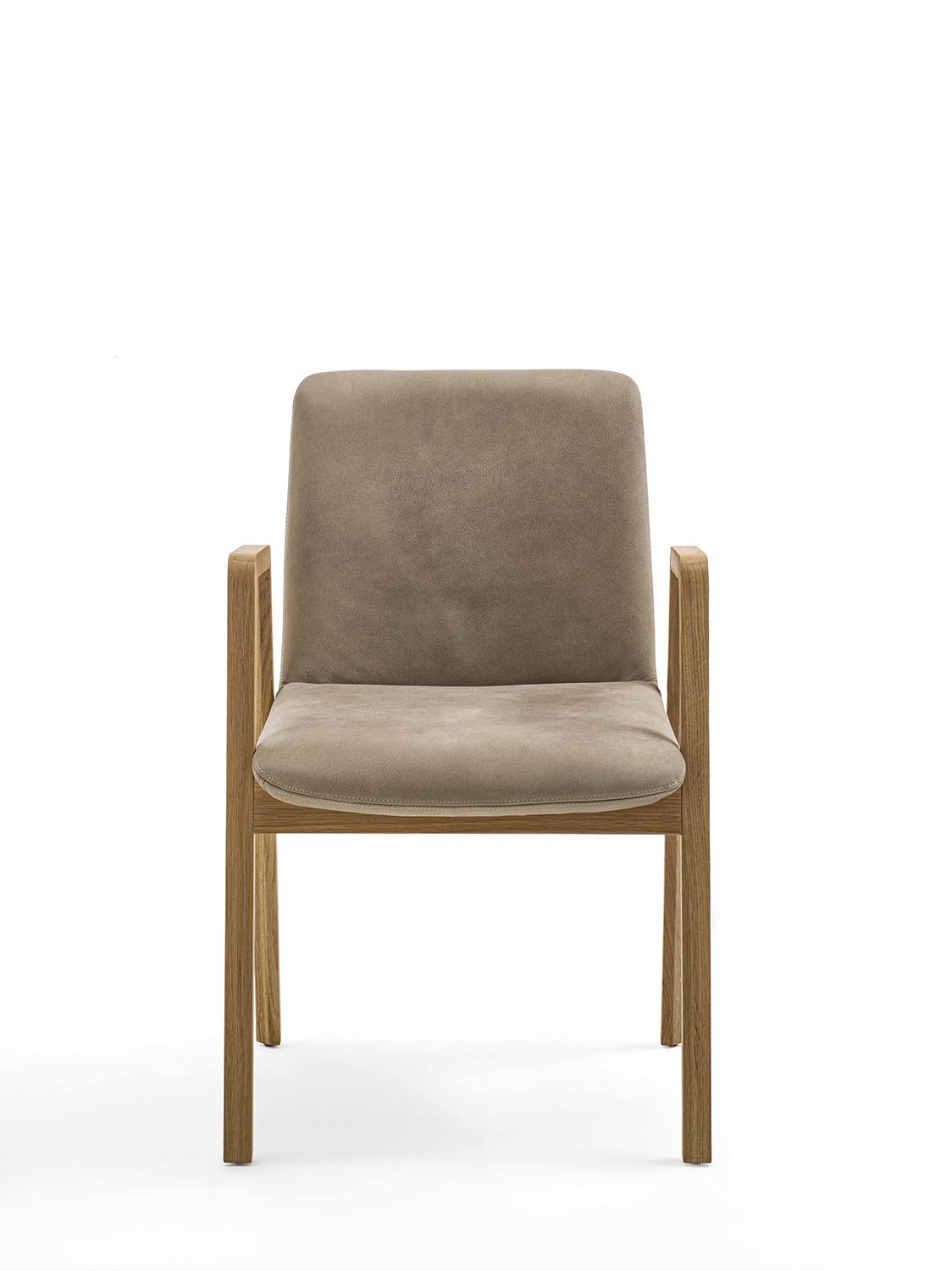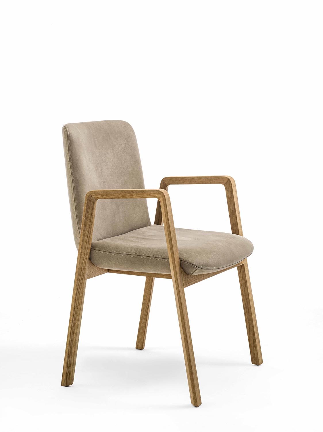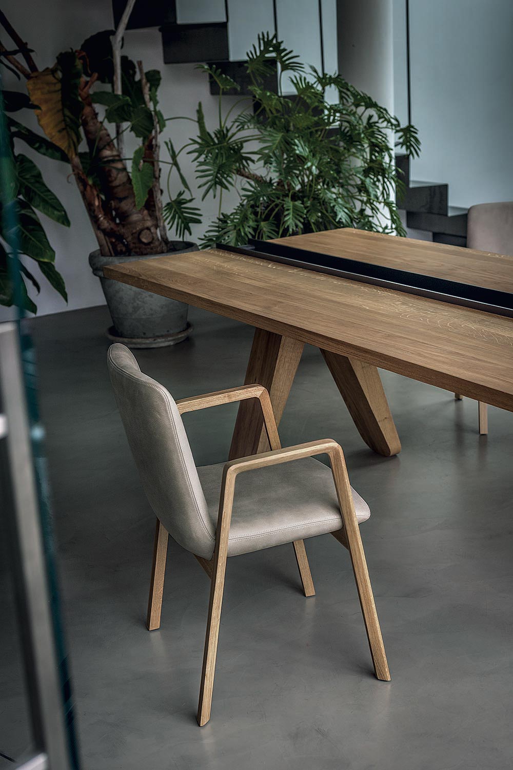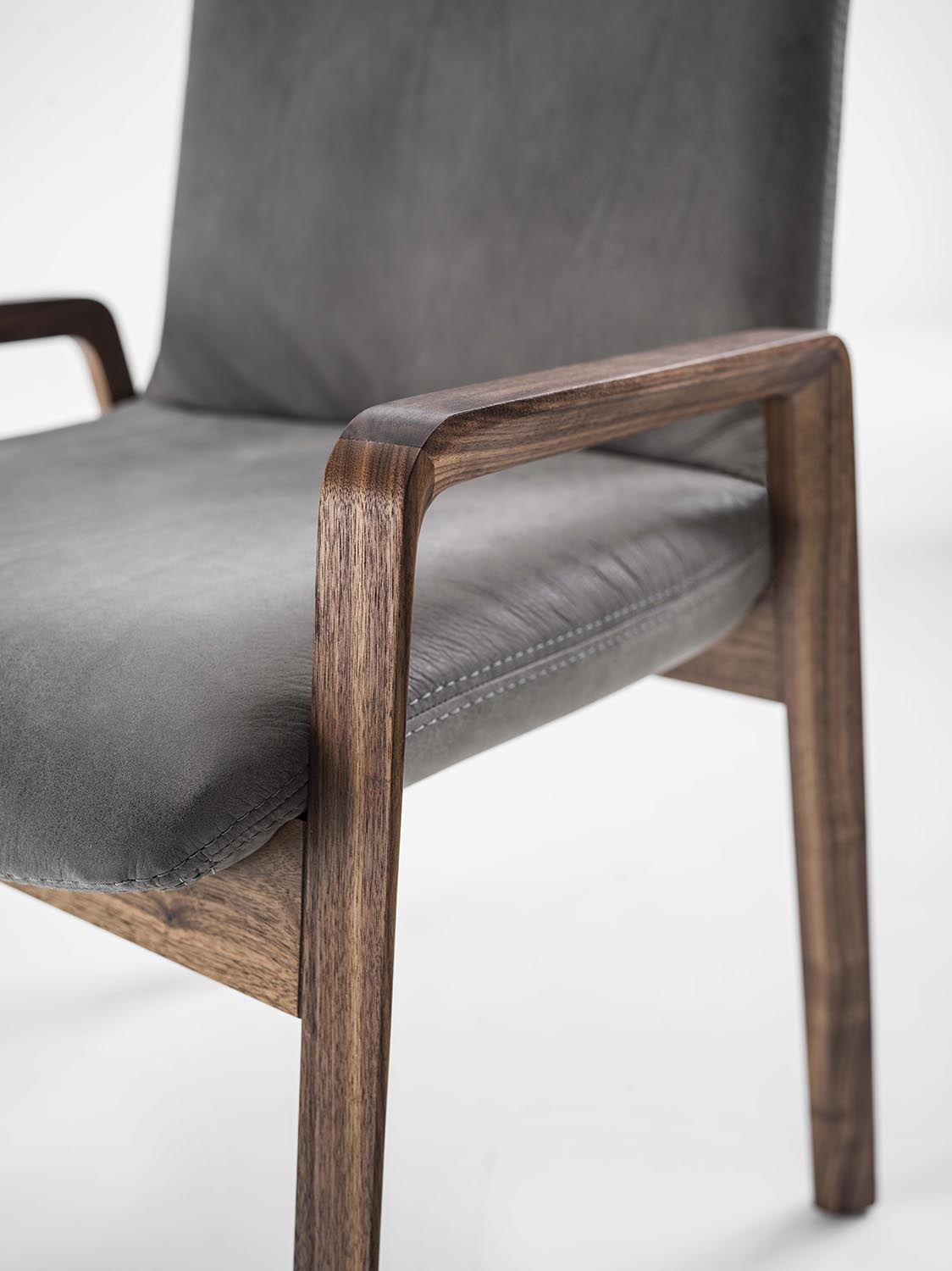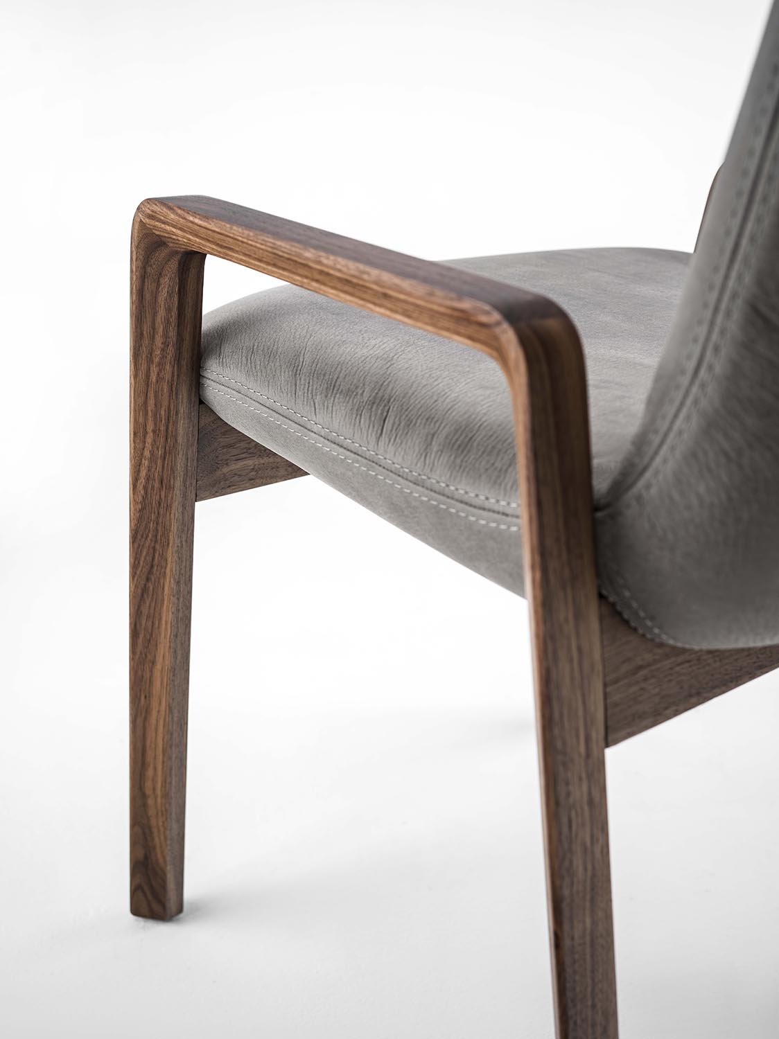 座椅采用聚氨酯填充结构,舒适的靠背和软垫采用皮革或织物饰面,带裸露缝线。实木扶手有两种版本可选(高度为53厘米或64厘米),与桌腿形成造型独特的流畅线条。
