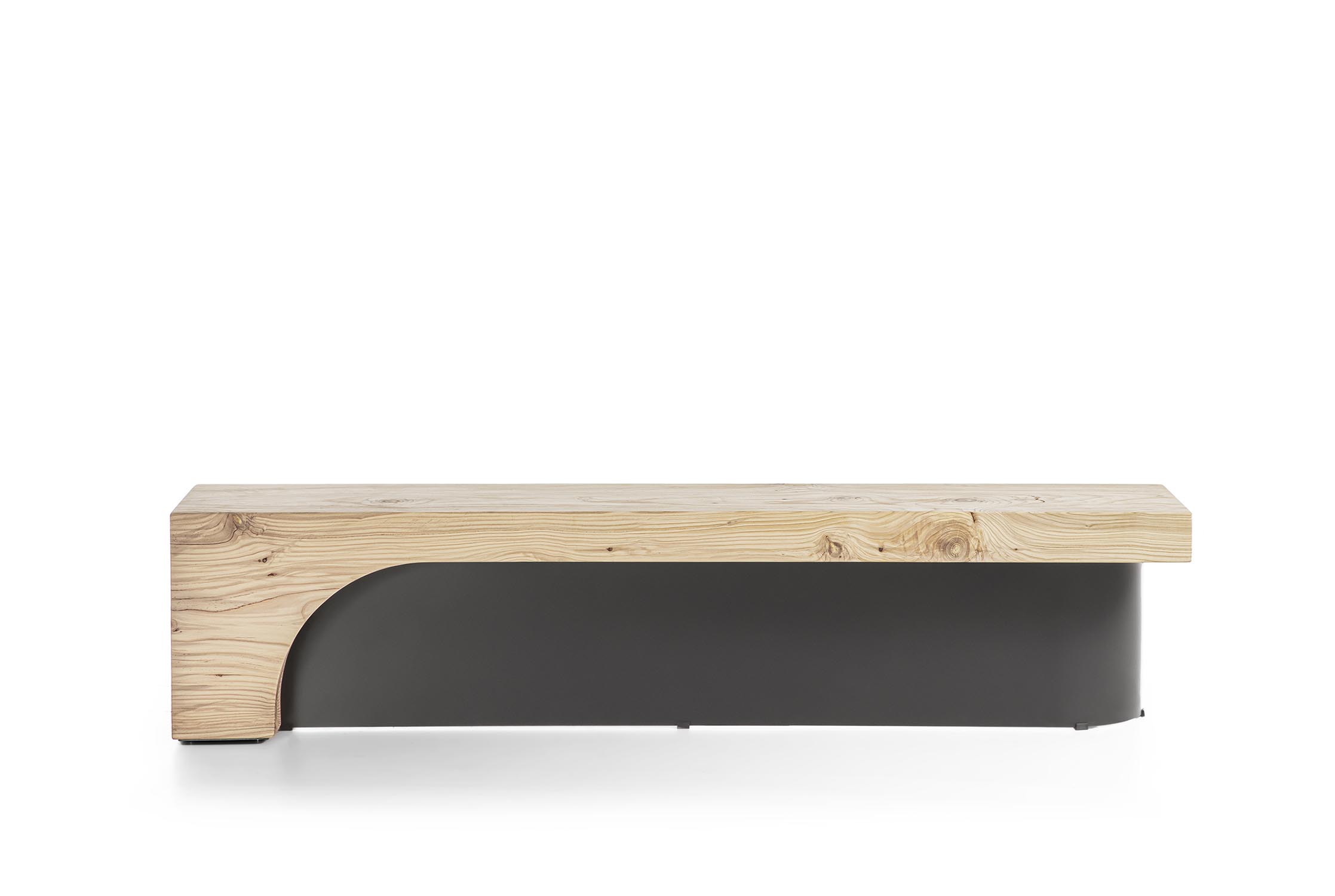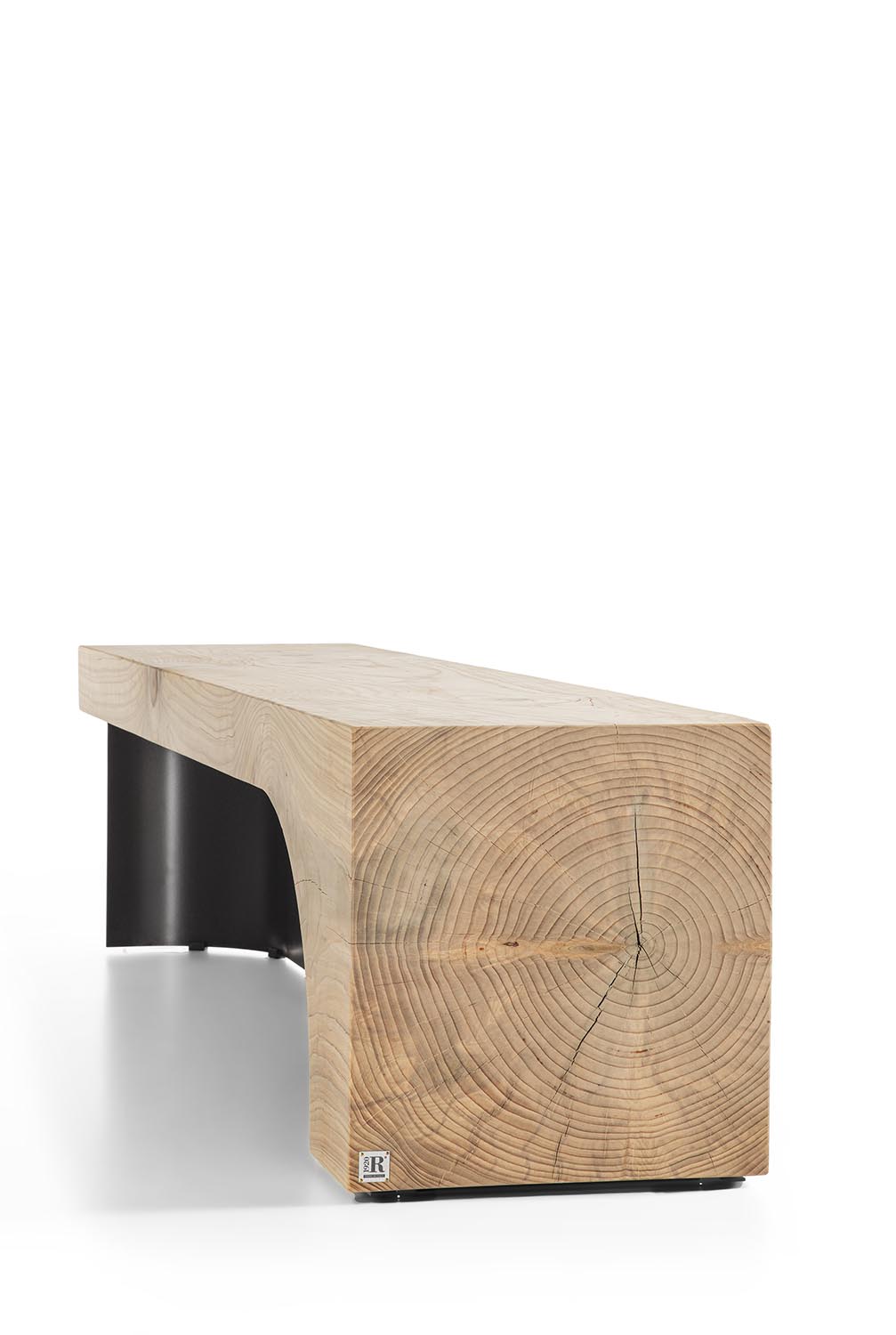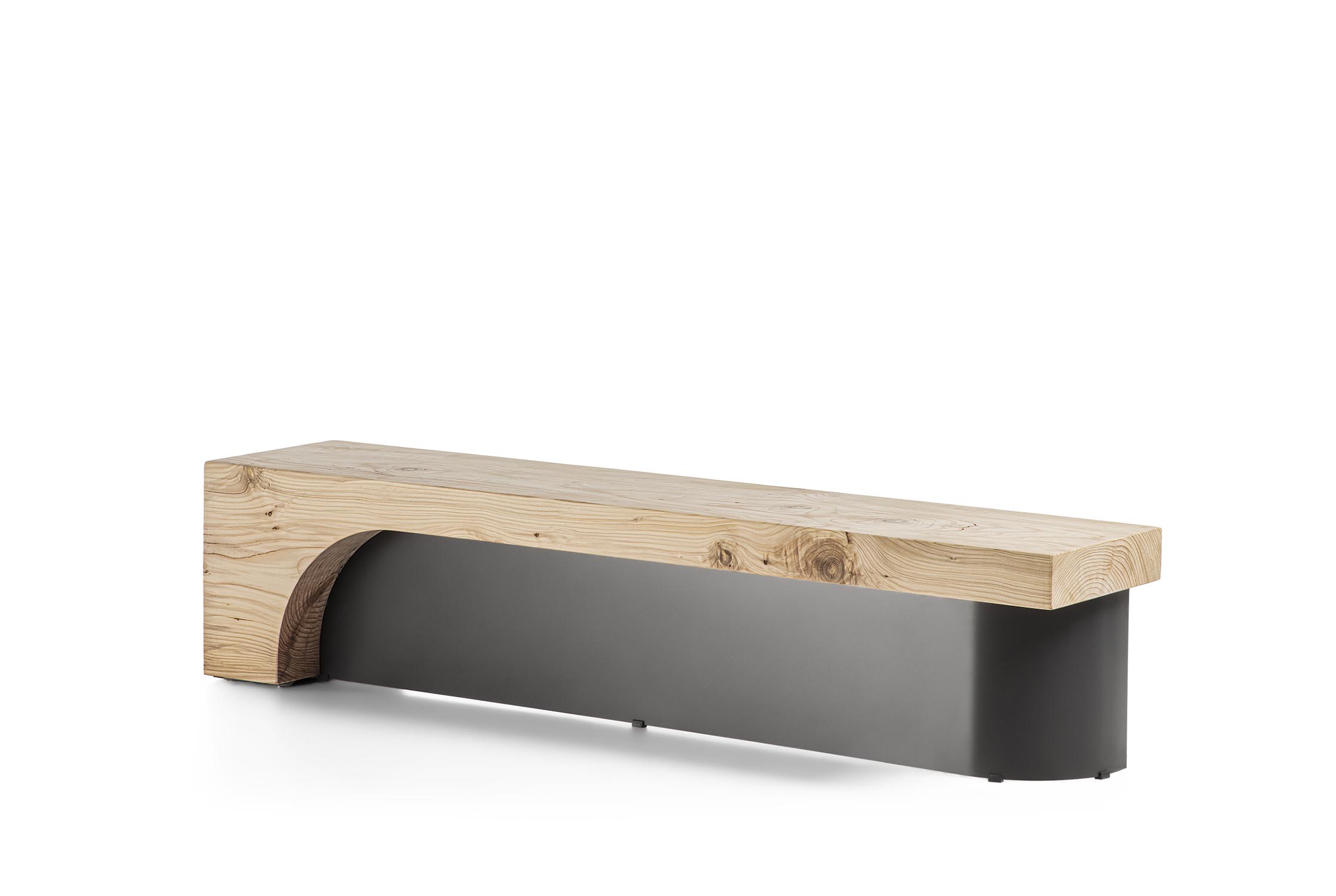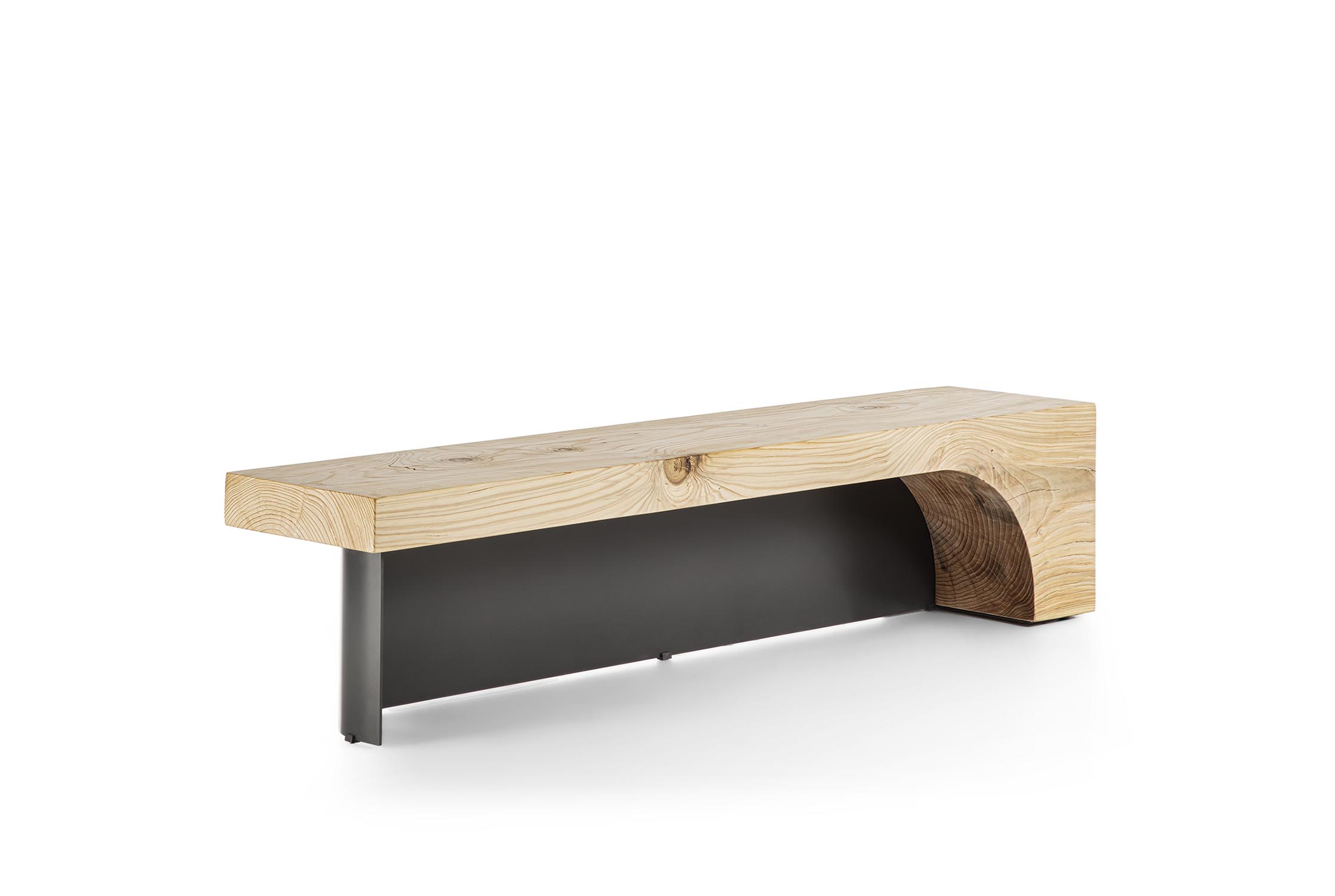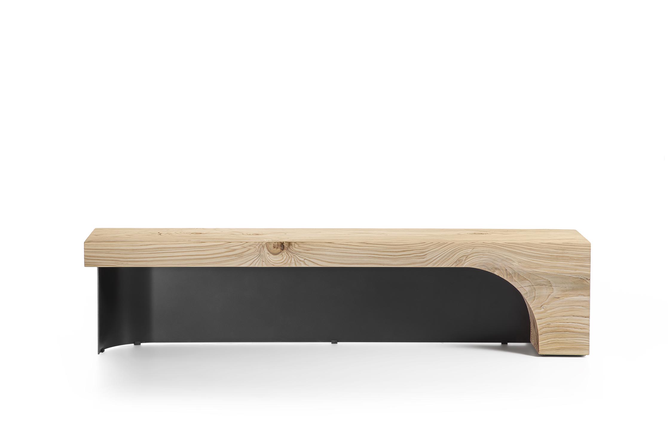 由整块芳香雪松实木制成的长凳,其造型灵感源自天鹅纤长的喙部线条。设计亮点在于底座中融入了一件弯曲金属构件。弯曲的线条既增强了整体的轻盈与动感,又发挥了承重结构的作用,确保稳定与坚固。