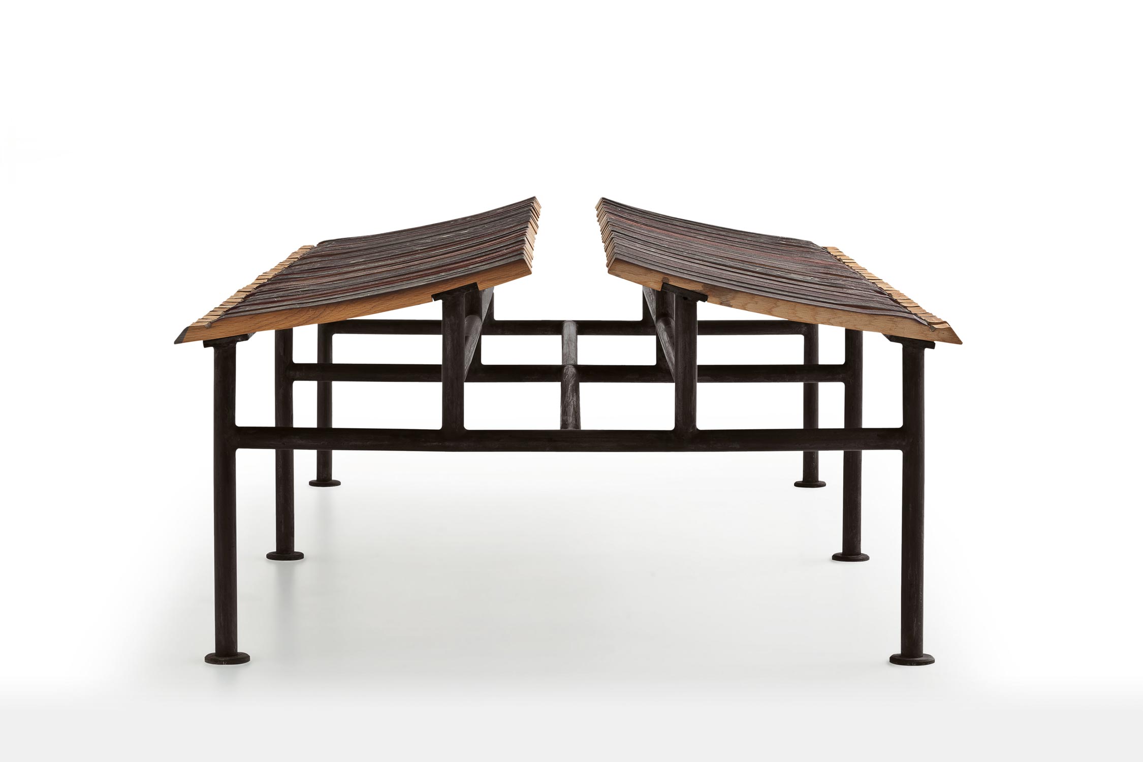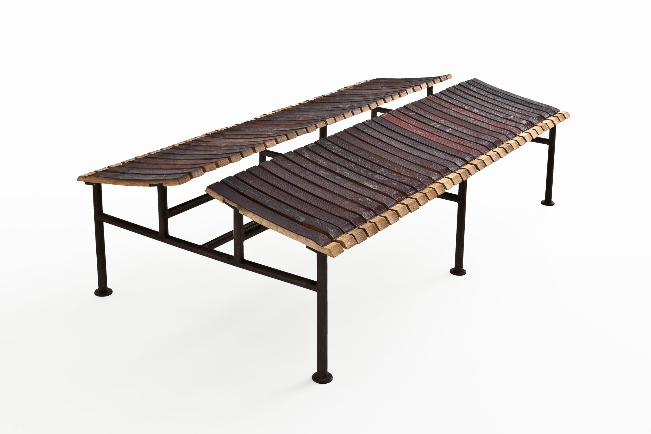 采用橡木酒桶的板条制成的长凳,双座位倾斜式座面设计,搭配铁制框架。