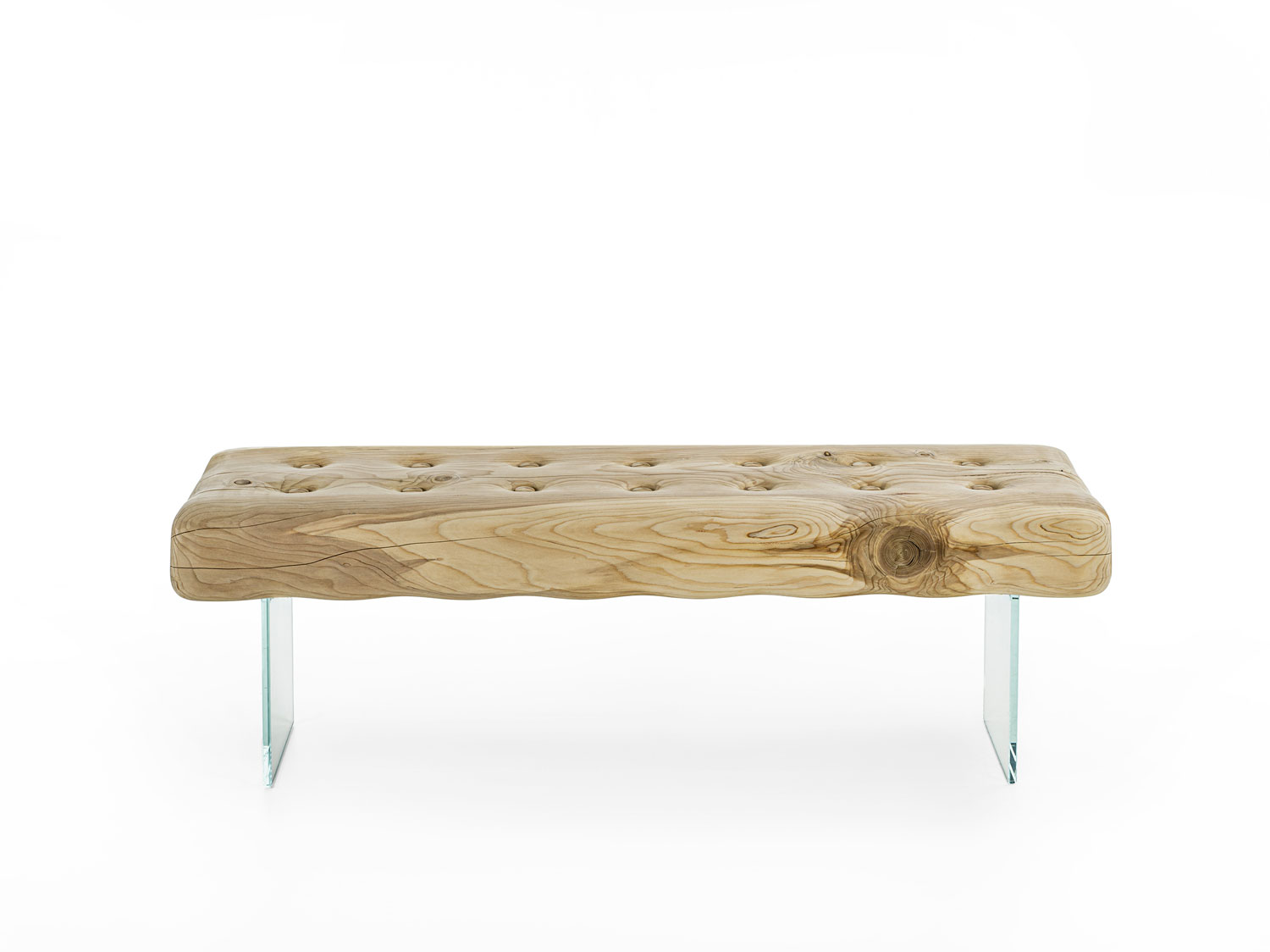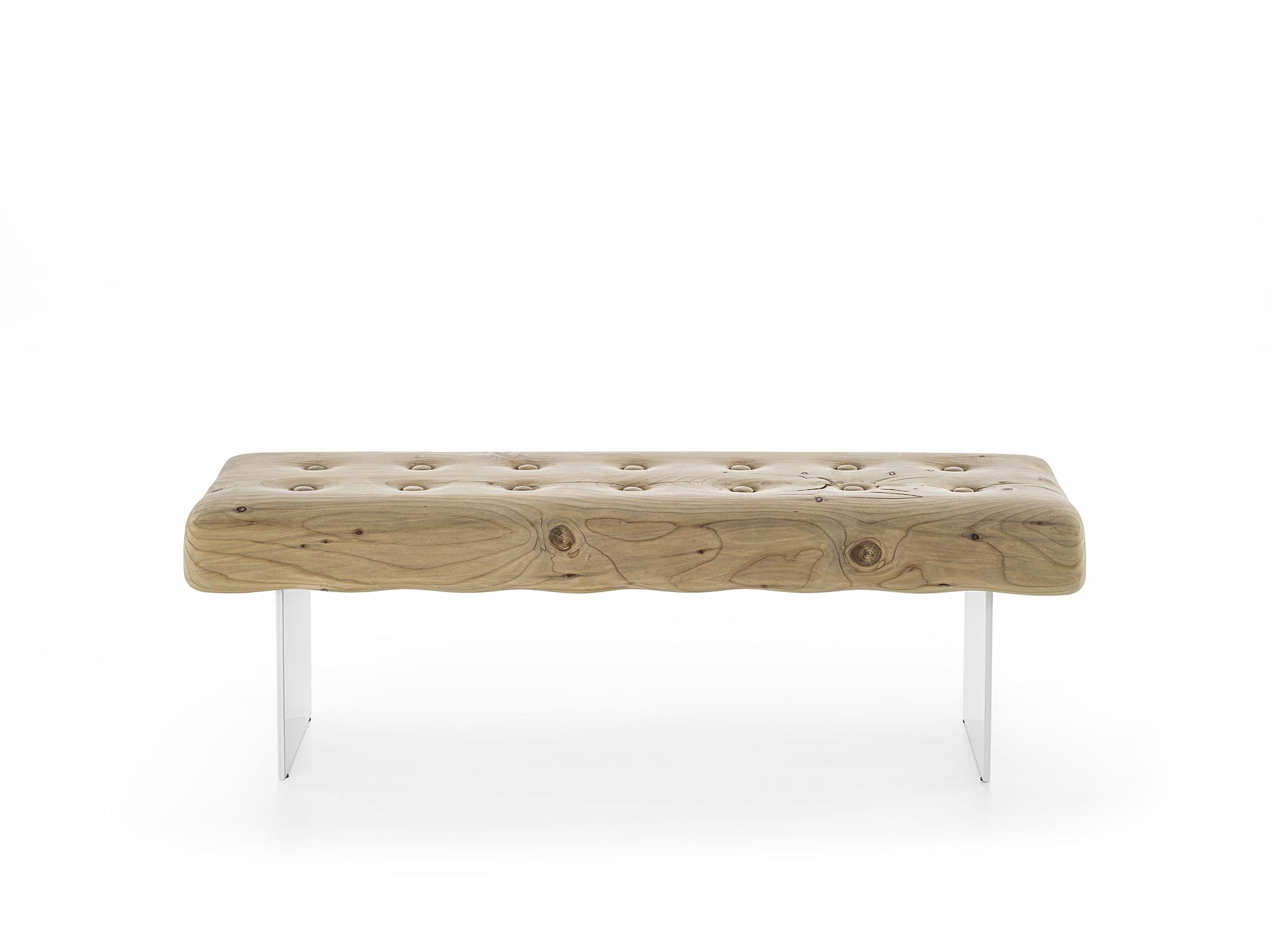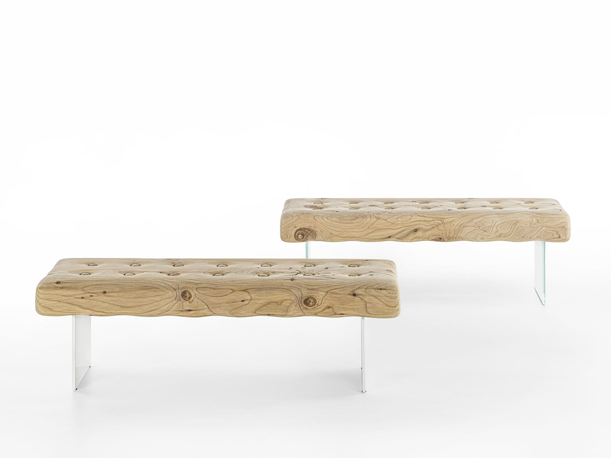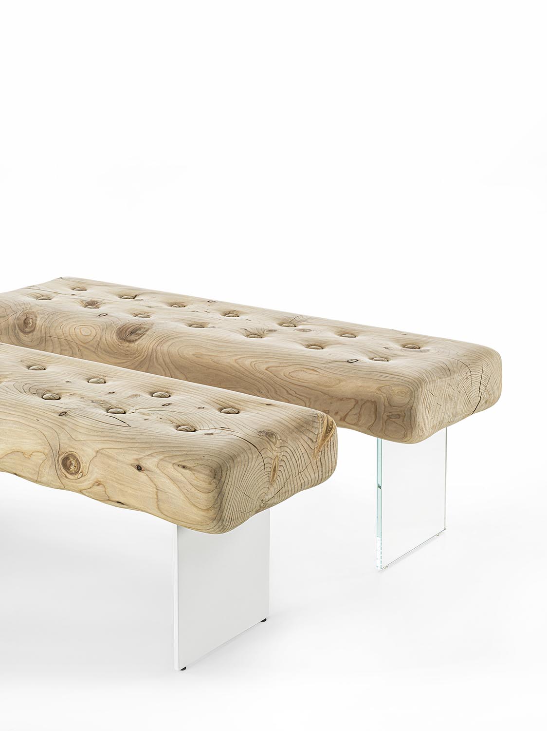 长凳由整块实心香雪松木雕刻而成,座面造型灵感源自床垫的外形,与床垫的柔软印象形成对比,同时依然提供出色的舒适度。长椅装饰有香柏木纽扣,并配有玻璃或铁制的支腿。