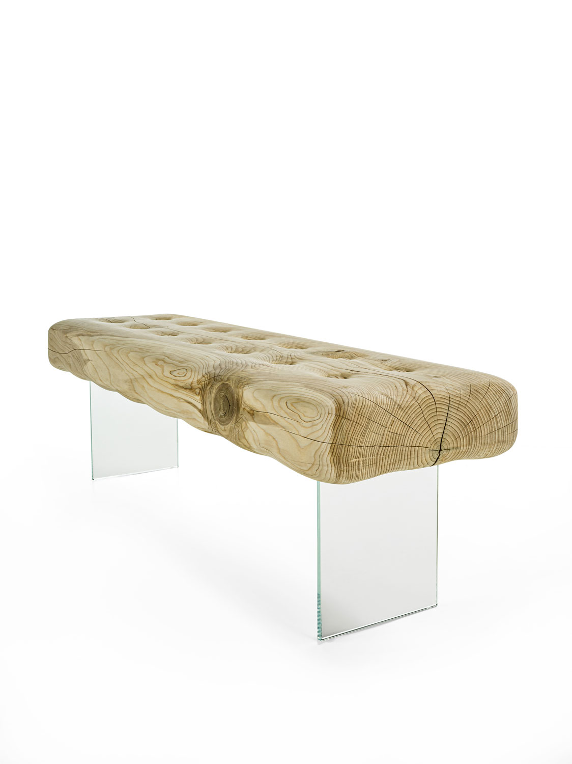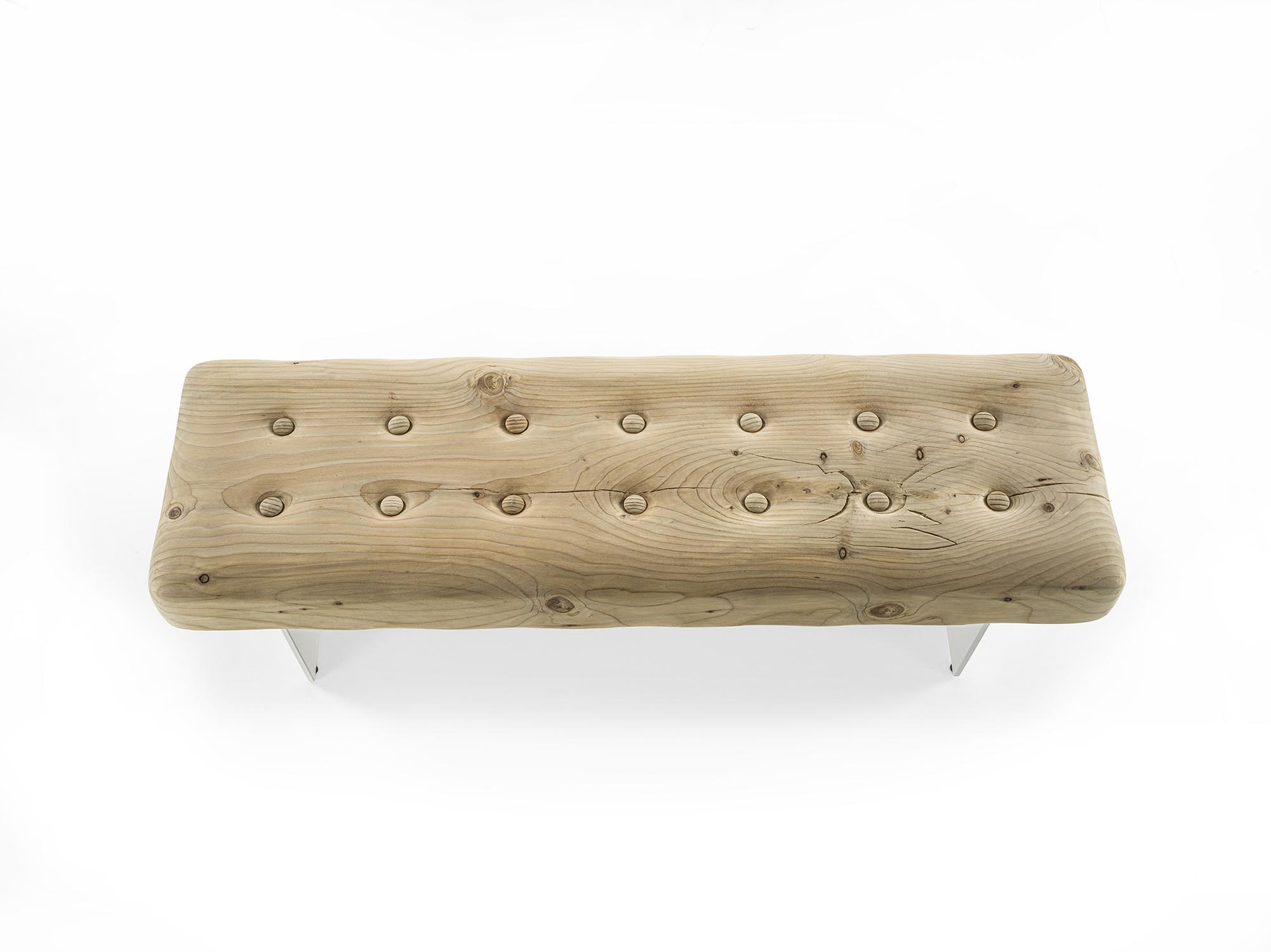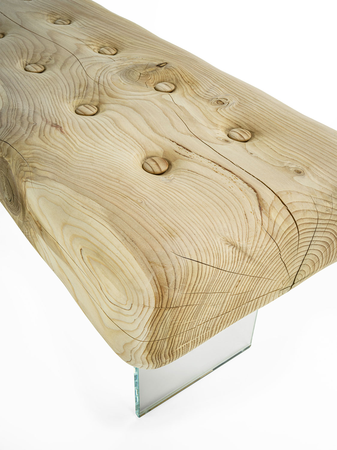长凳由整块实心香雪松木雕刻而成,座面造型灵感源自床垫的外形,与床垫的柔软印象形成对比,同时依然提供出色的舒适度。长椅装饰有香柏木纽扣,并配有玻璃或铁制的支腿。