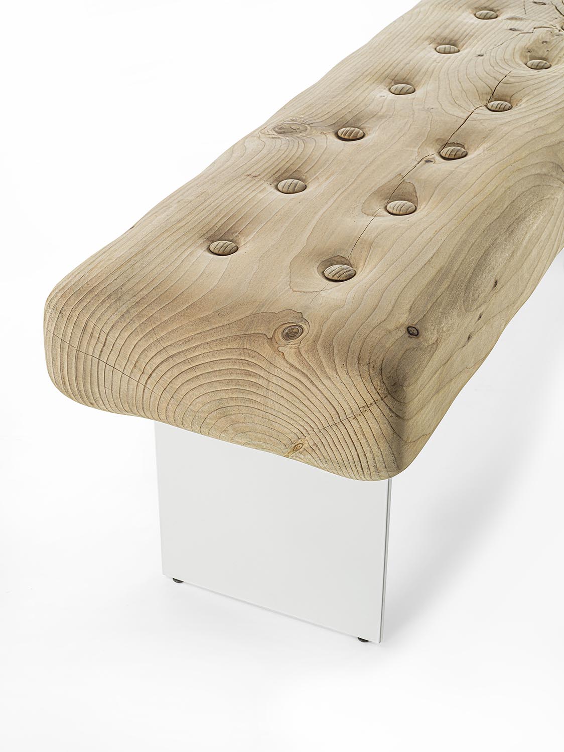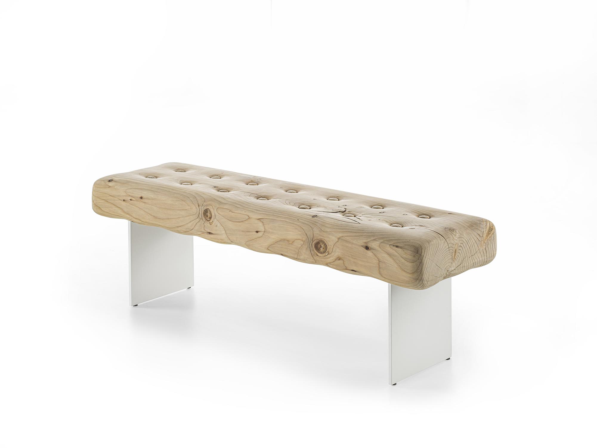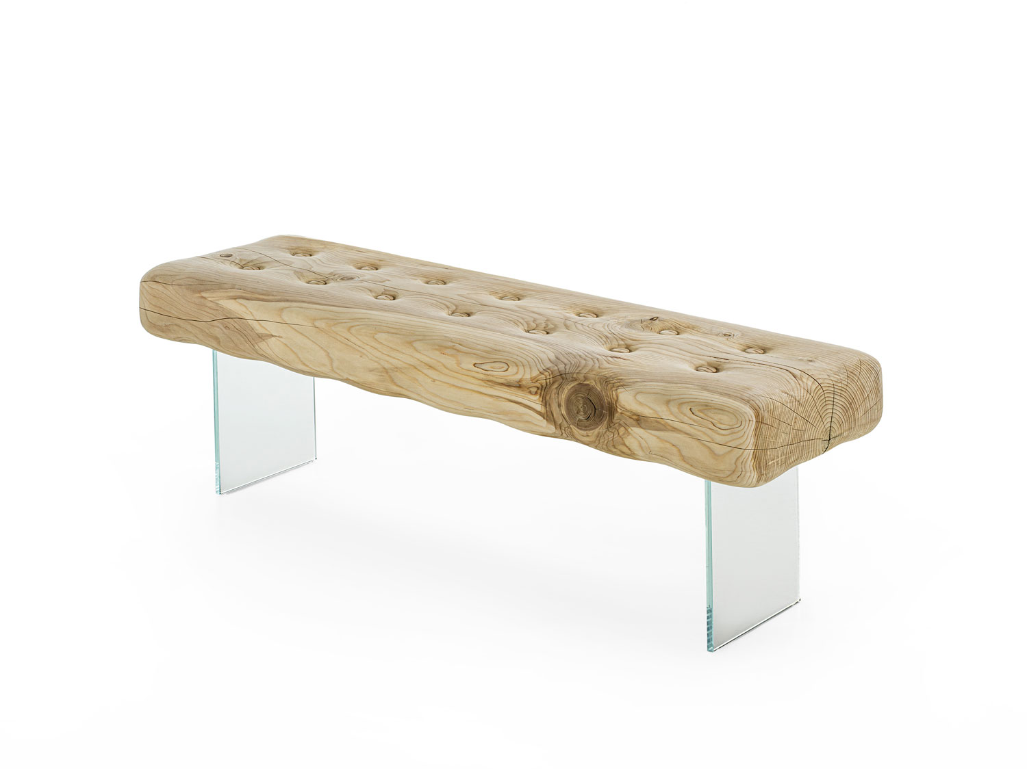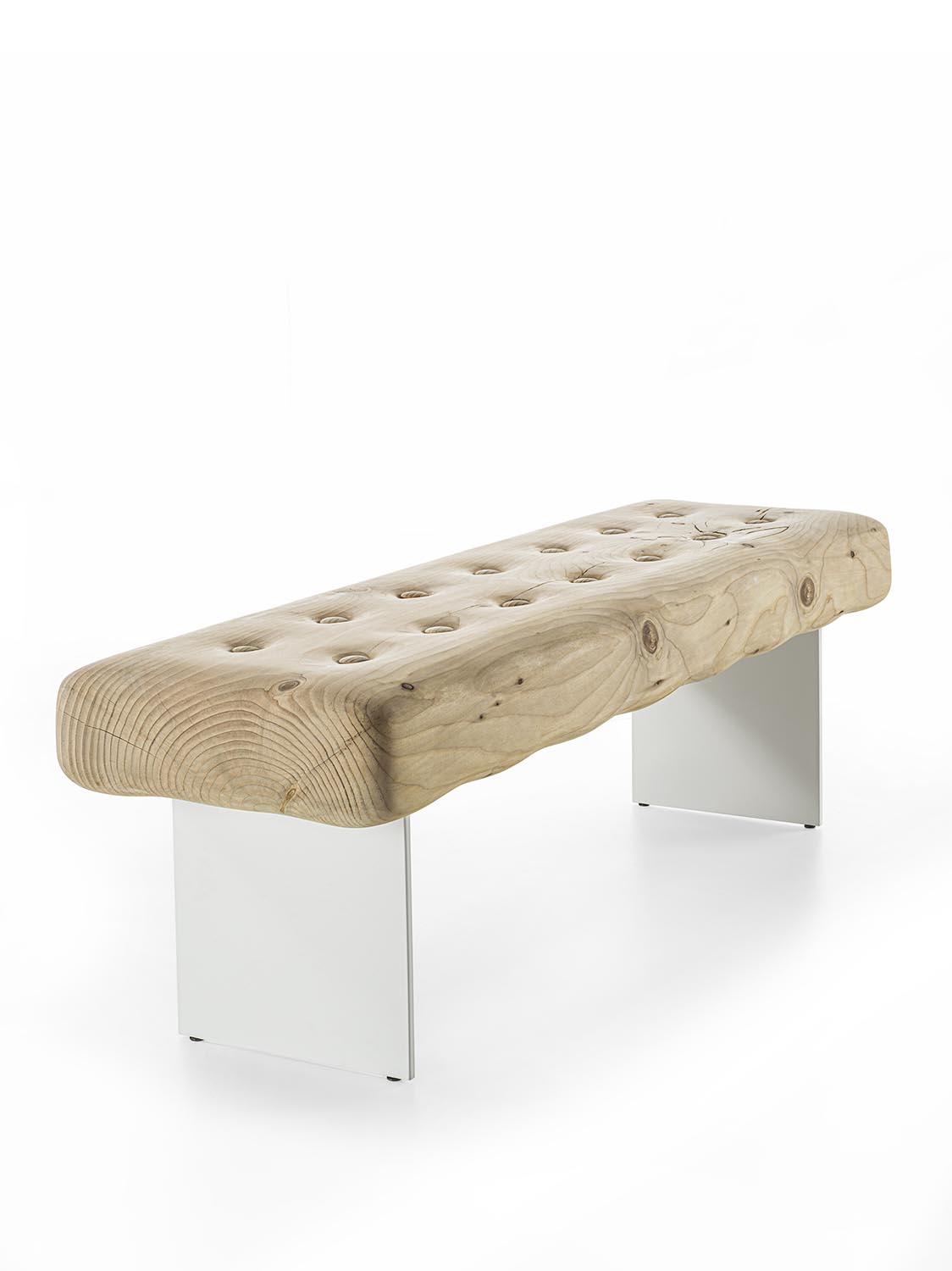 长凳由整块实心香雪松木雕刻而成,座面造型灵感源自床垫的外形,与床垫的柔软印象形成对比,同时依然提供出色的舒适度。长椅装饰有香柏木纽扣,并配有玻璃或铁制的支腿。