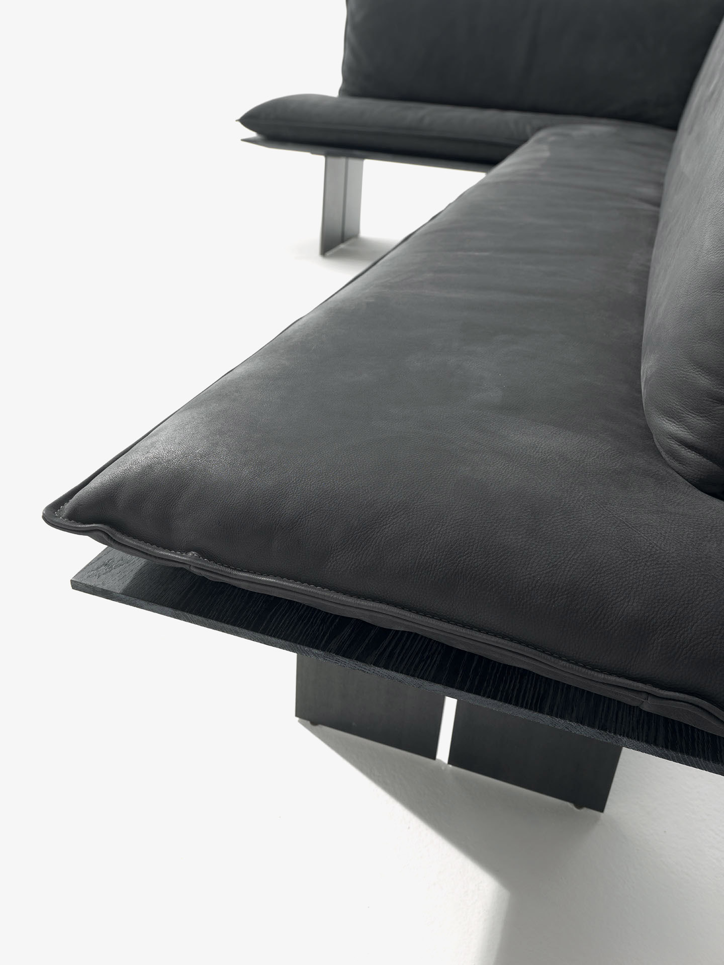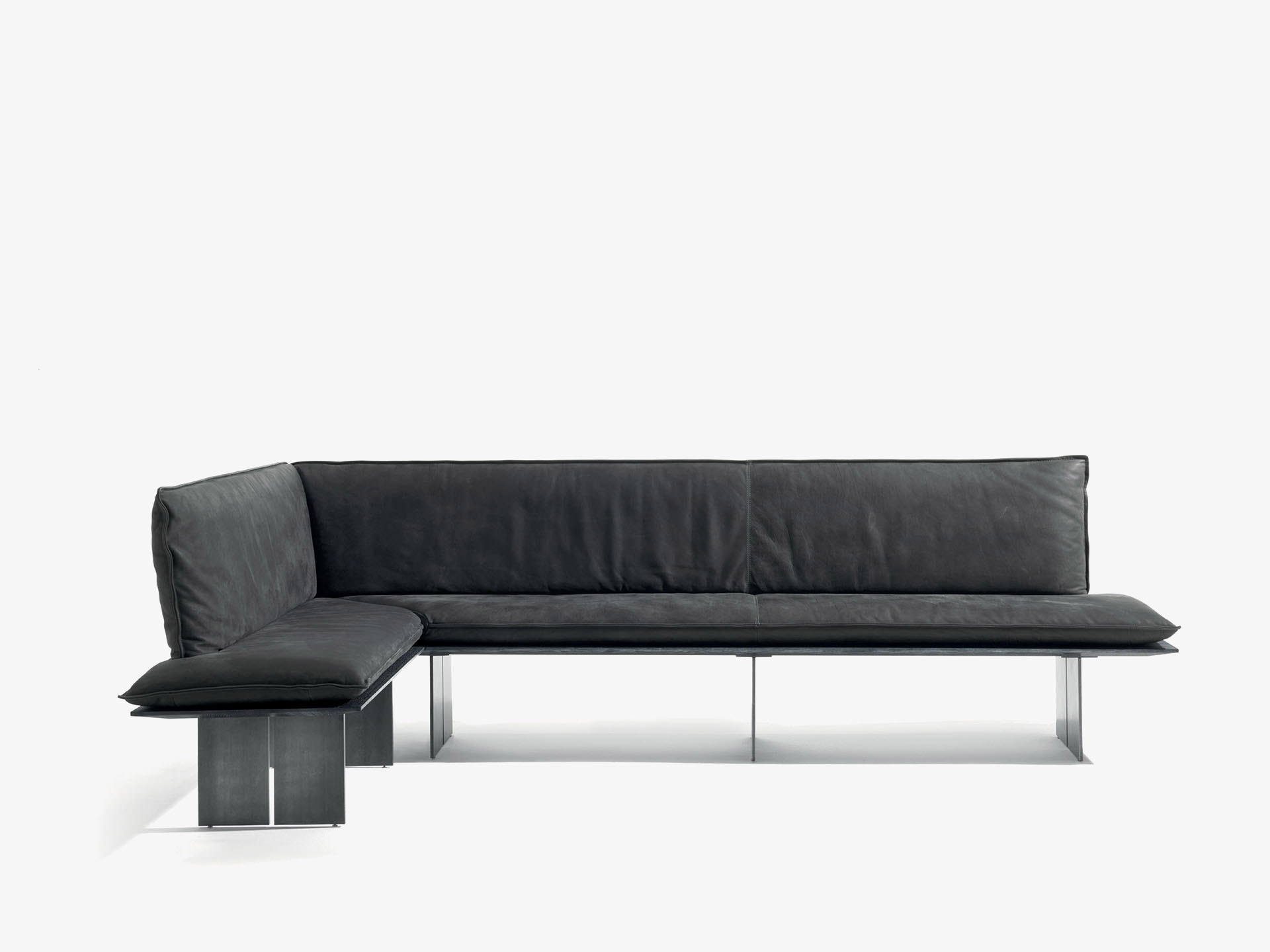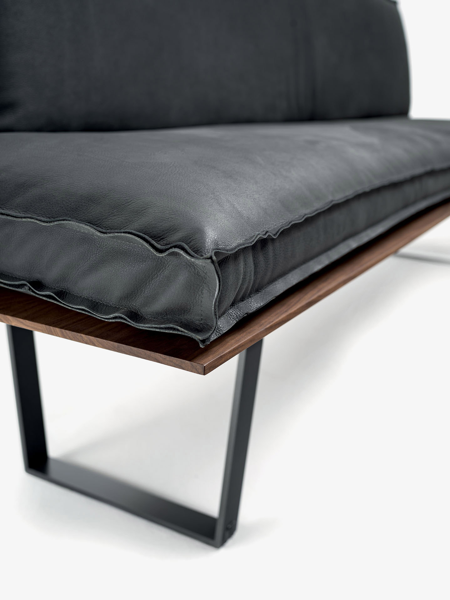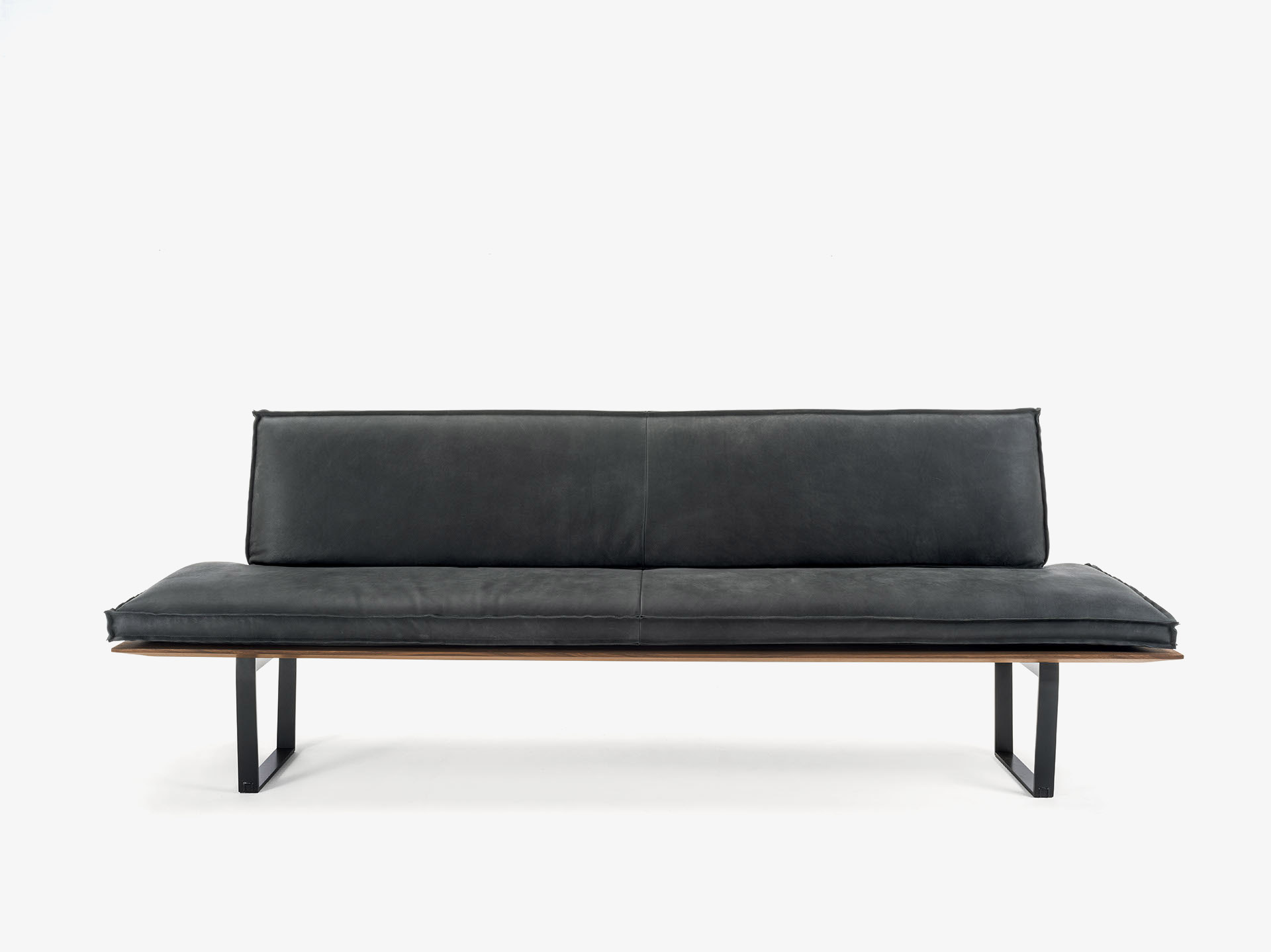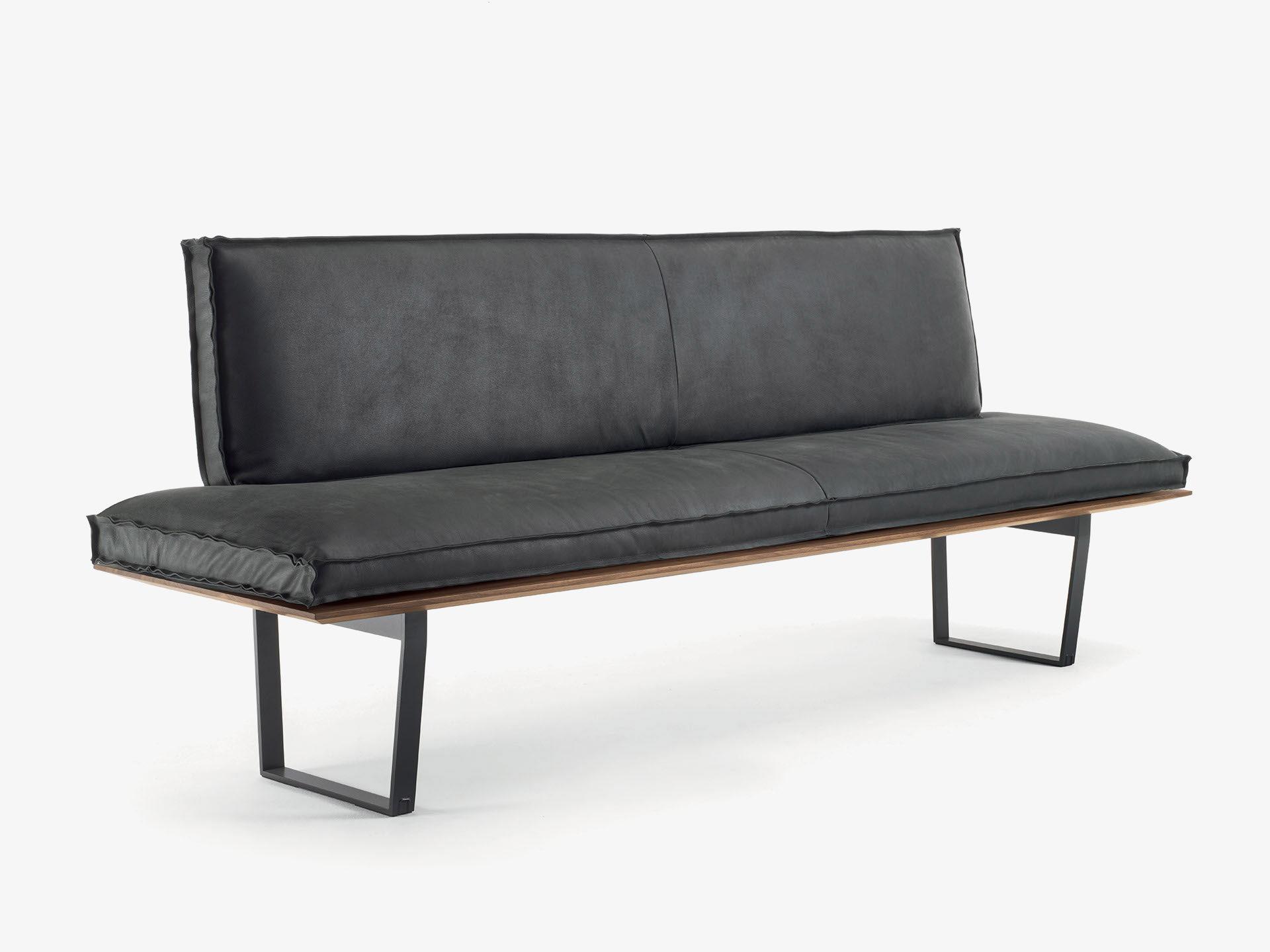 长凳座位面板以实木木板胶粘拼接制成,带铁制凳腿。座位和靠背配有超长的皮革或织物软垫,带裸露缝线,有两种款式可选。长凳提供直线款和转角款两种版本。
