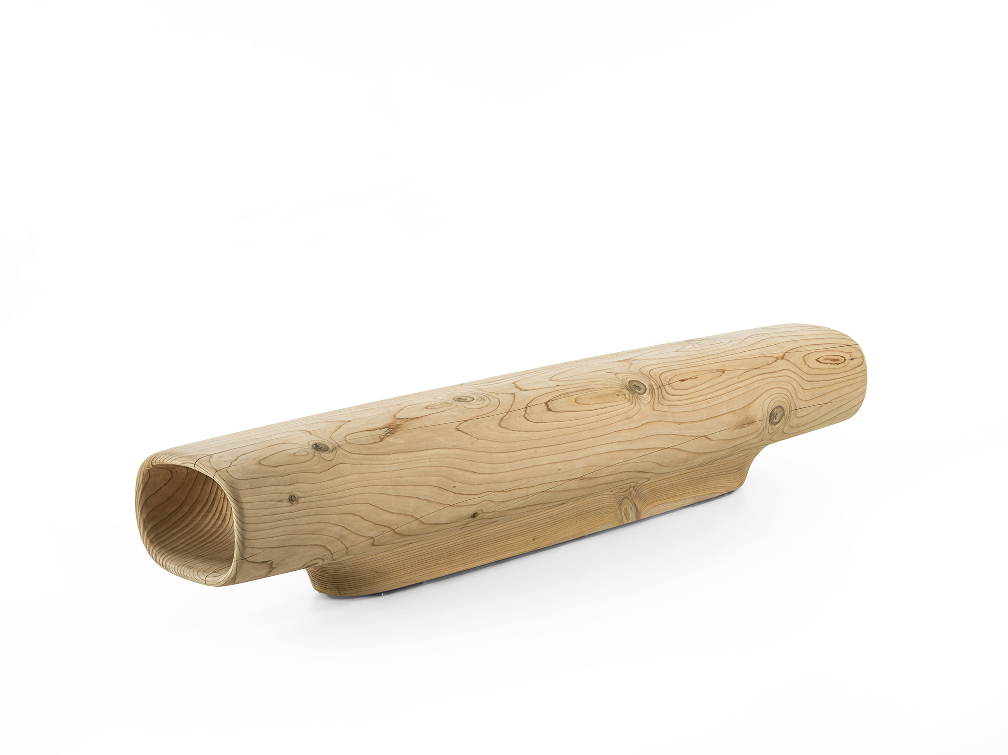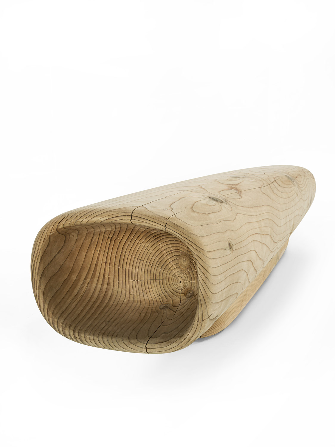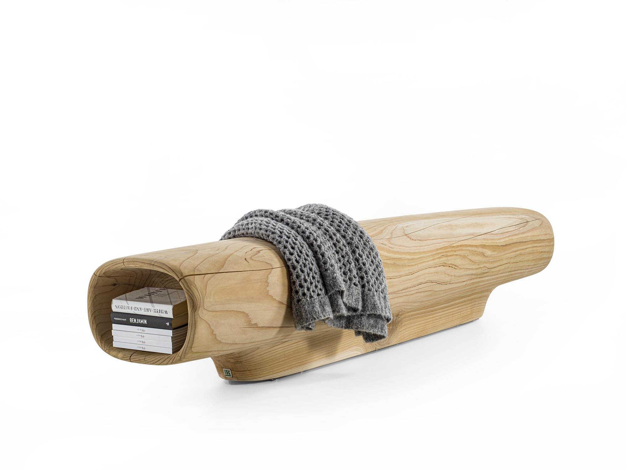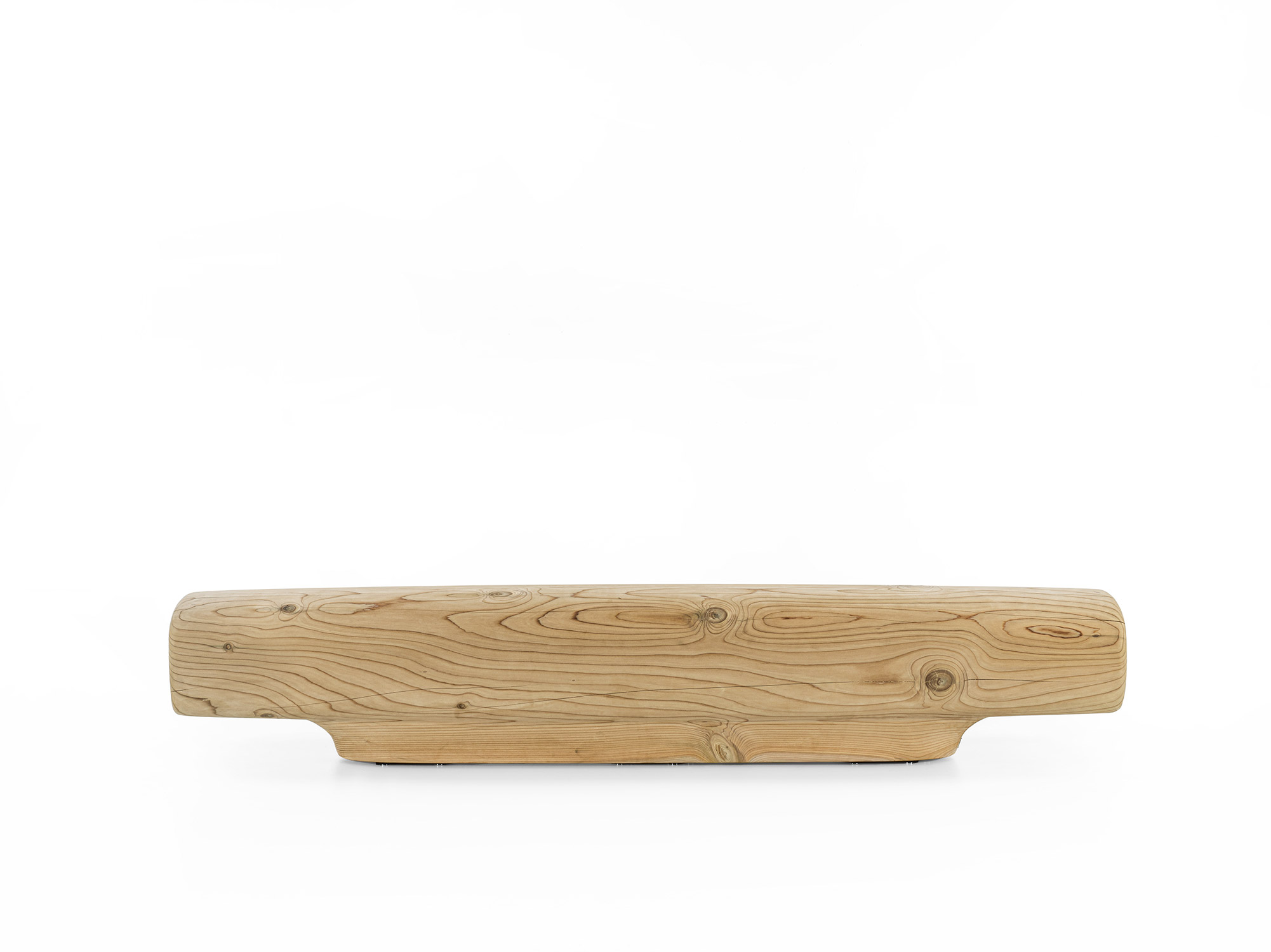 采用整块芳香雪松实木制成的长凳,造型修长笔直,宛如平衡木般的形态。这款长凳的结构在两端开有宽大的内嵌格,可作为储物空间,用于放置书籍、杂志或纺织品配件,从而保持座面清爽。底座由同一木块一体延伸而成,略带收分,使长凳从地面撑起,两端形成悬挑,既突显视觉上的轻盈感,又确保坚固与稳定。