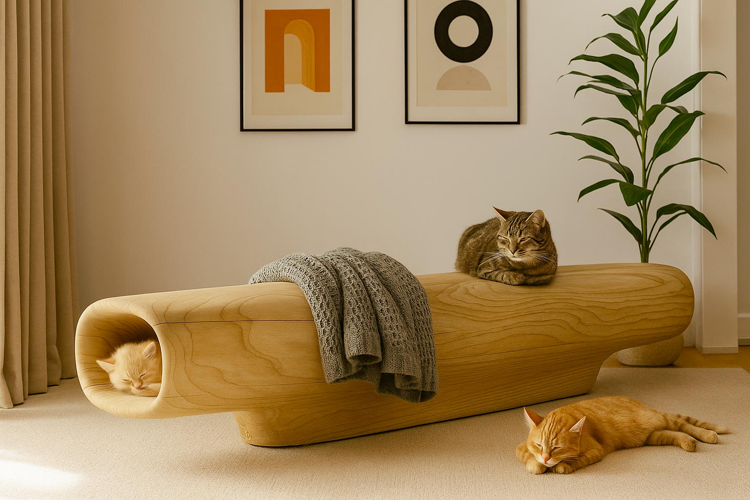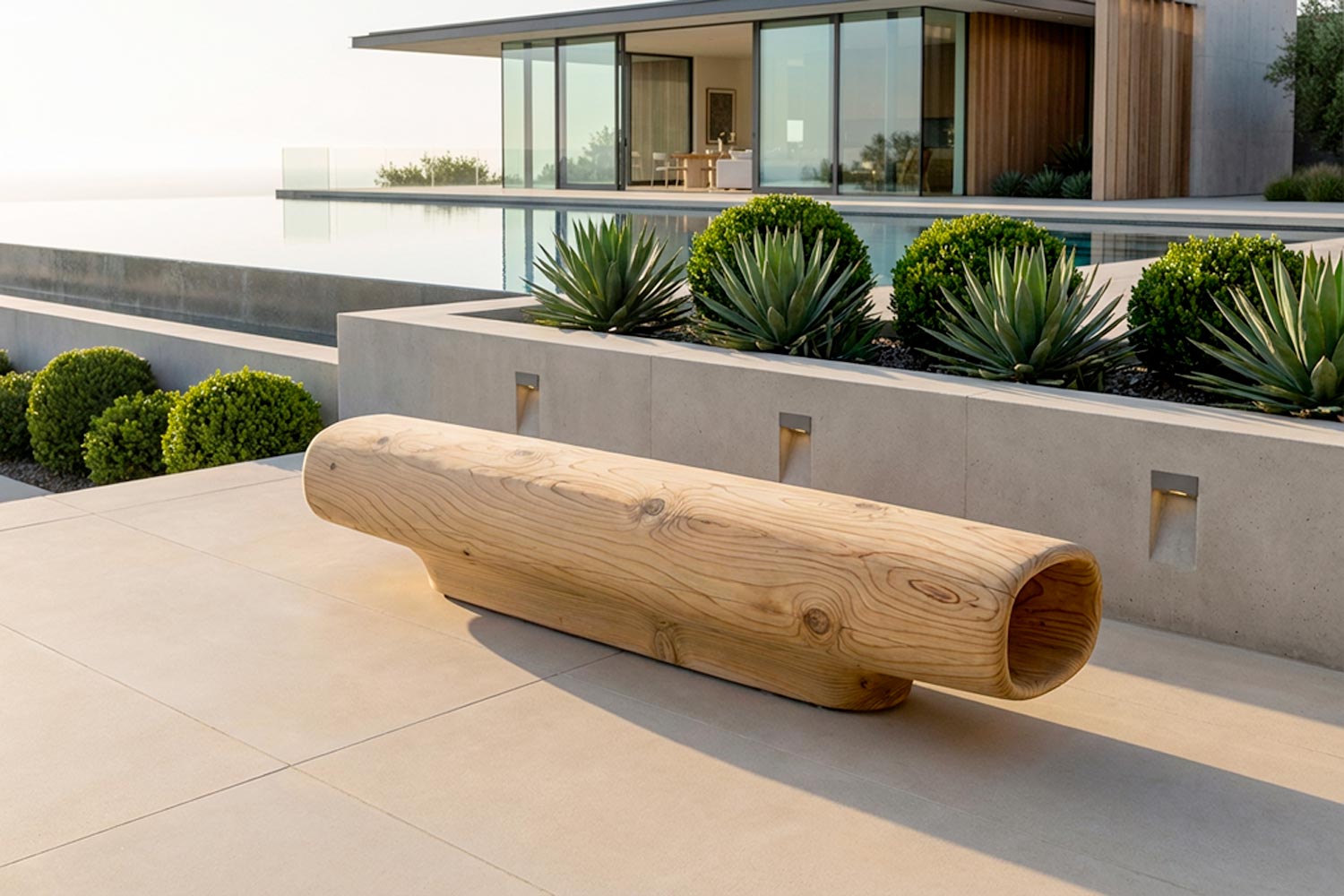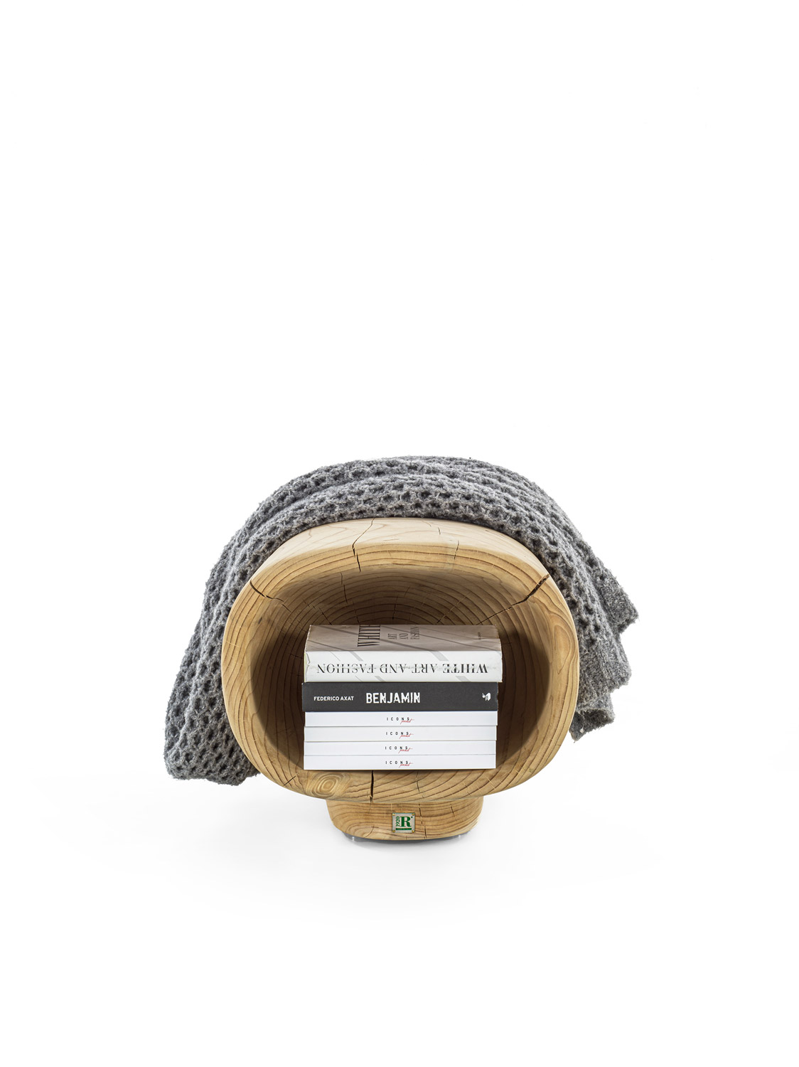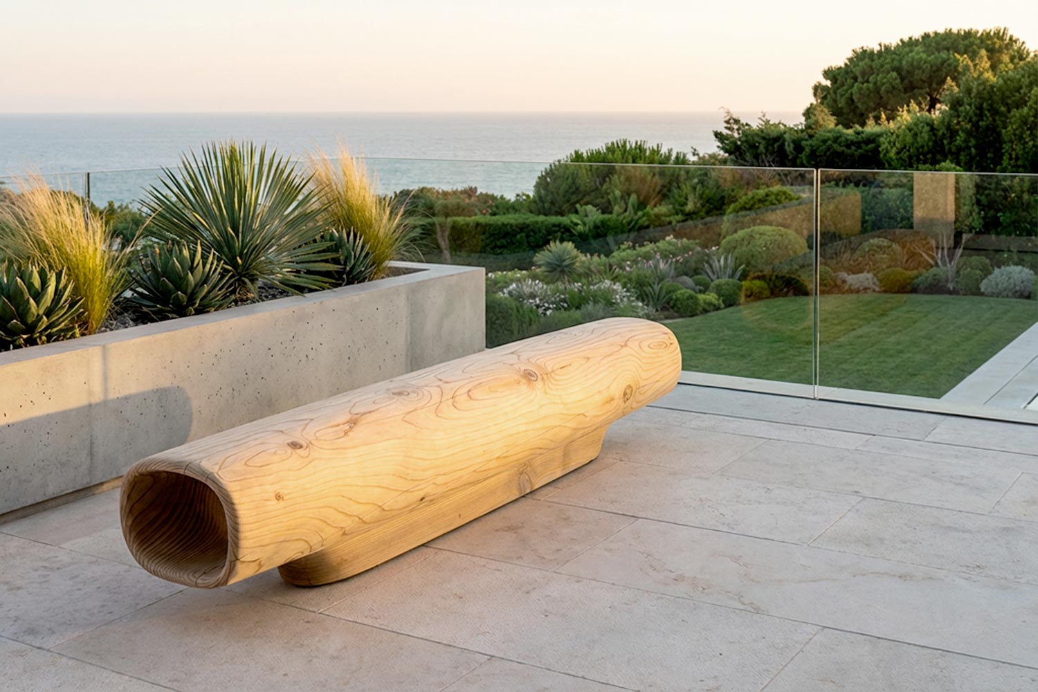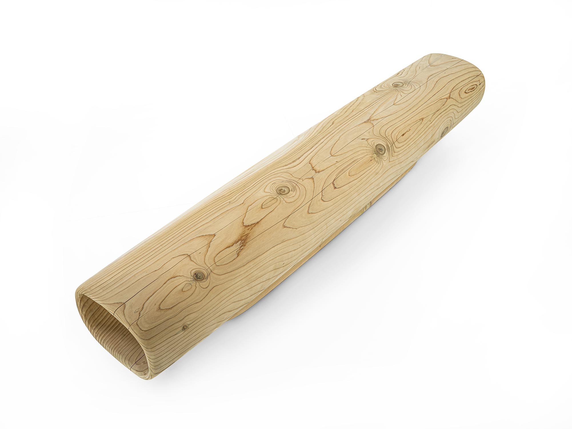 采用整块芳香雪松实木制成的长凳,造型修长笔直,宛如平衡木般的形态。这款长凳的结构在两端开有宽大的内嵌格,可作为储物空间,用于放置书籍、杂志或纺织品配件,从而保持座面清爽。底座由同一木块一体延伸而成,略带收分,使长凳从地面撑起,两端形成悬挑,既突显视觉上的轻盈感,又确保坚固与稳定。